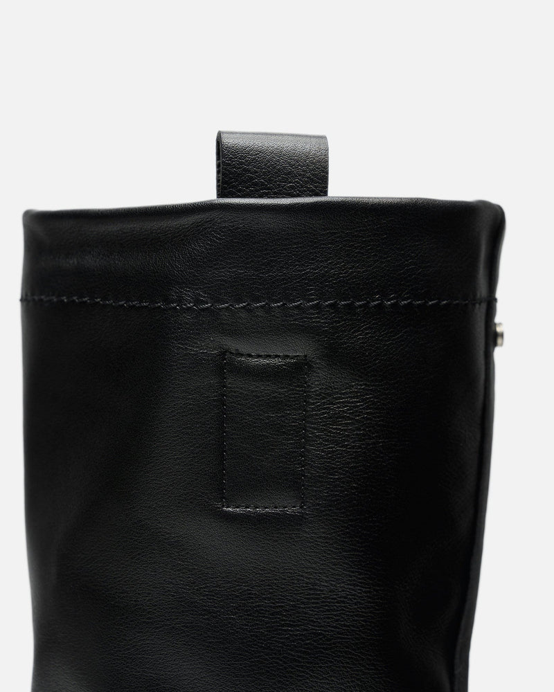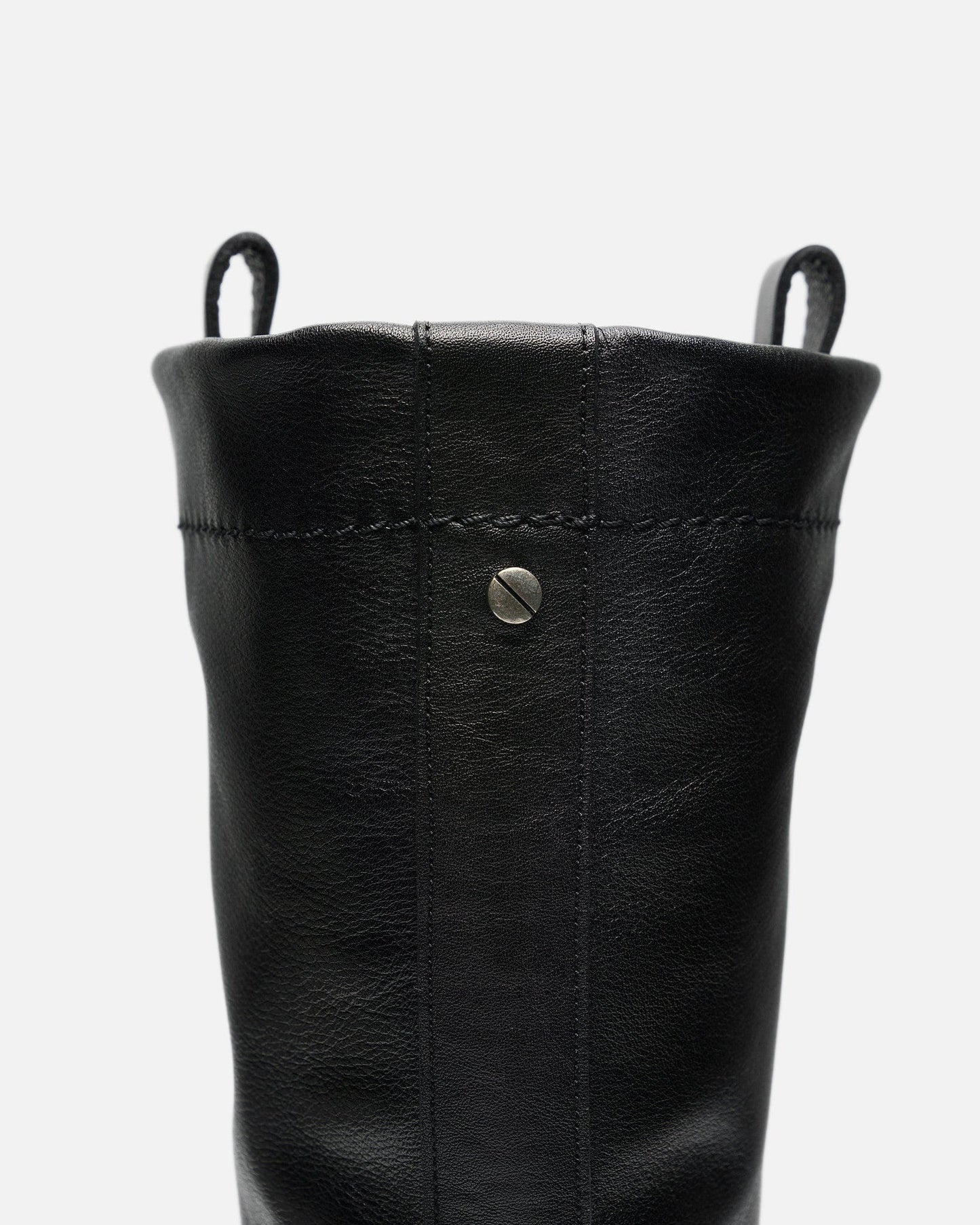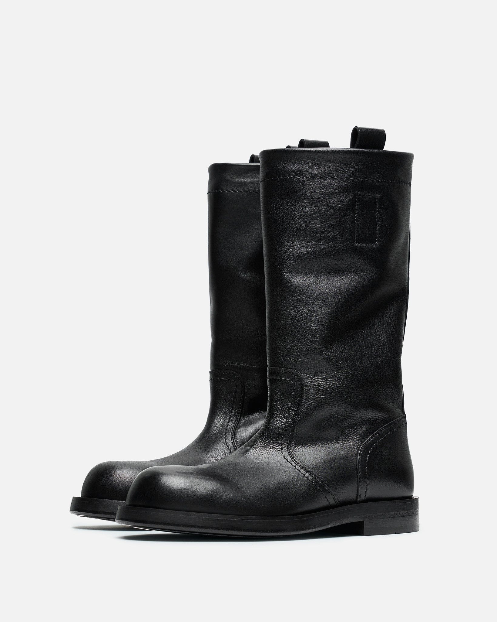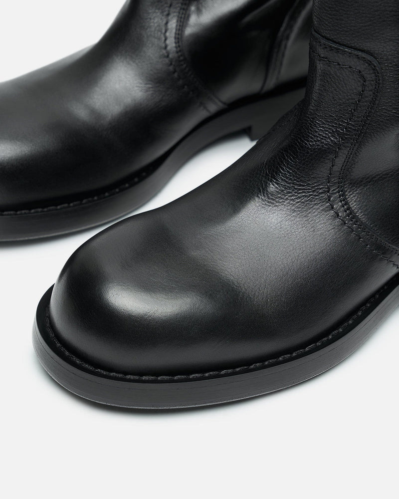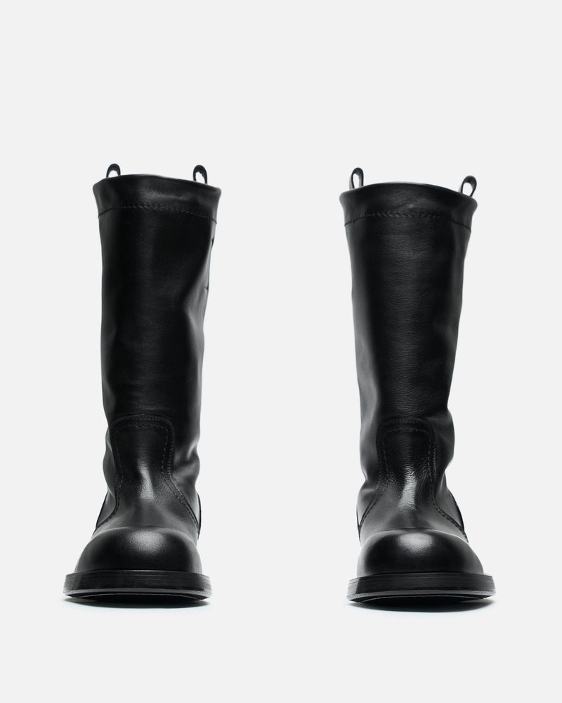Ann Demeulemeester Bente Boots in Black. These boots are crafted from grained leather and feature pull loops at the collar, rivet detail and the back collar and a stacked leather block heel with rubber injection.