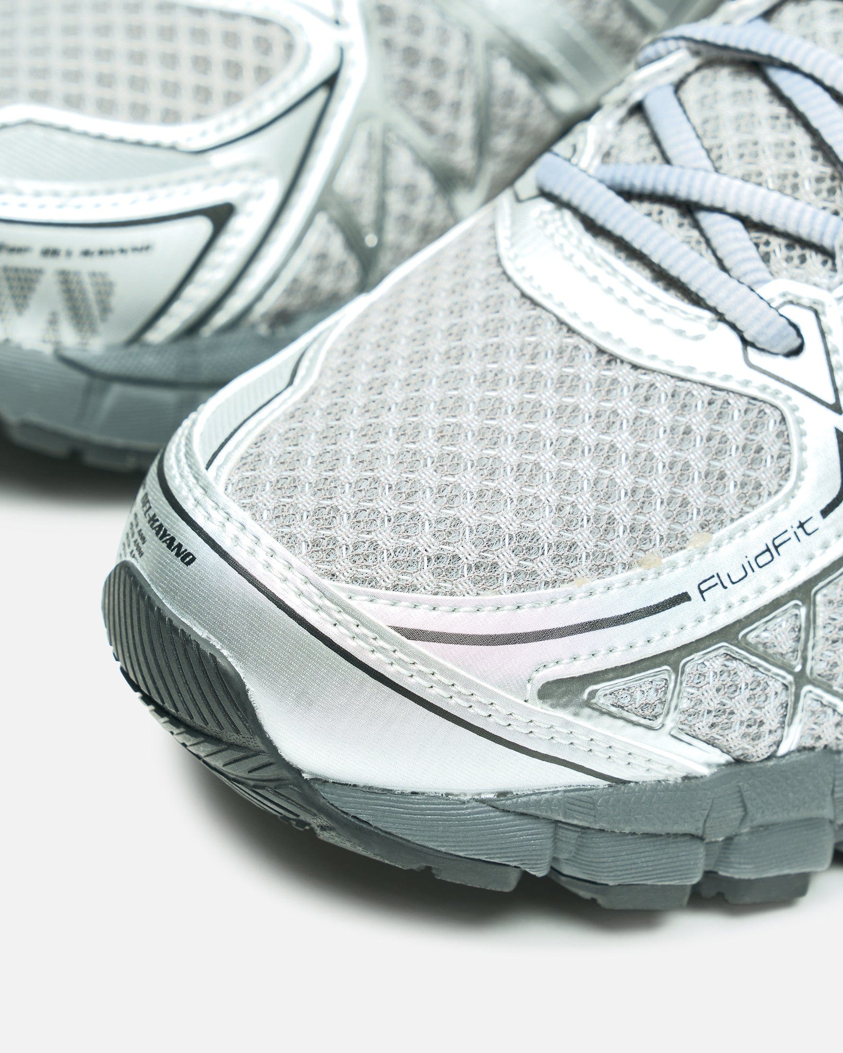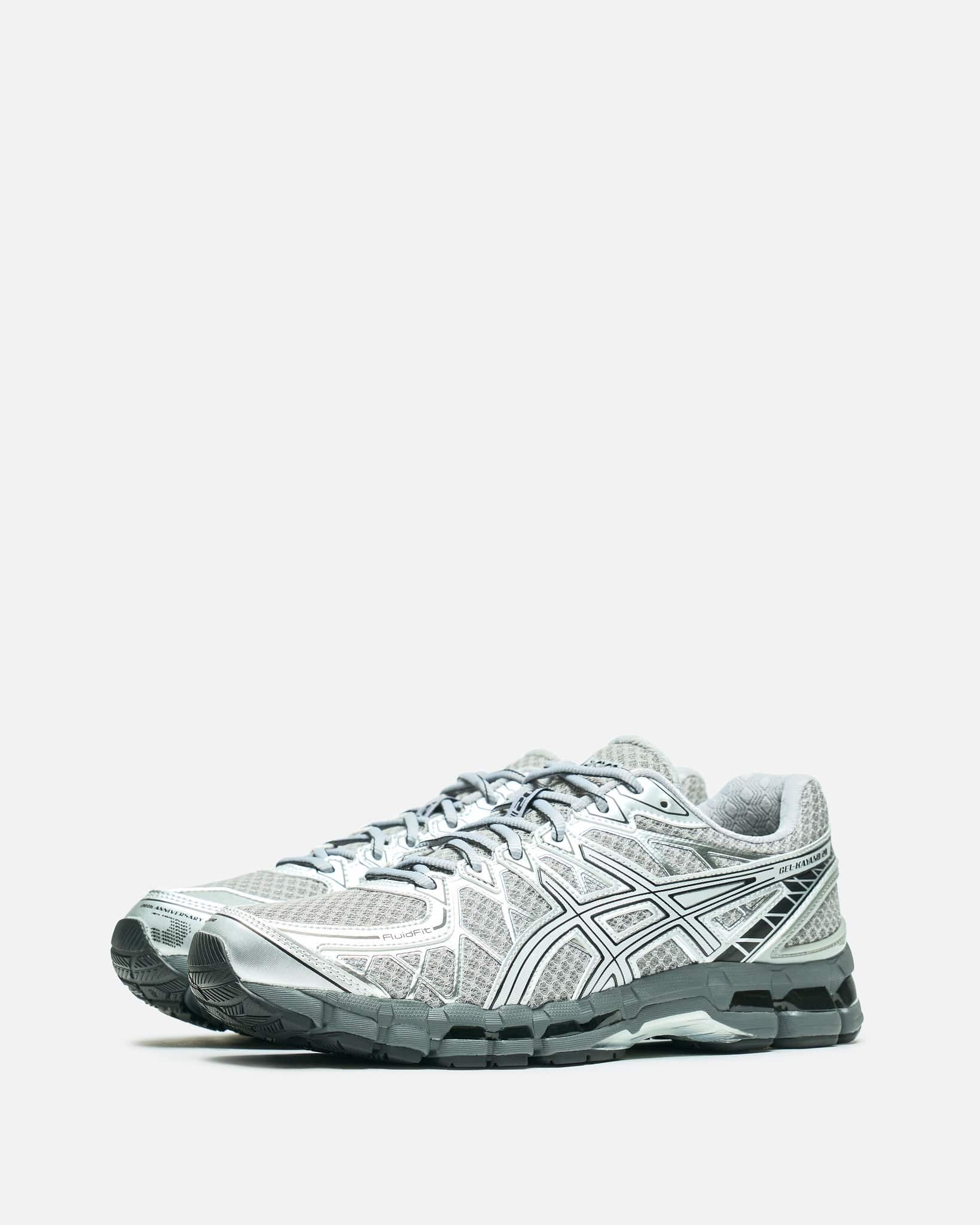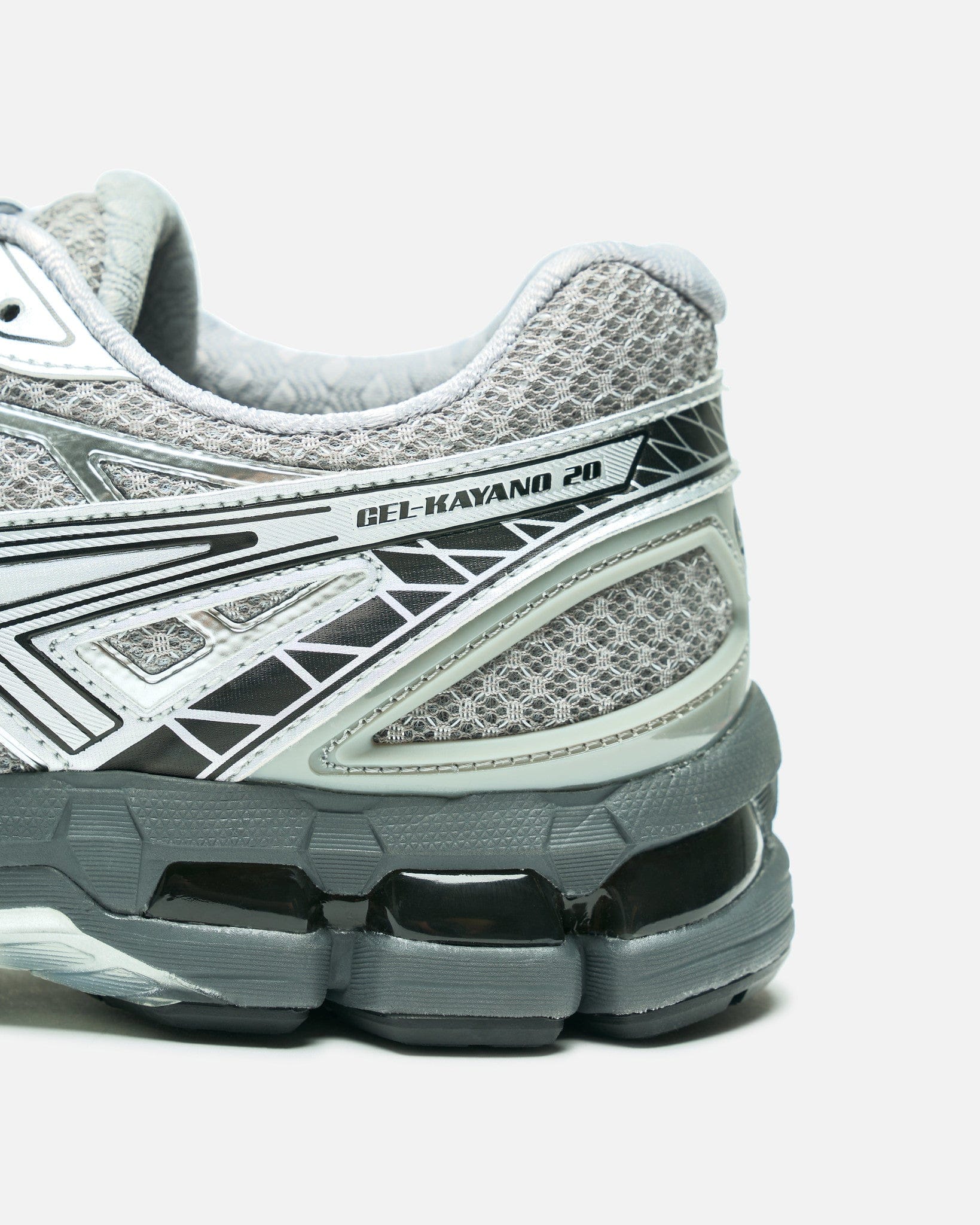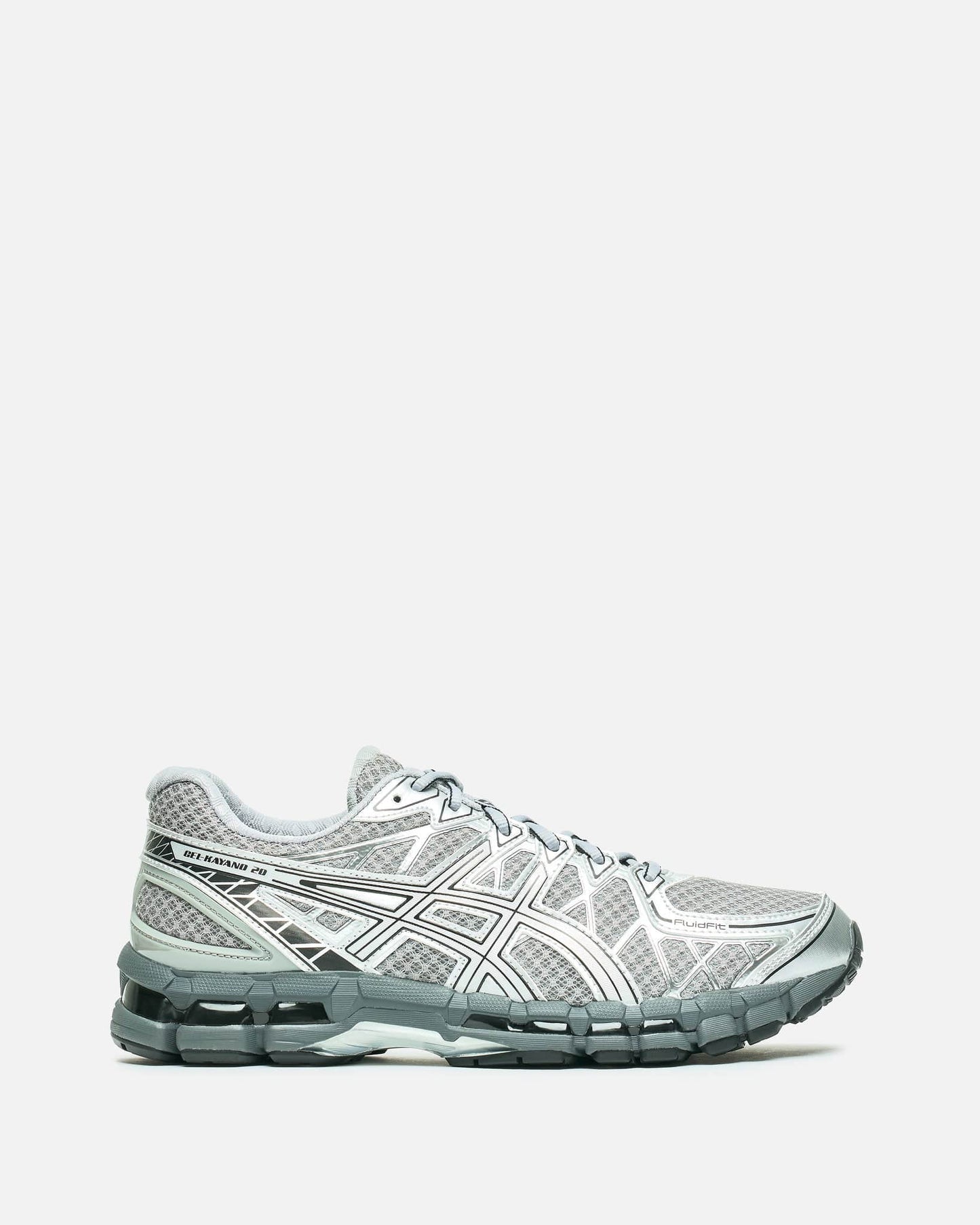 Asics Gel-Kayano 20 in Gravel/Pure Silver. These shoes feature a lace-up closure, FLUIDFIT™ upper that supports a perfect fit, dual GEL® technology inserts at the midsole and a GUIDANCE TRUSSTIC® support system.