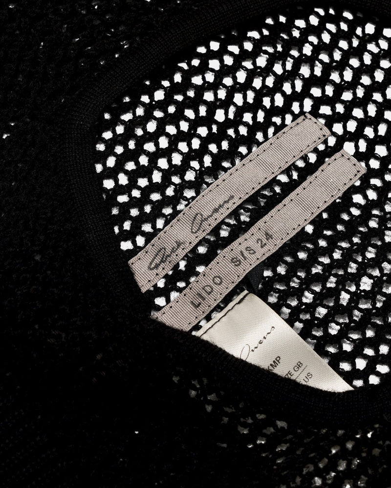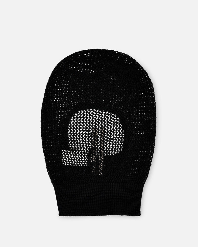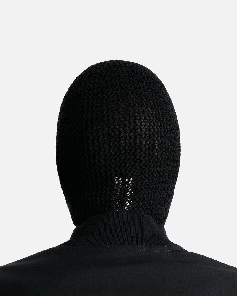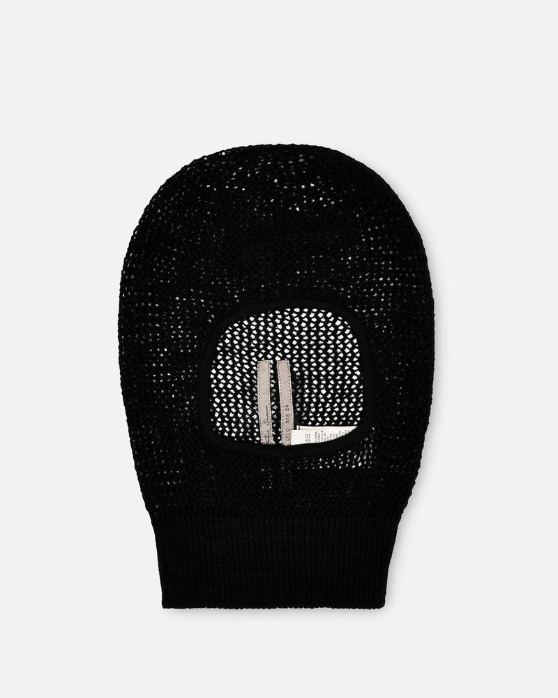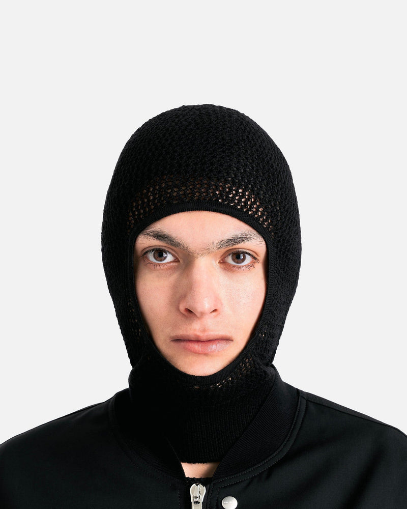 Rick Owens SS24 Lido men's balaclava in black. This knit balaclava features an opening for the face and a ribbed hem.
