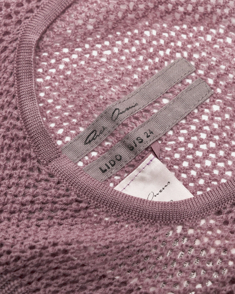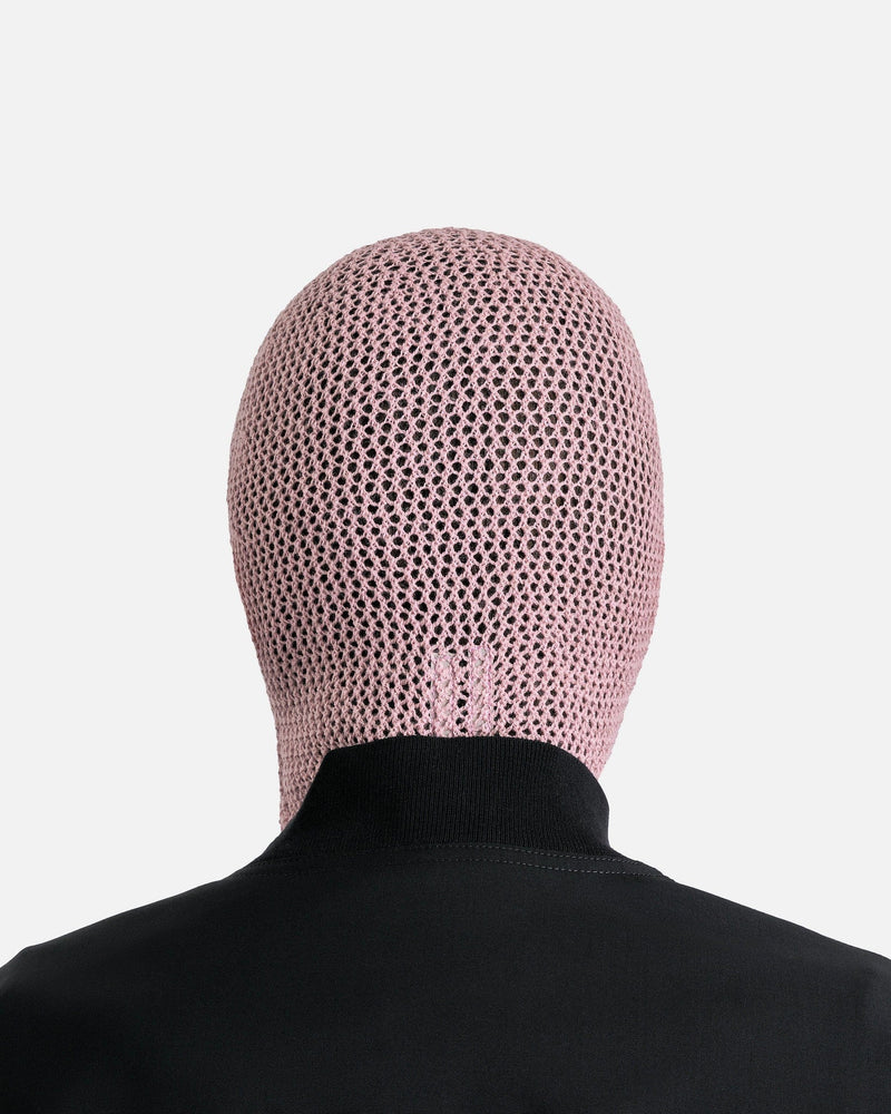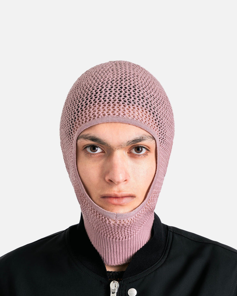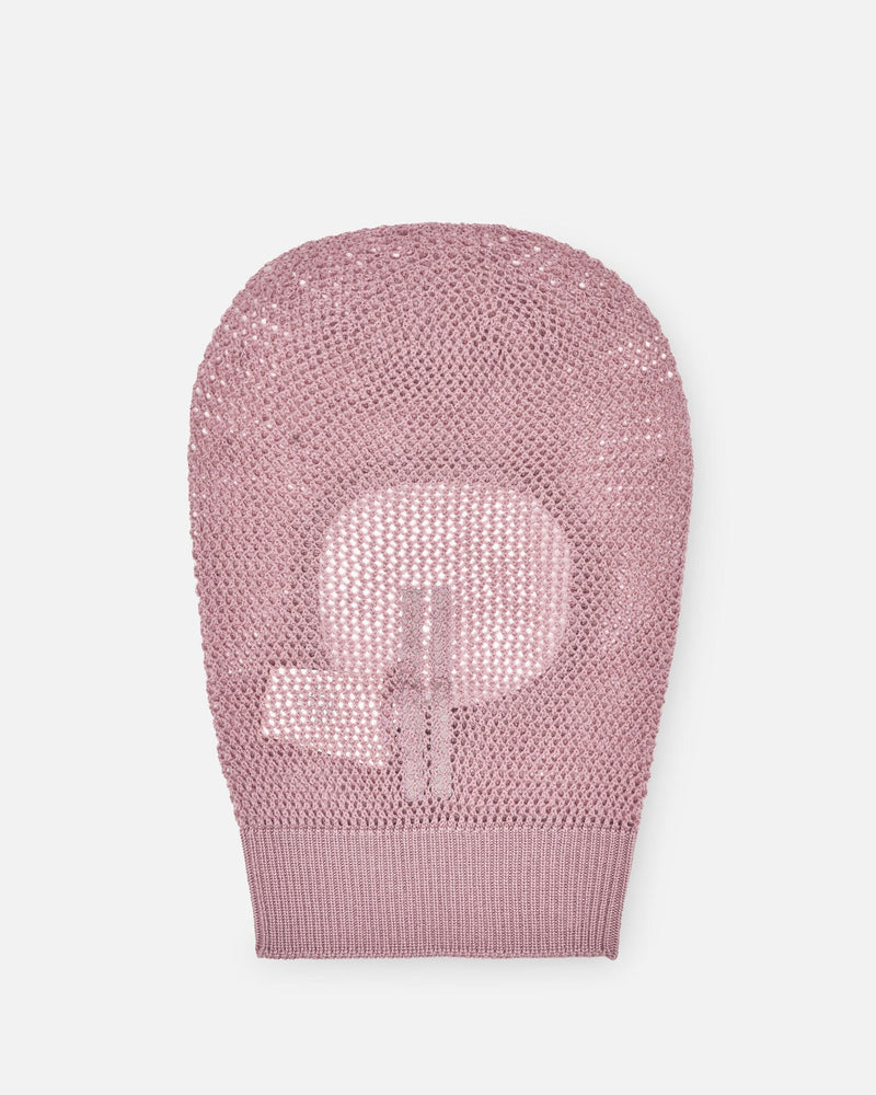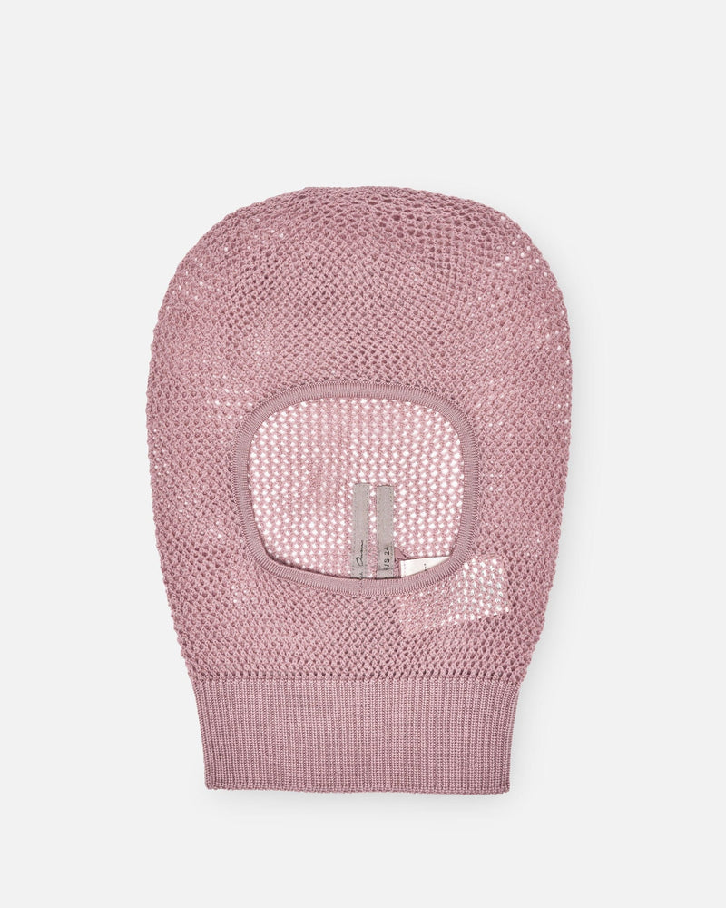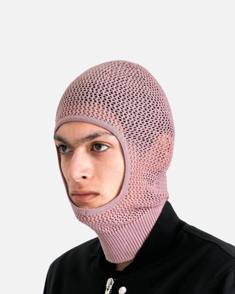 Rick Owens SS24 Lido men's balaclava in light pink. This knit balaclava features an opening for the face and a ribbed hem.