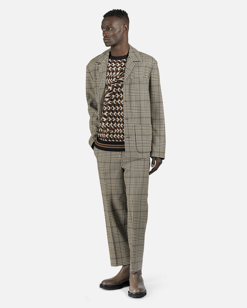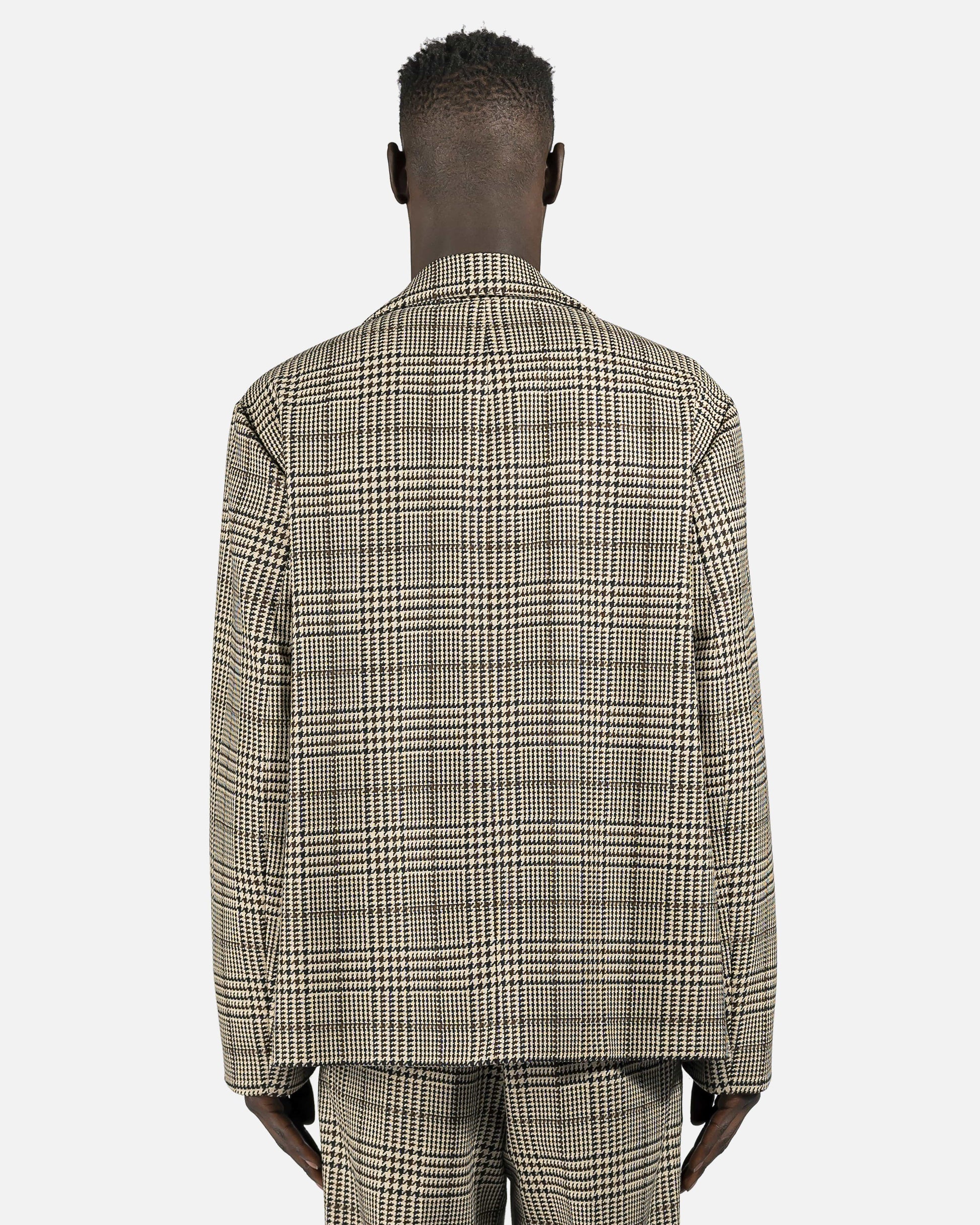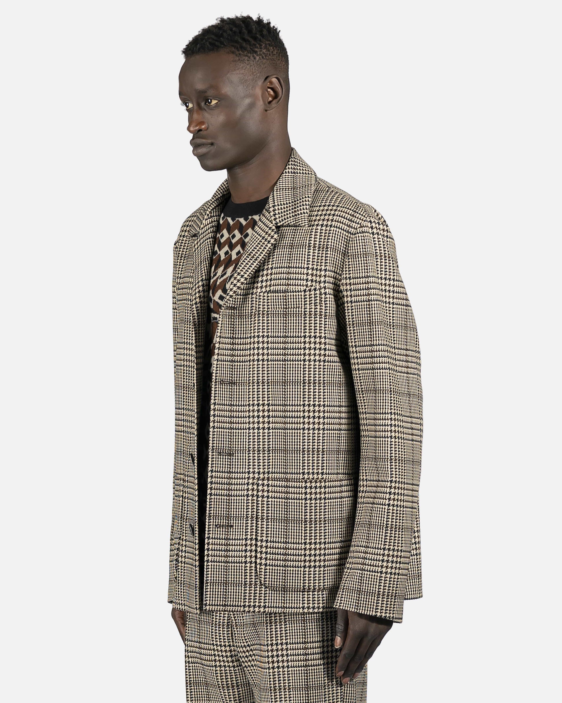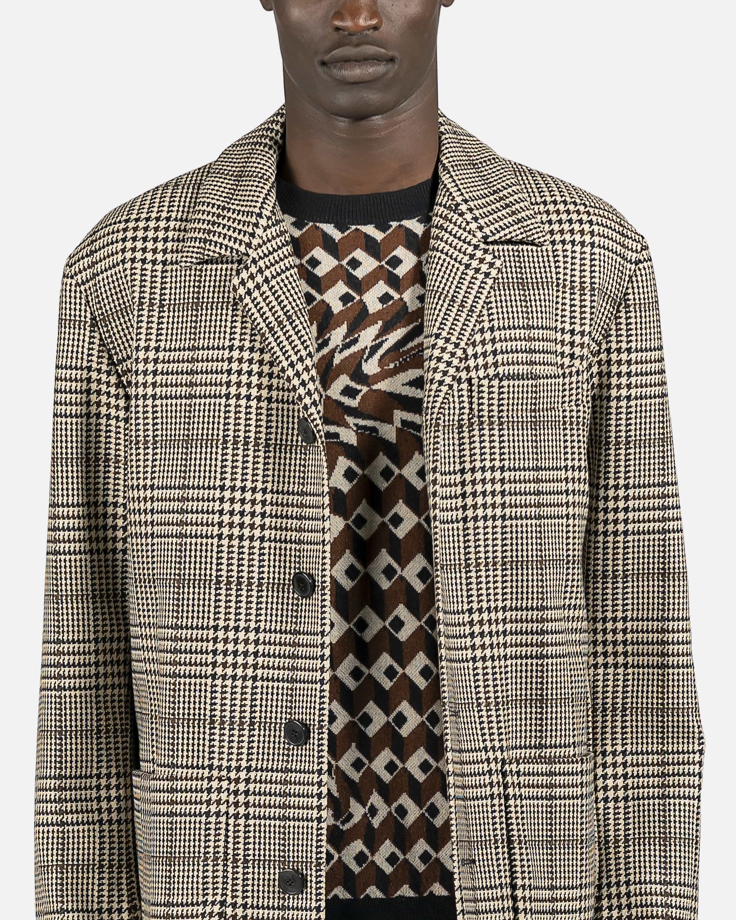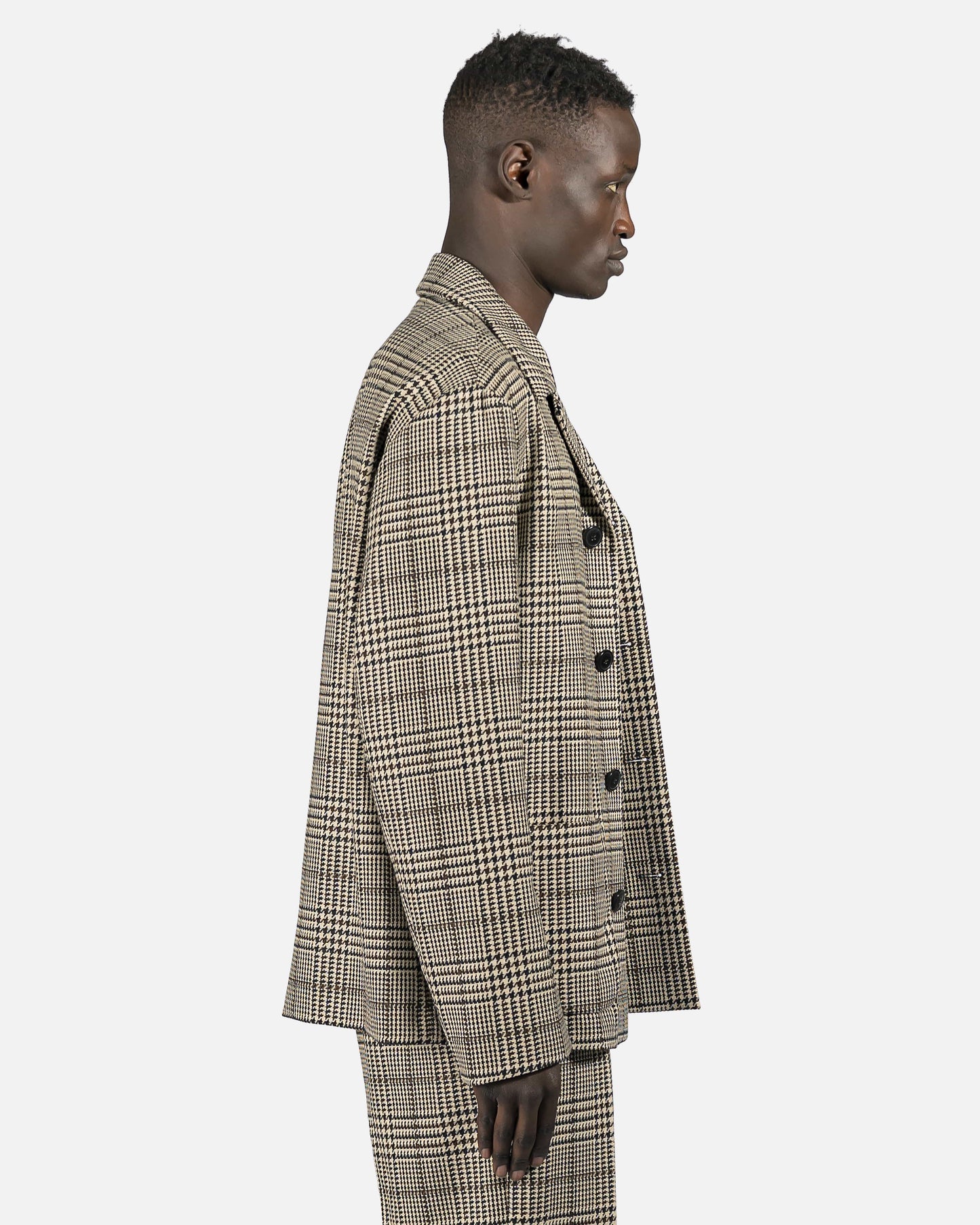 Beige plaid check wool blend chore jacket with small lapel, 4 button closure and 2 front pockets.