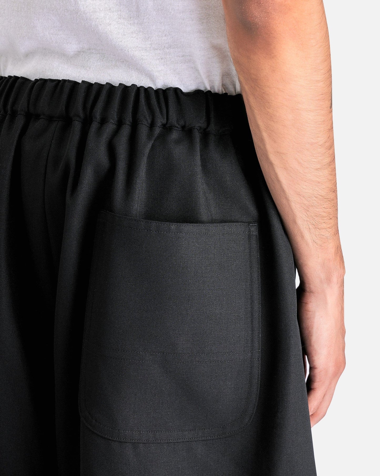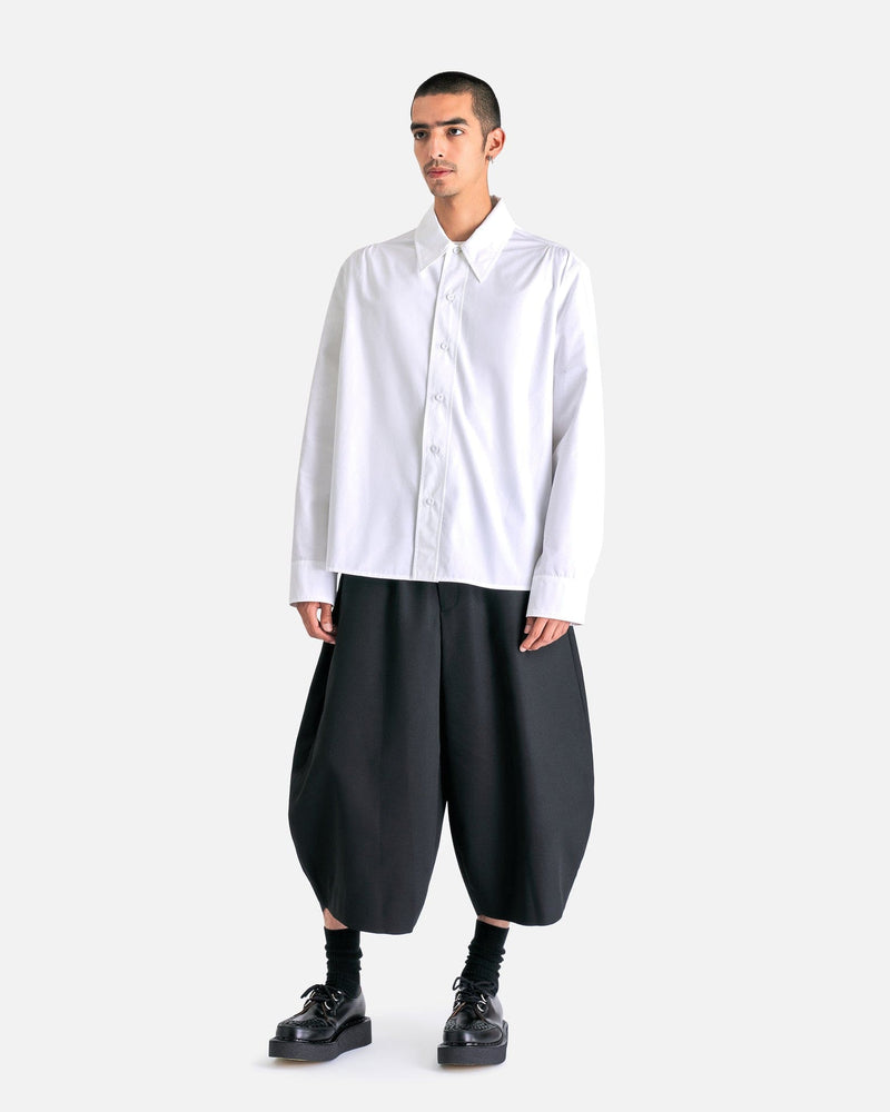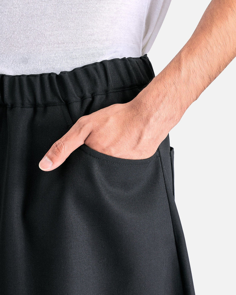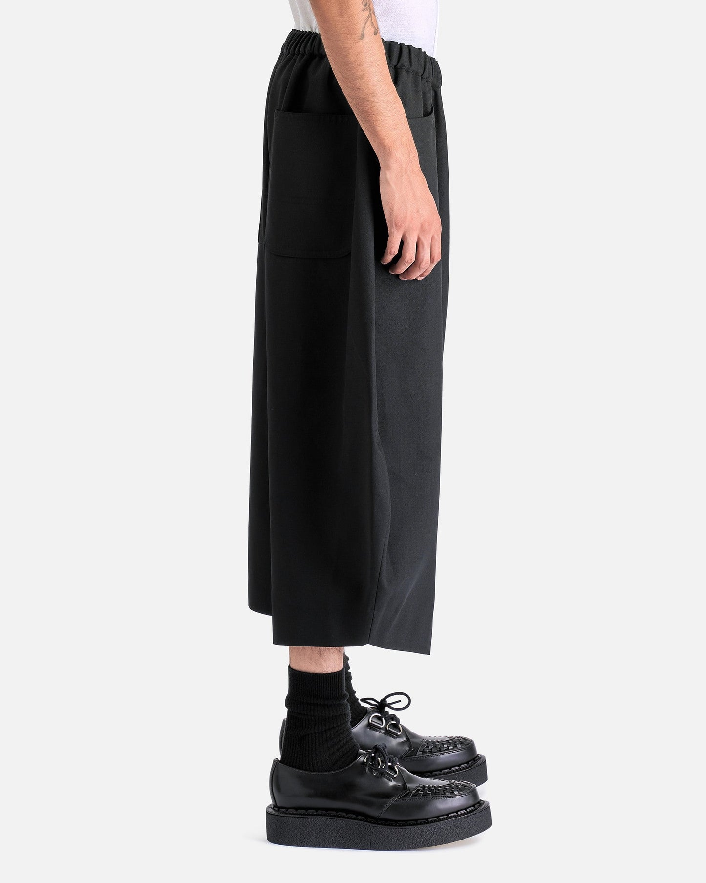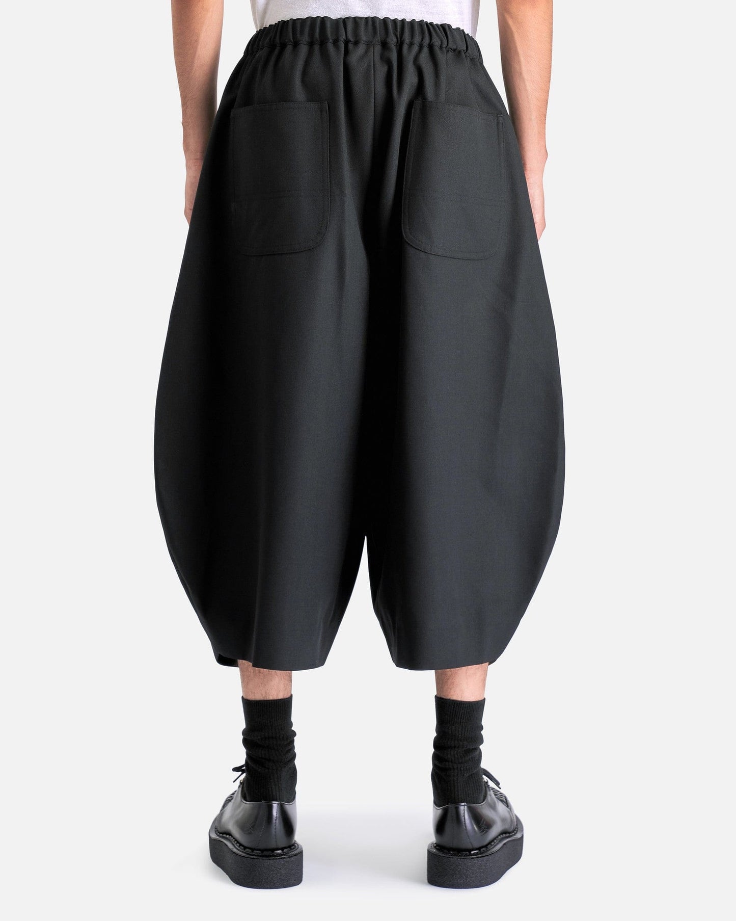 BLACK Comme des Garçons Cropped Wide-Leg Pants in Black. These pants feature an elasticated waist with drawstring, zip fly, 4-pocket styling and bow legged detail.
