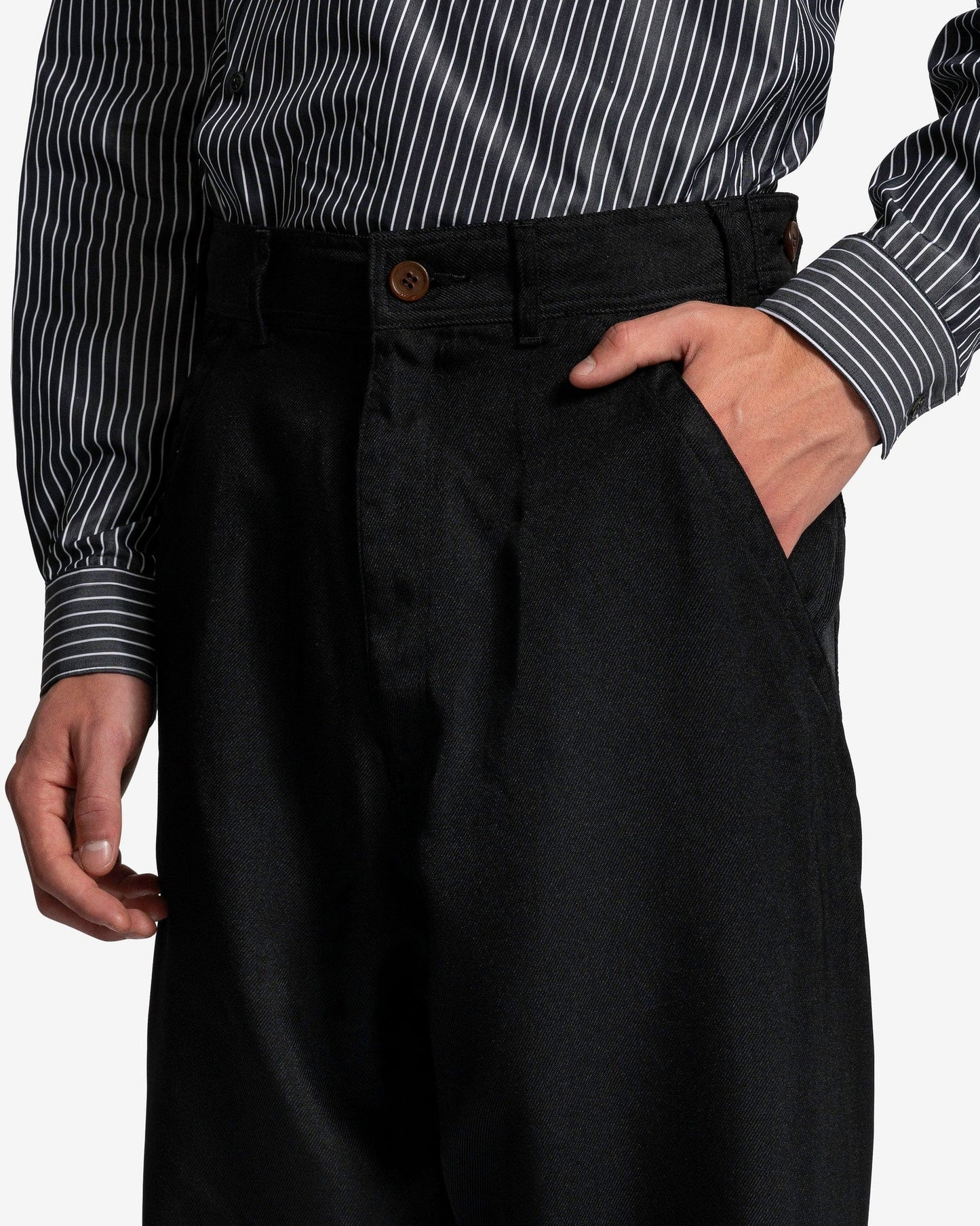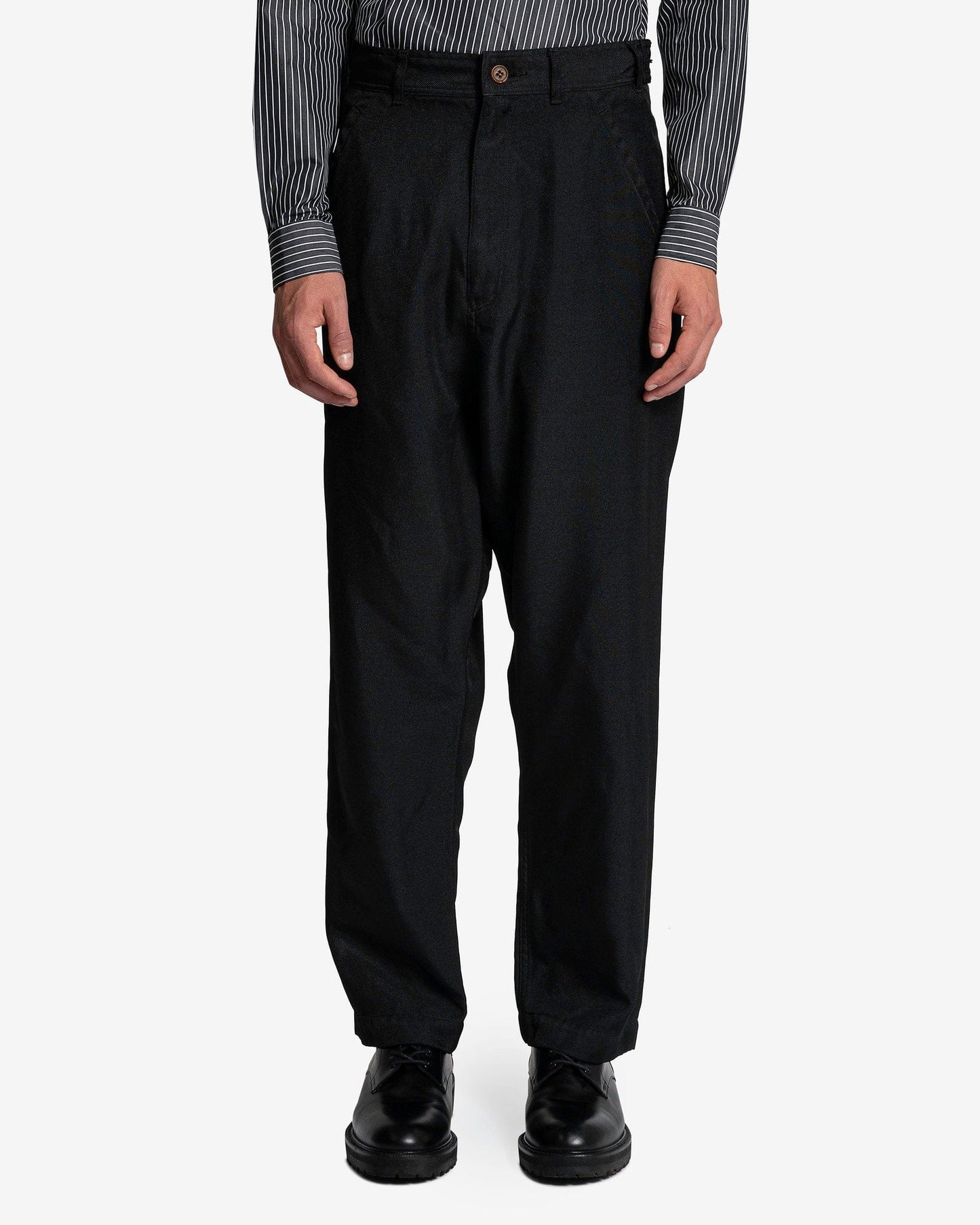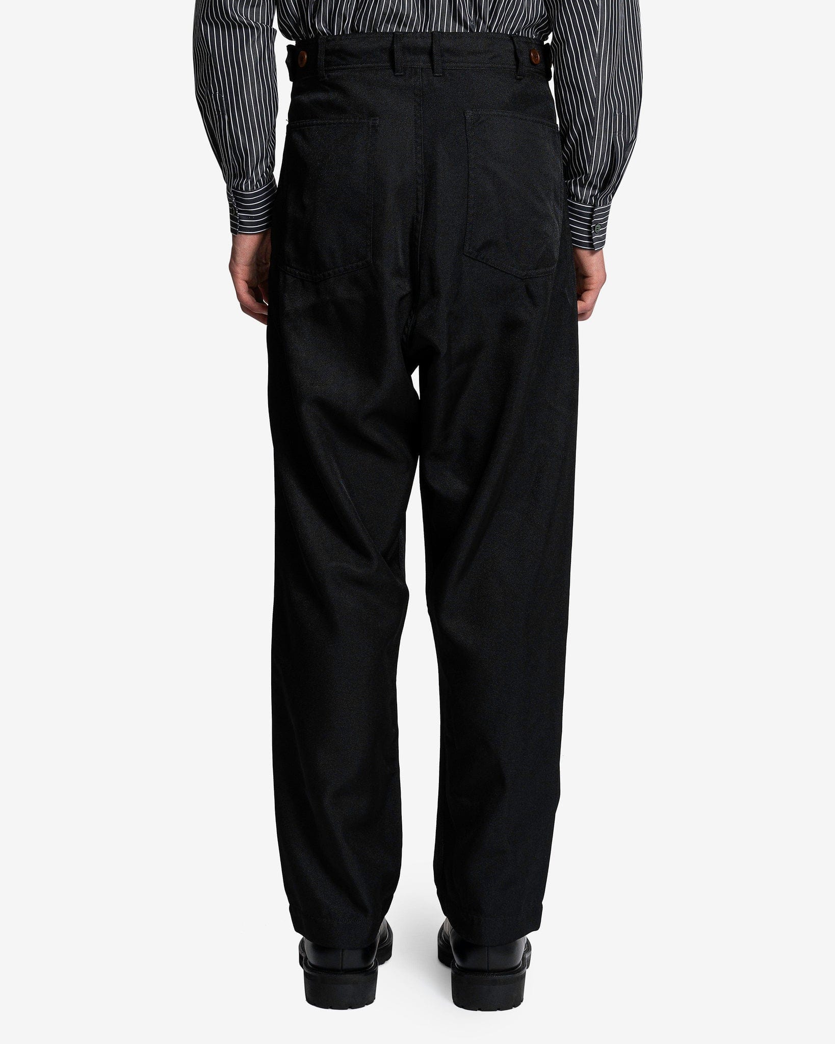 BLACK Comme des Garçons men's twill pants in black. These pants feature front zip closure, side slip pockets and back welt pockets.
