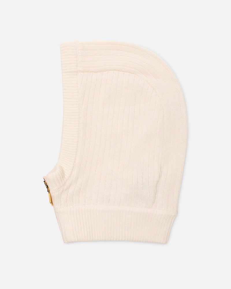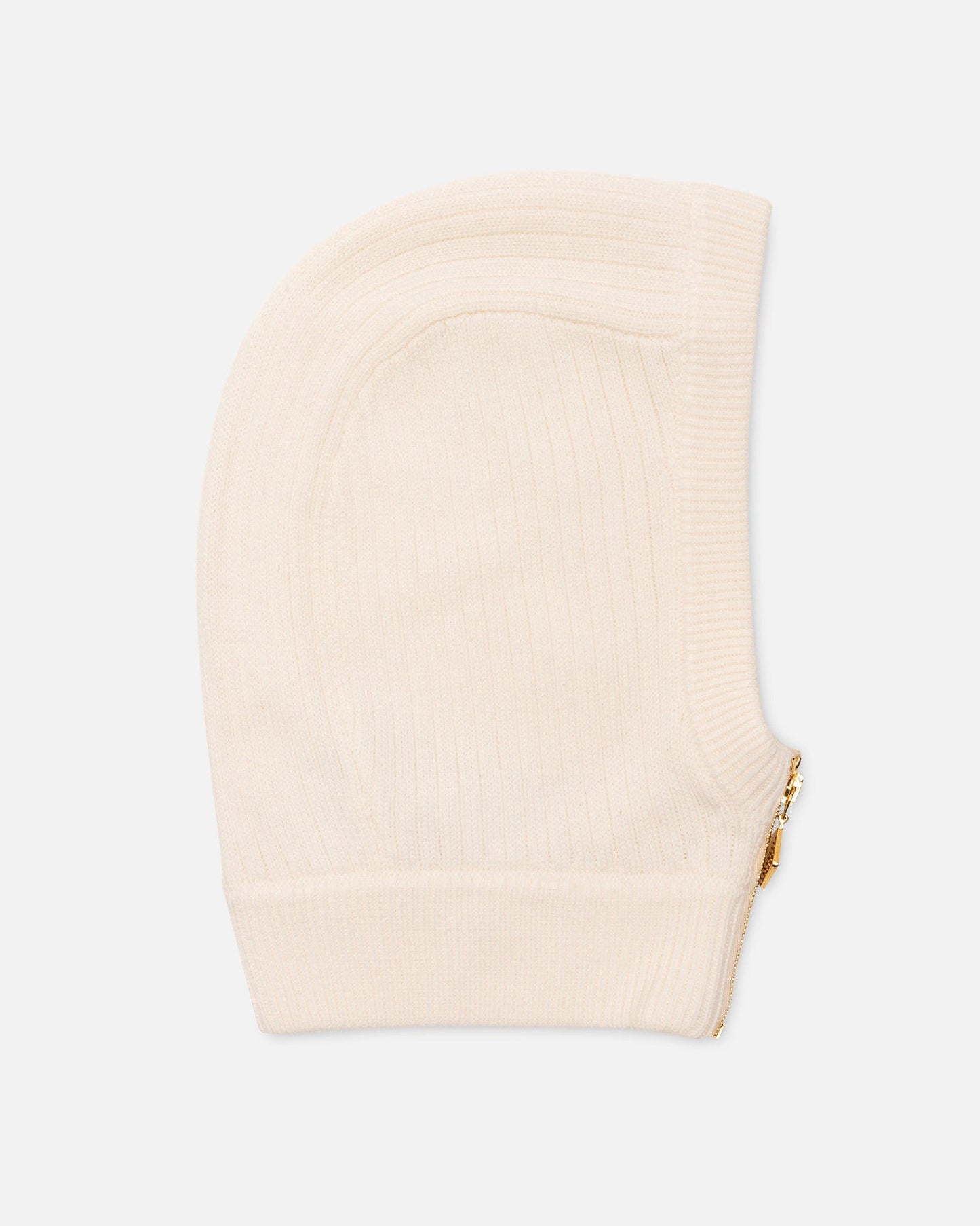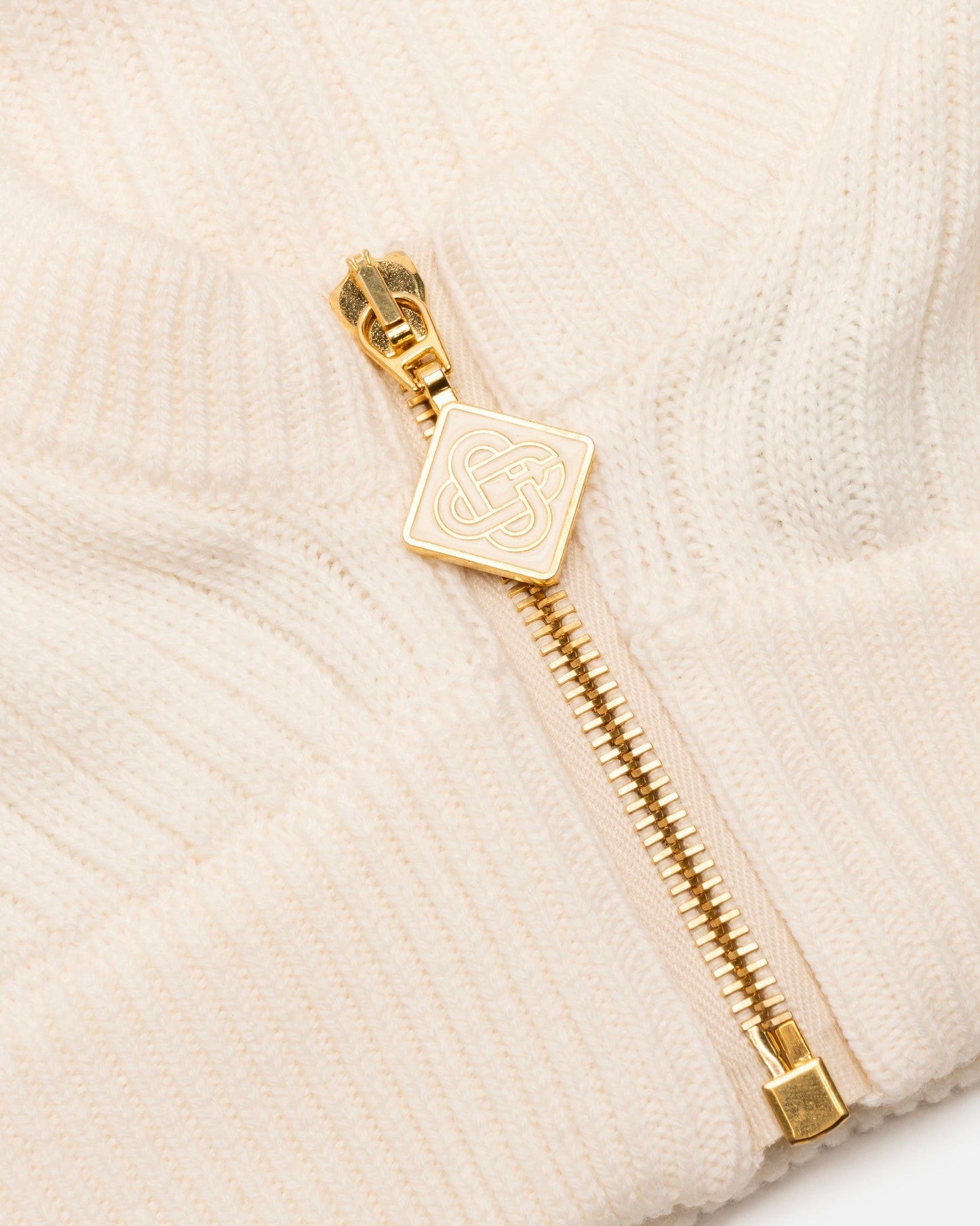 Casablanca cable knit balaclava in off-white. This balaclava features gold tone zipper with a logo zipper pull.