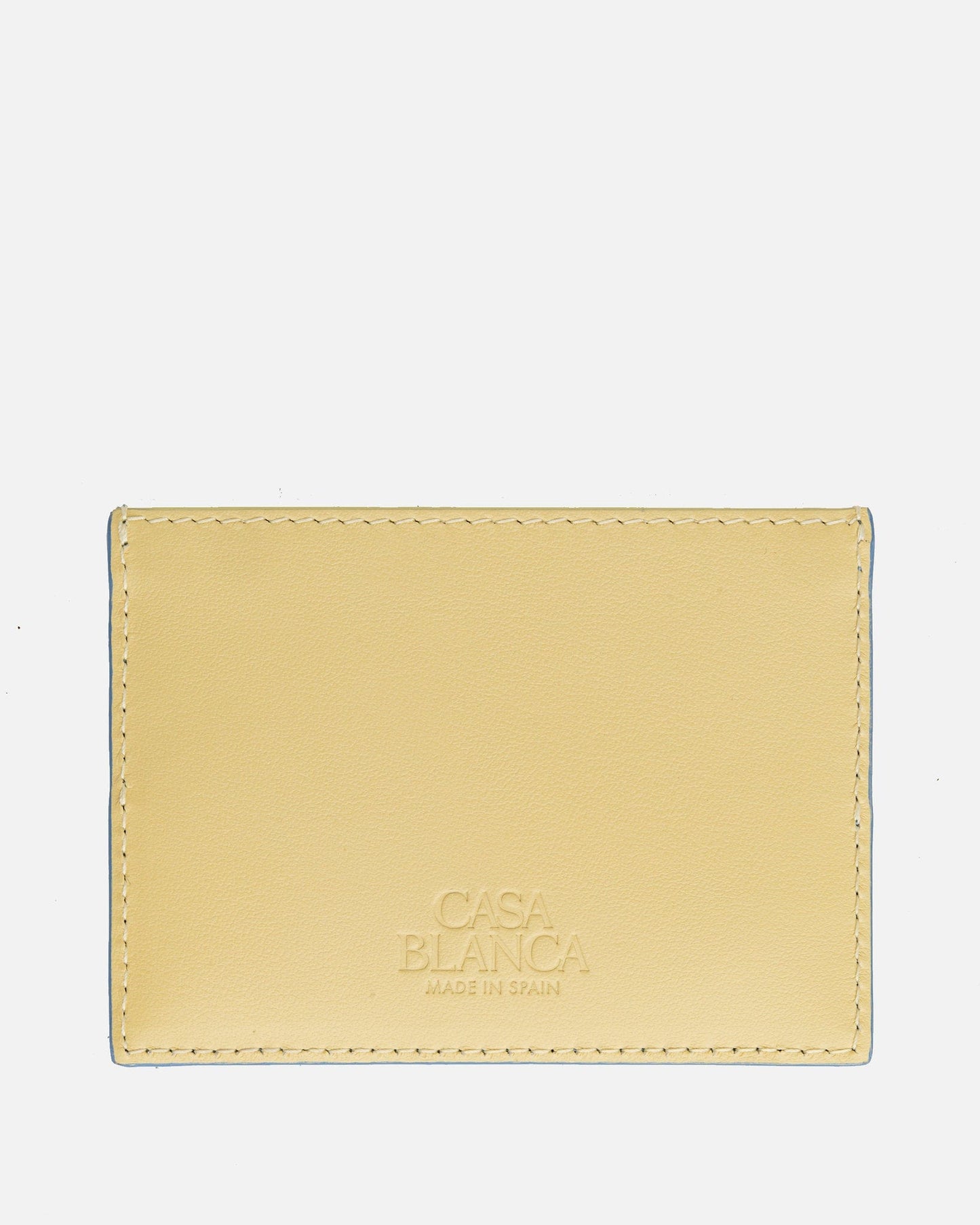 Casablanca leather card holder in pink and blue. This card case has the Casablanca logo enamel on the front. There is one slot for holding cards.
