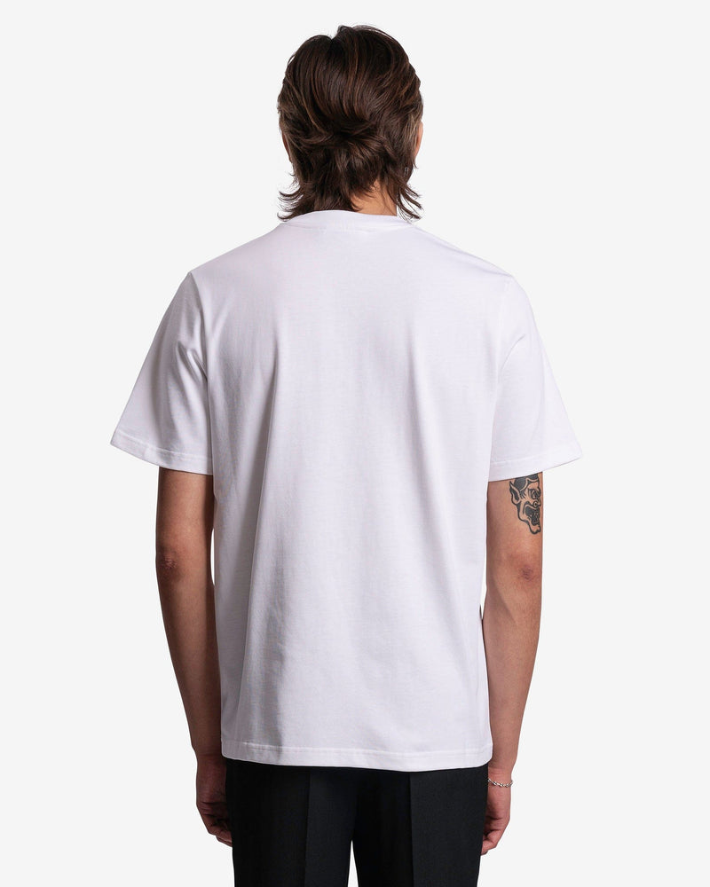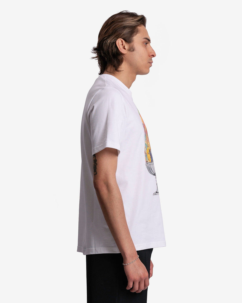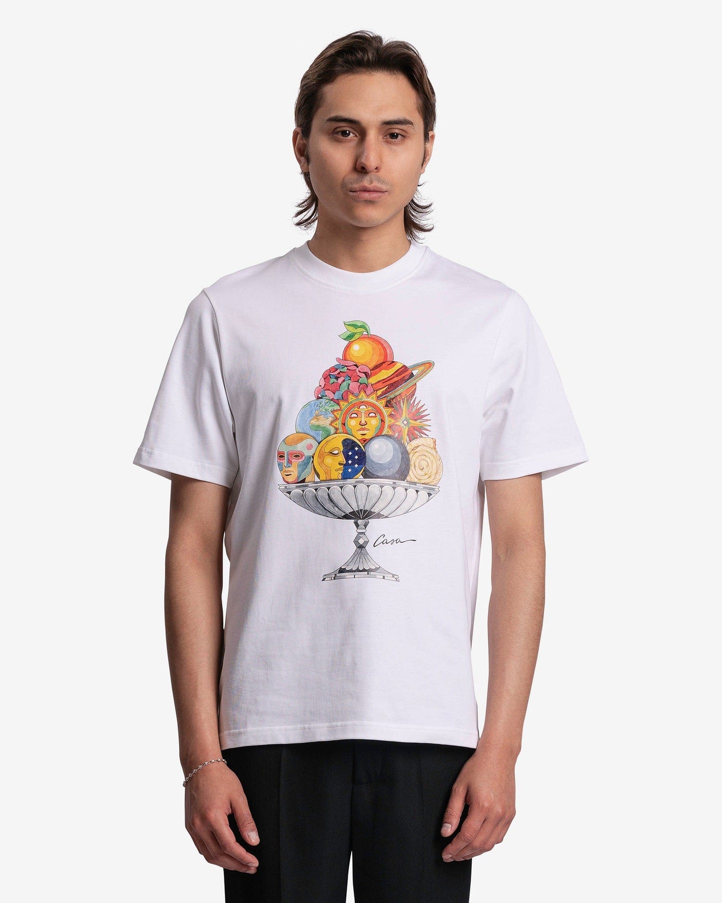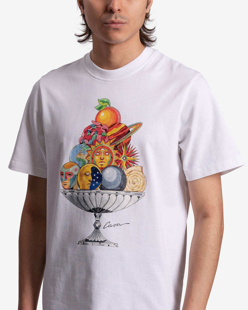 Casablanca men's graphic t-shirt in white. This top features a graphic print of celestial objects on a silver platter.