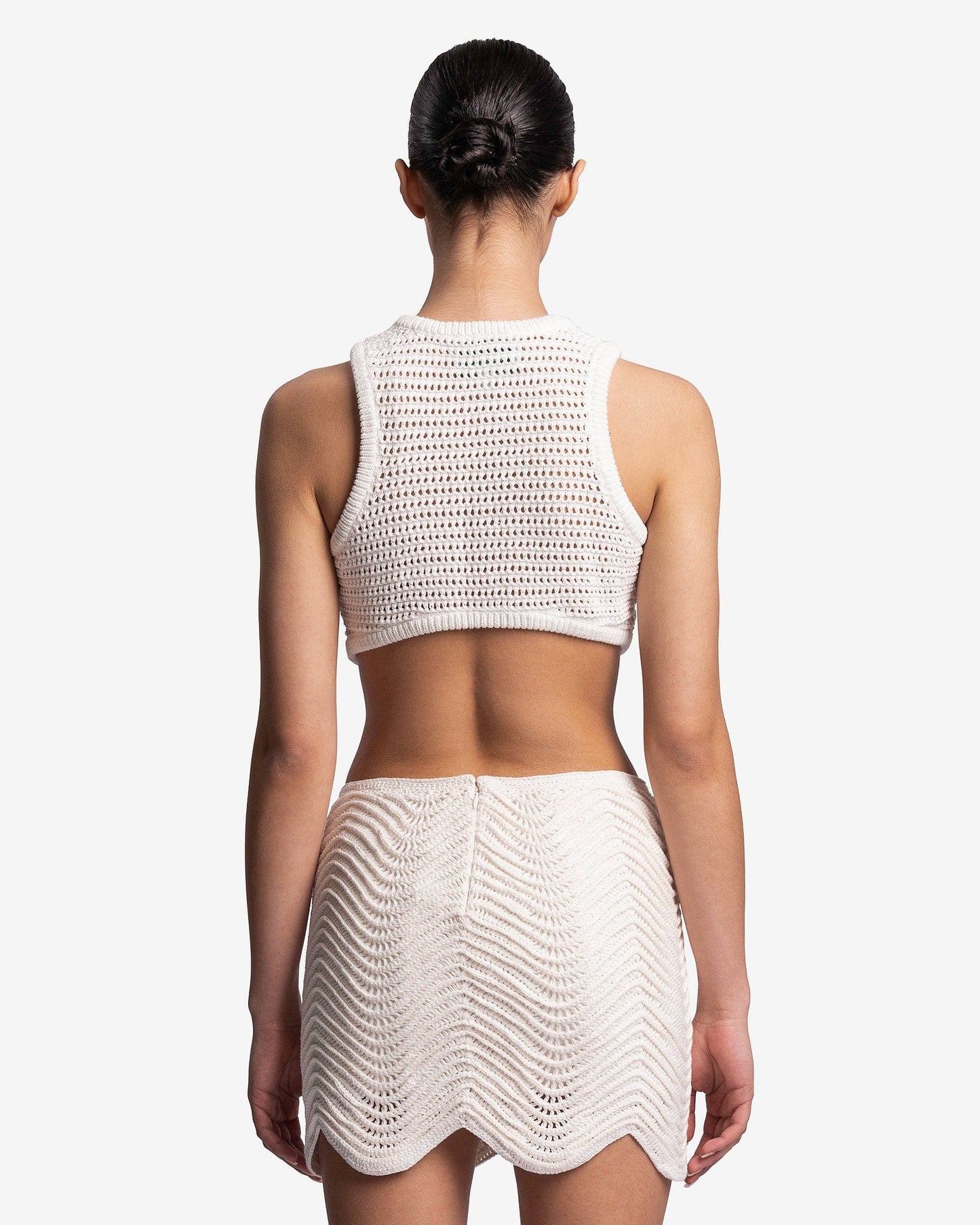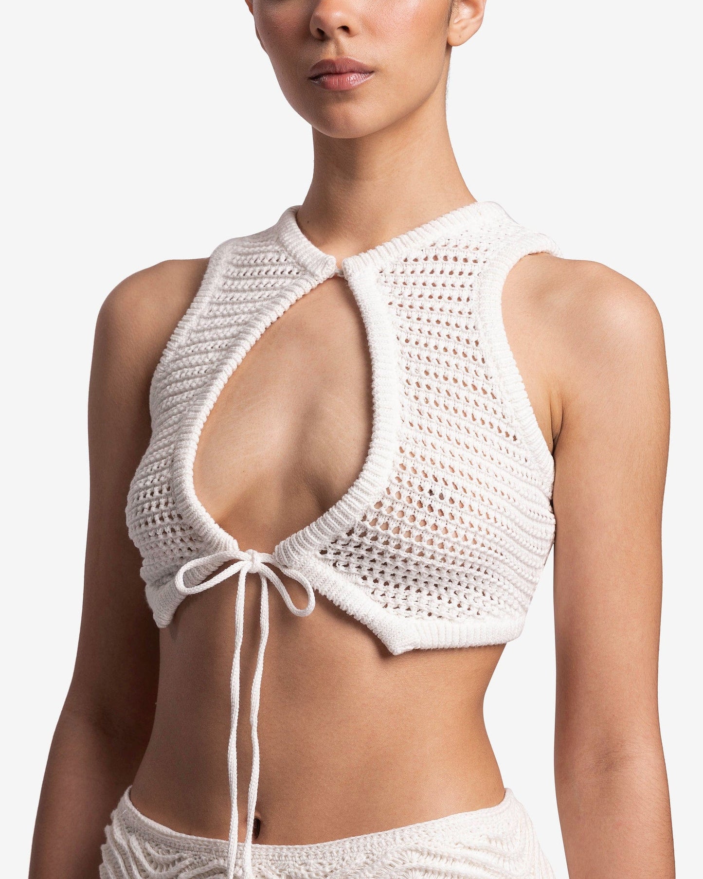 Casablanca women's cut-out crocheted top in white. This top features a keyhole cutout at the chest and front tie closure.