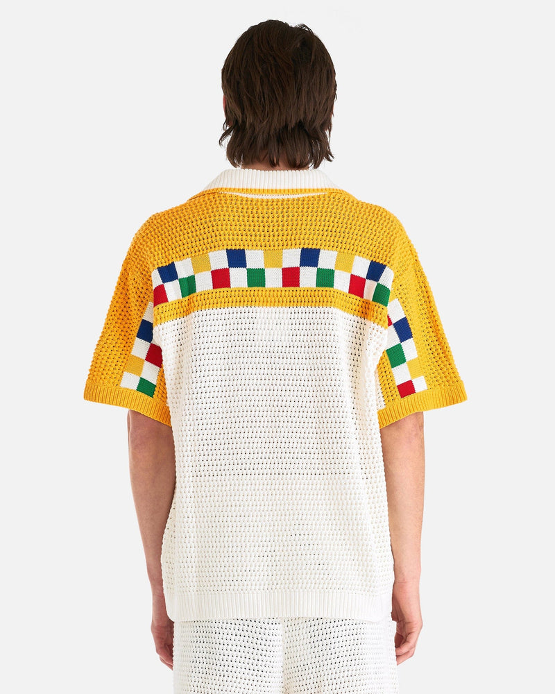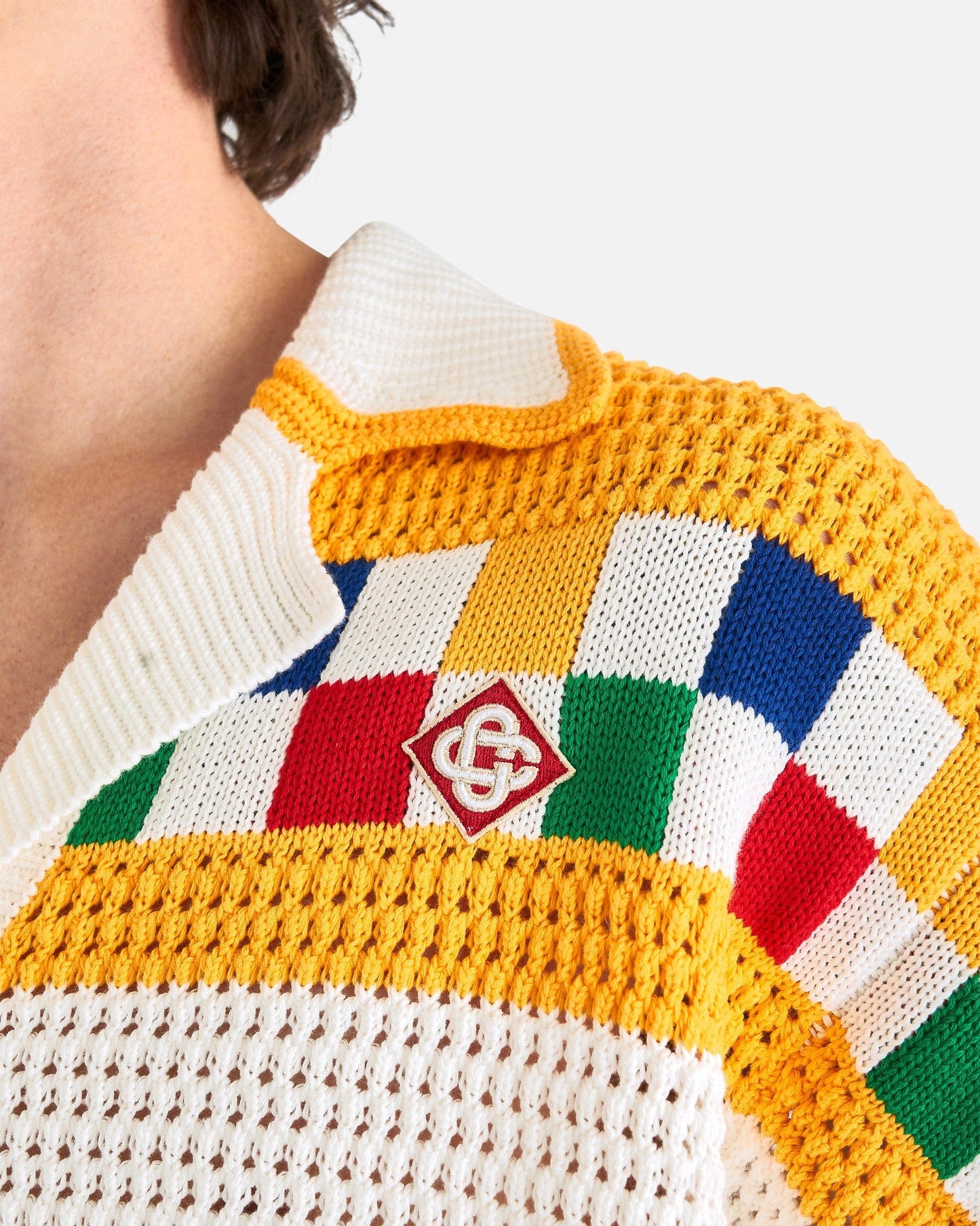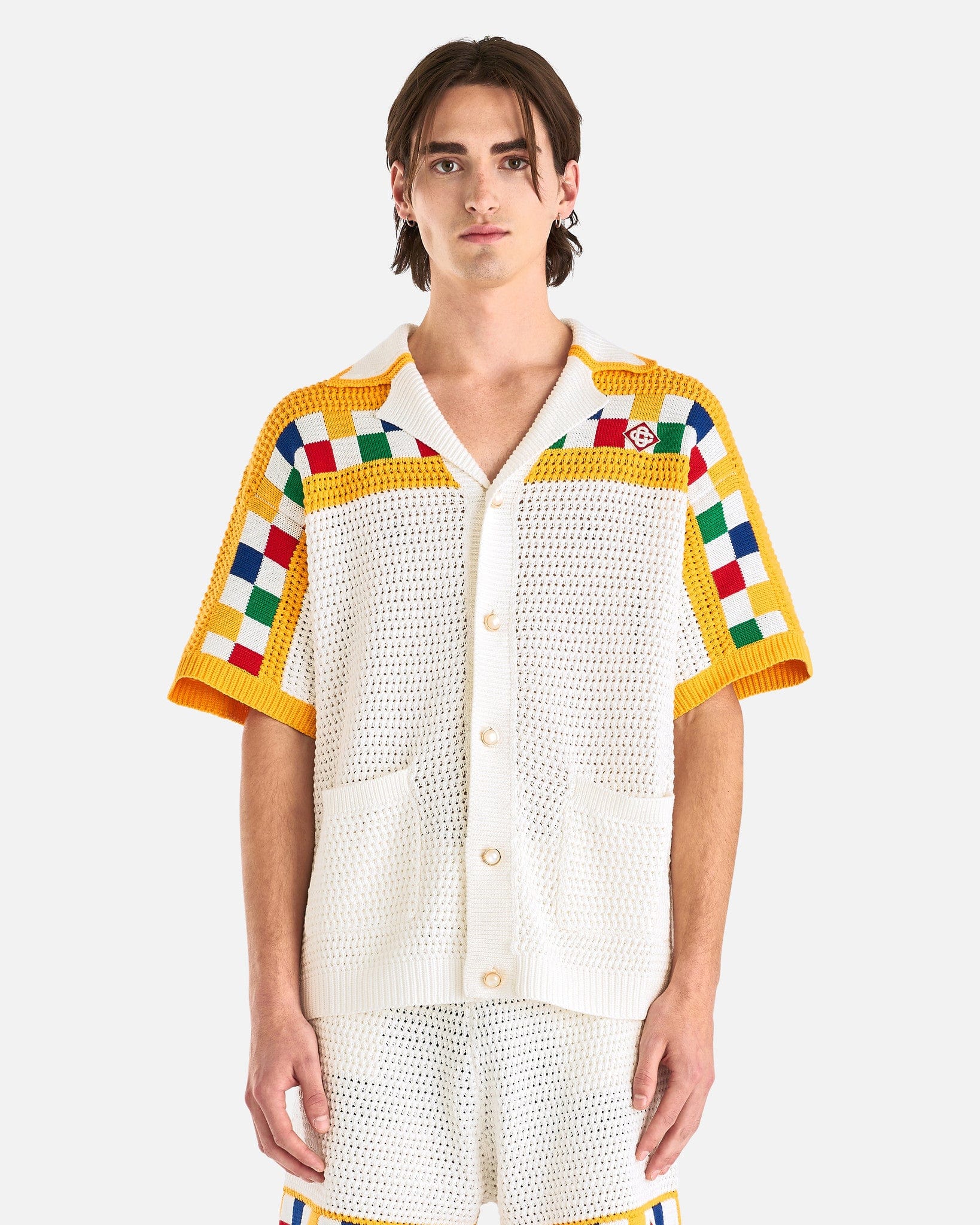 Casablanca men's crochet top in white. This shirt features a crochet knit fabric with a checkered pattern.