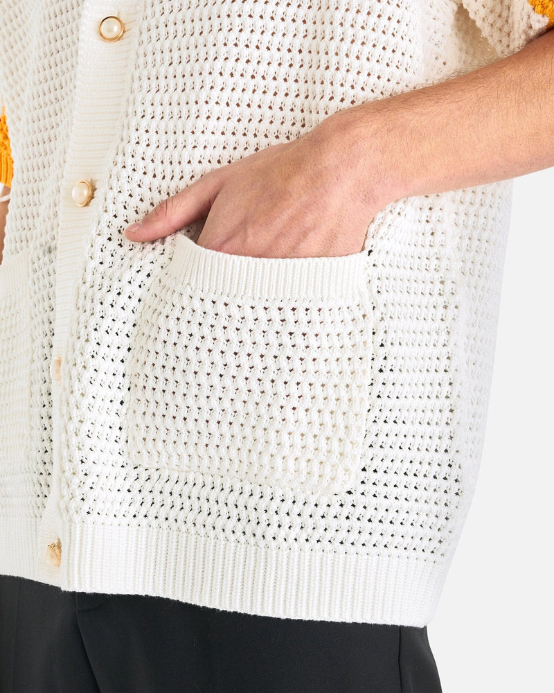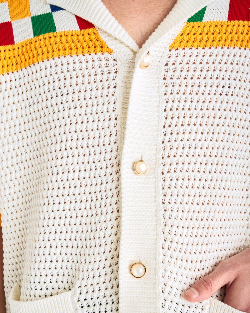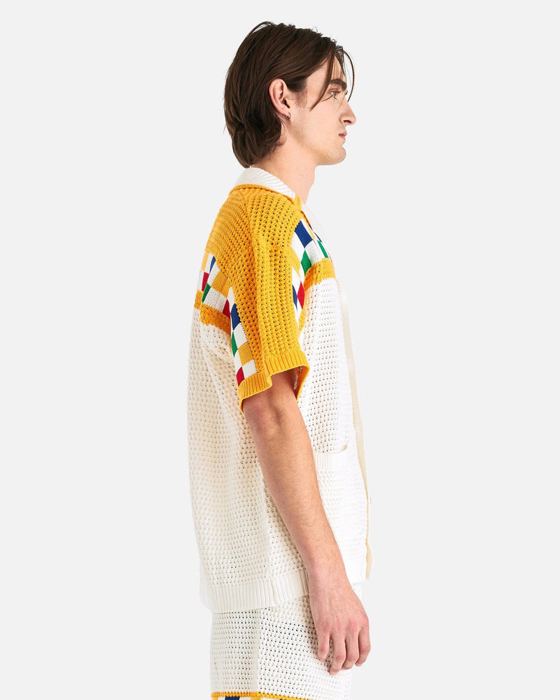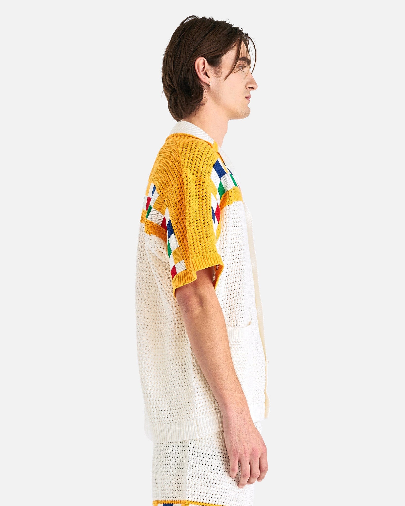 Casablanca men's crochet top in white. This shirt features a crochet knit fabric with a checkered pattern.