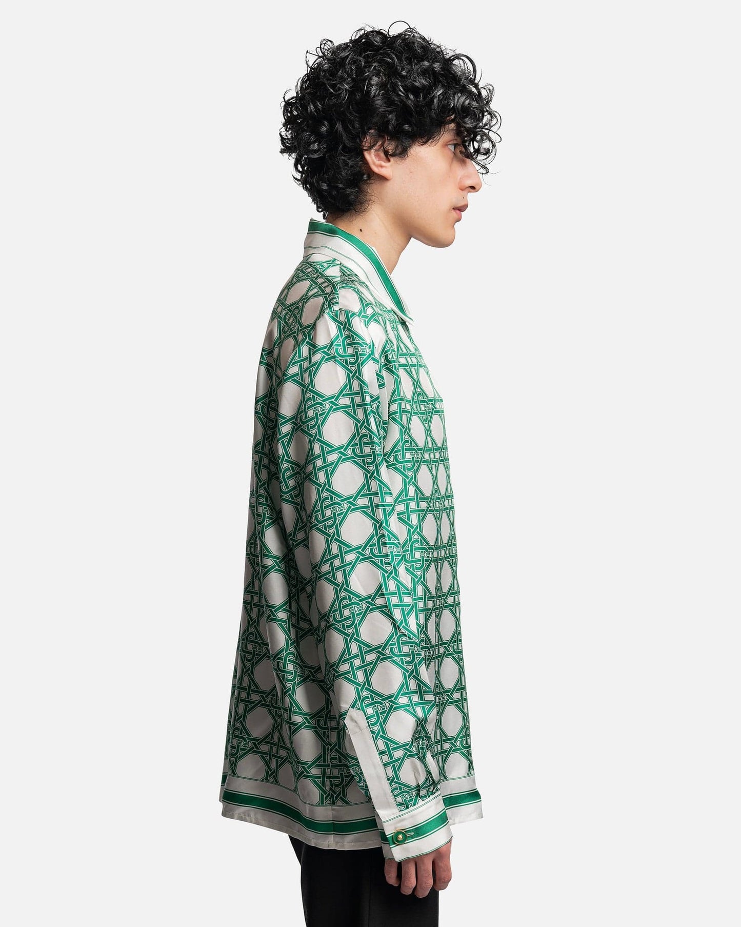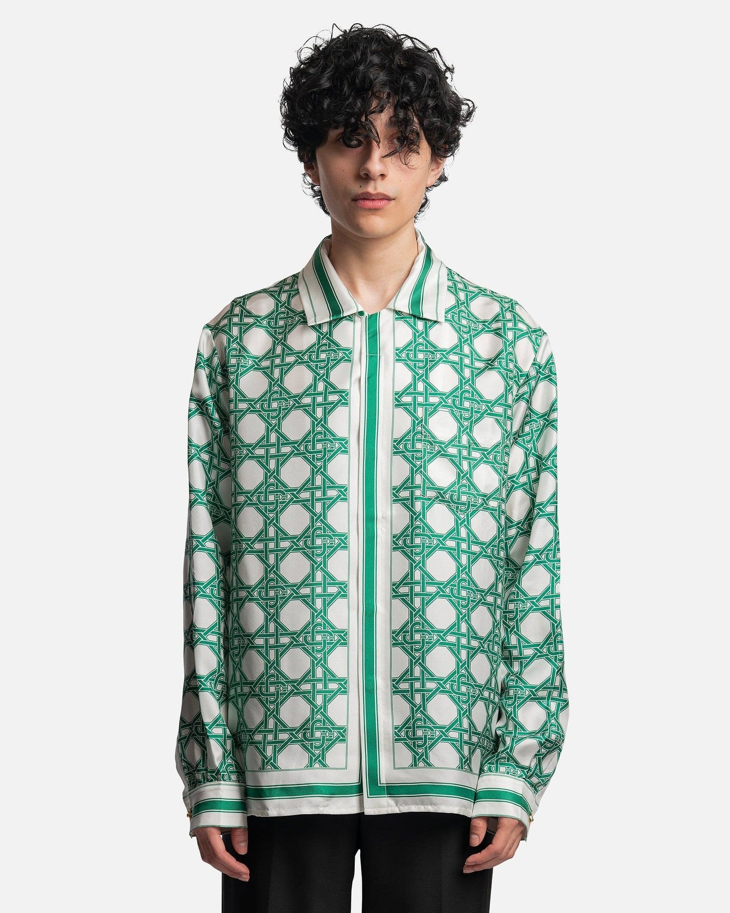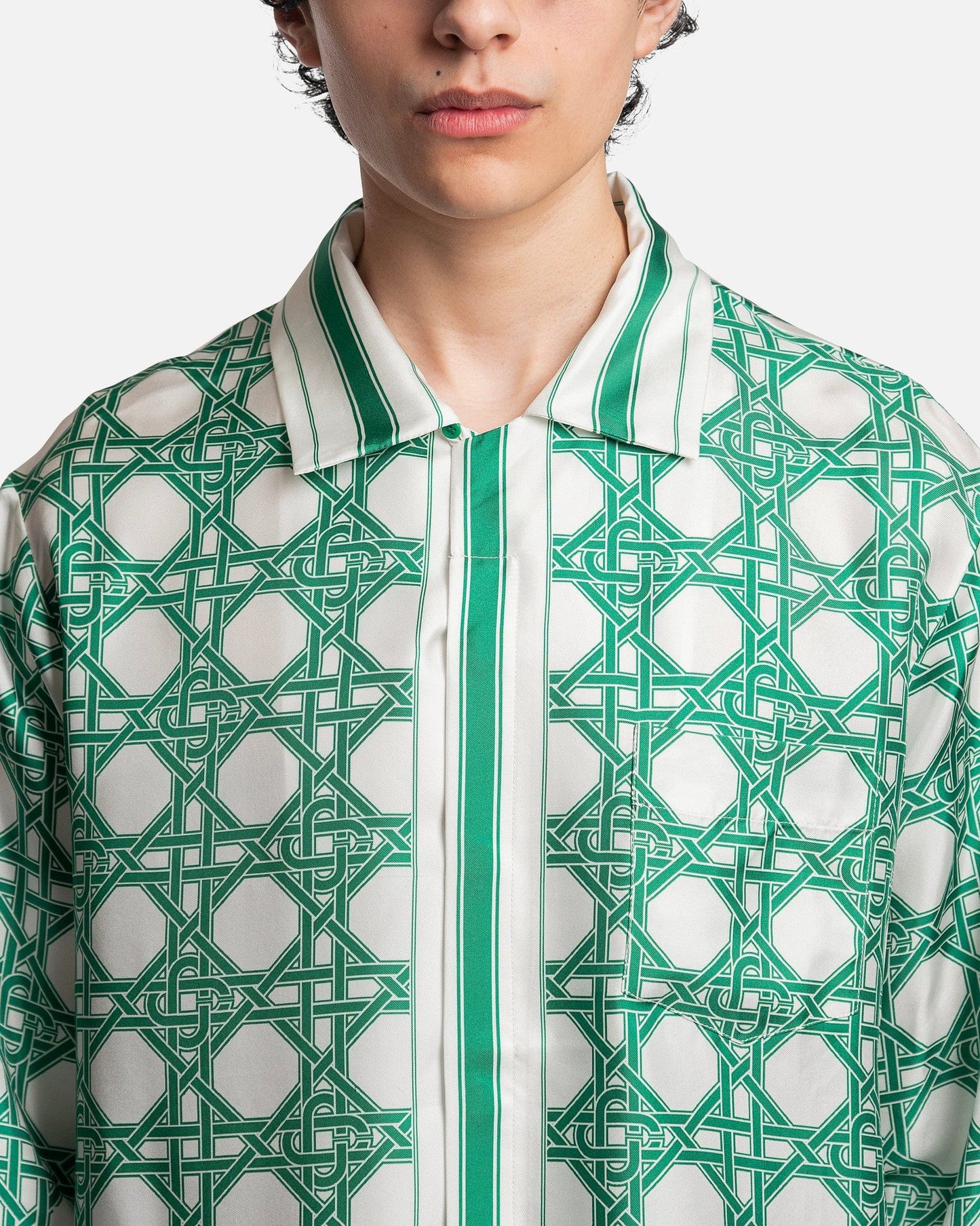 Casablanca men's button-up shirt in an all-over white and green monogram print. This shirt features a camp collar and front covered button closures. The top has a boxy, loose fit and a straight hem.