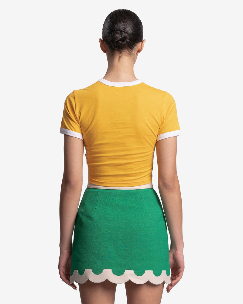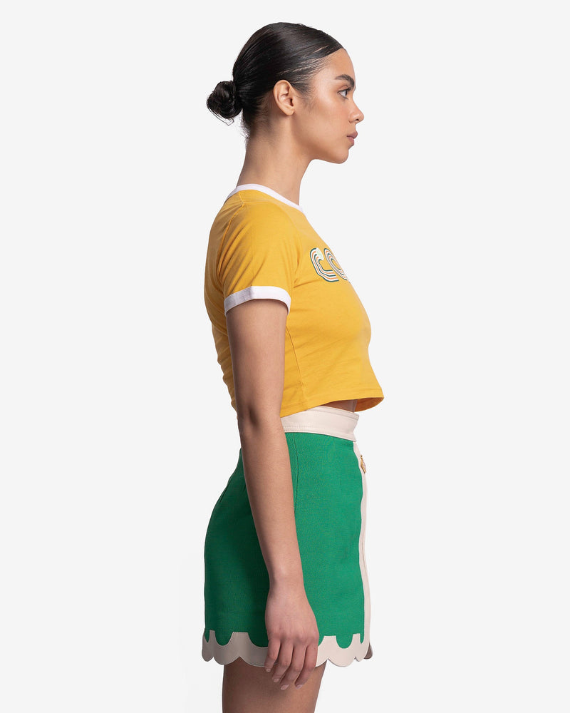 Casablanca women’s graphic baby tee in yellow. This t-shirt features a graphic print of tennis balls spelling 'CASA' on the front and has a white trim at the neckline and cuffs.