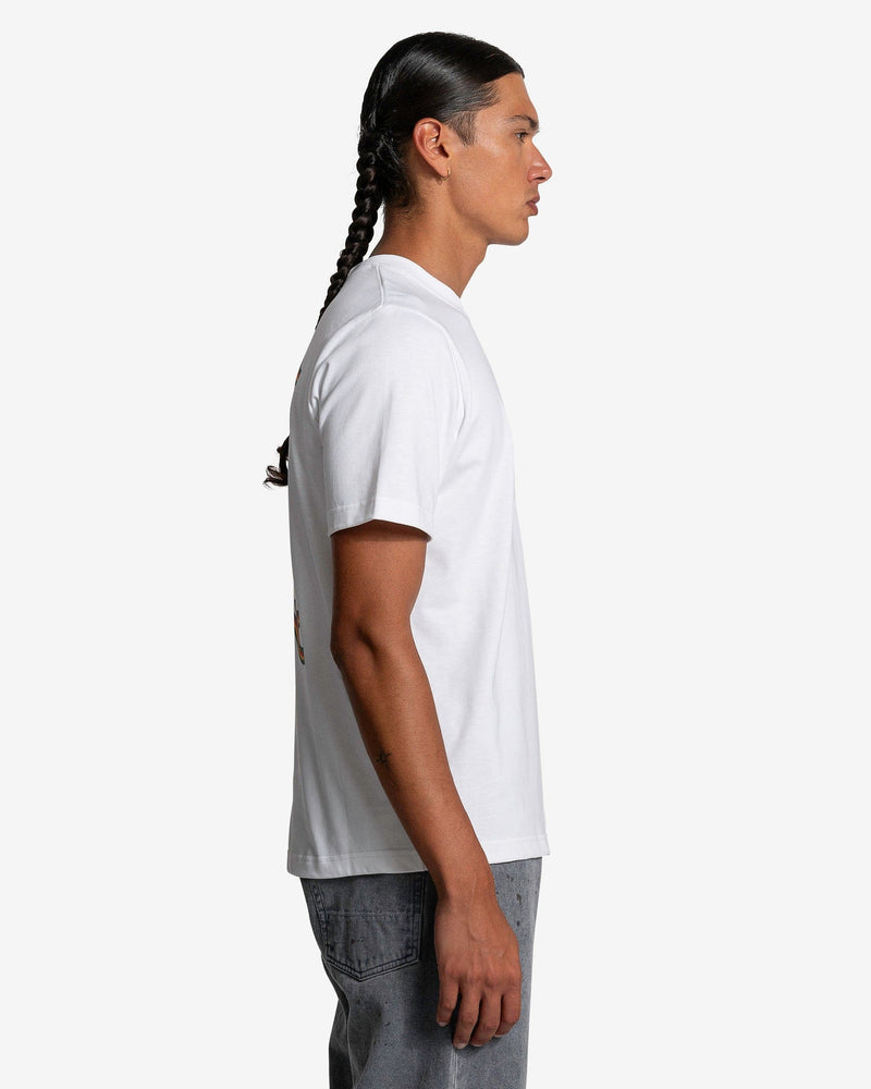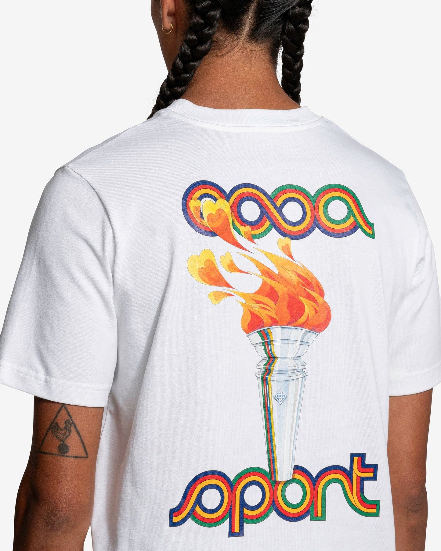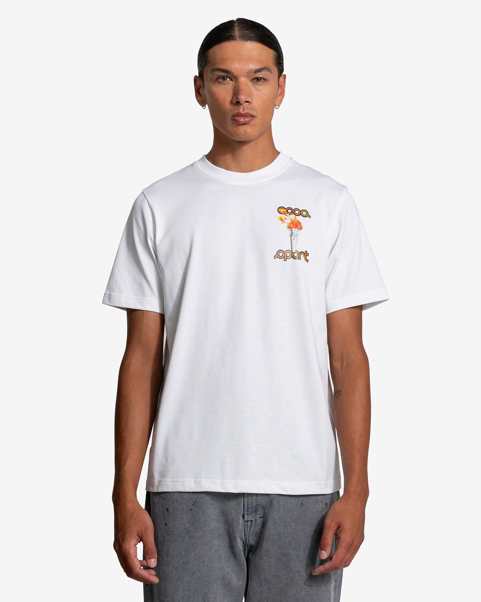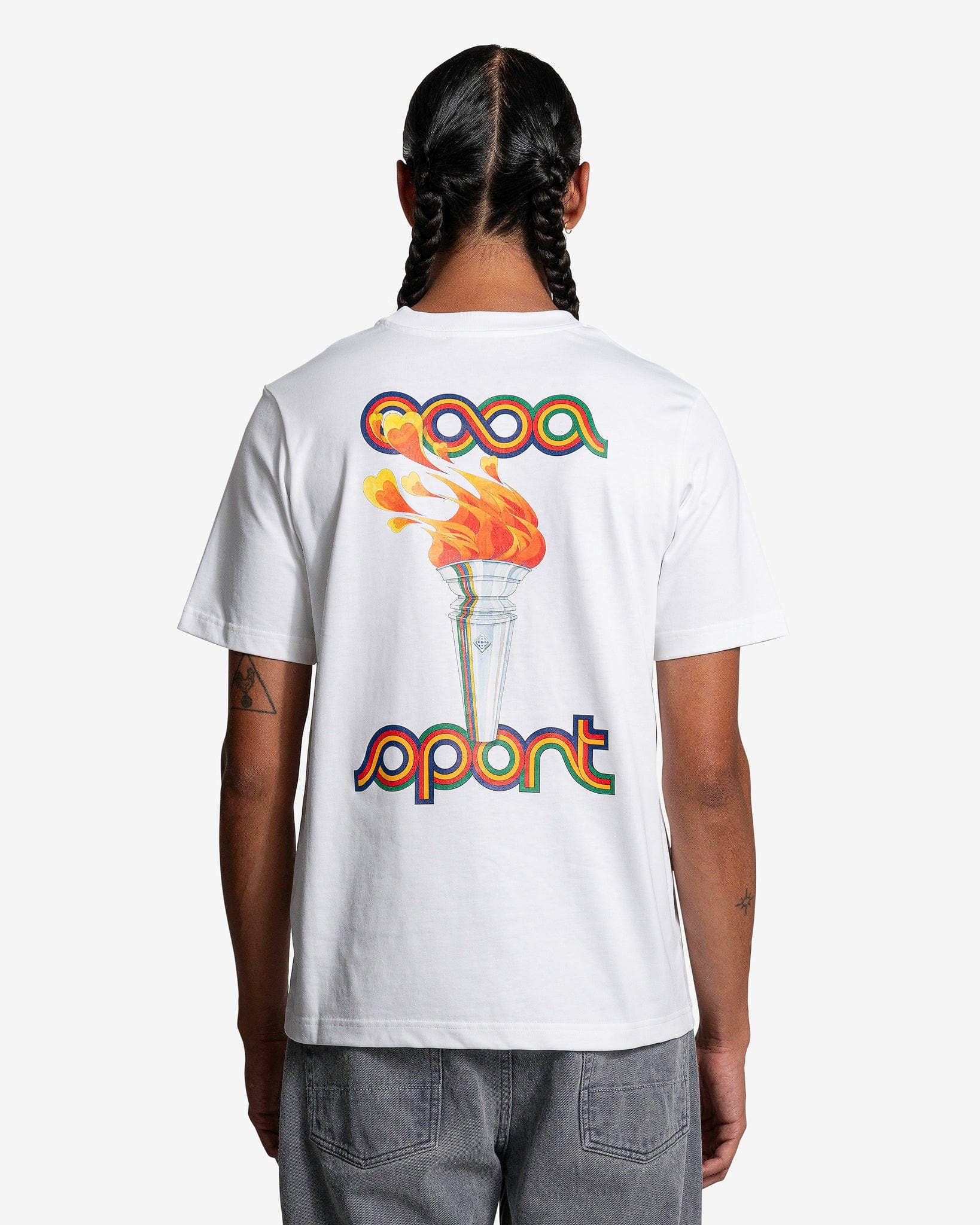 Casablanca men's graphic shirt in white. This shirt features a crew neckline, short sleeves and a graphic of a torch on the front and back.
