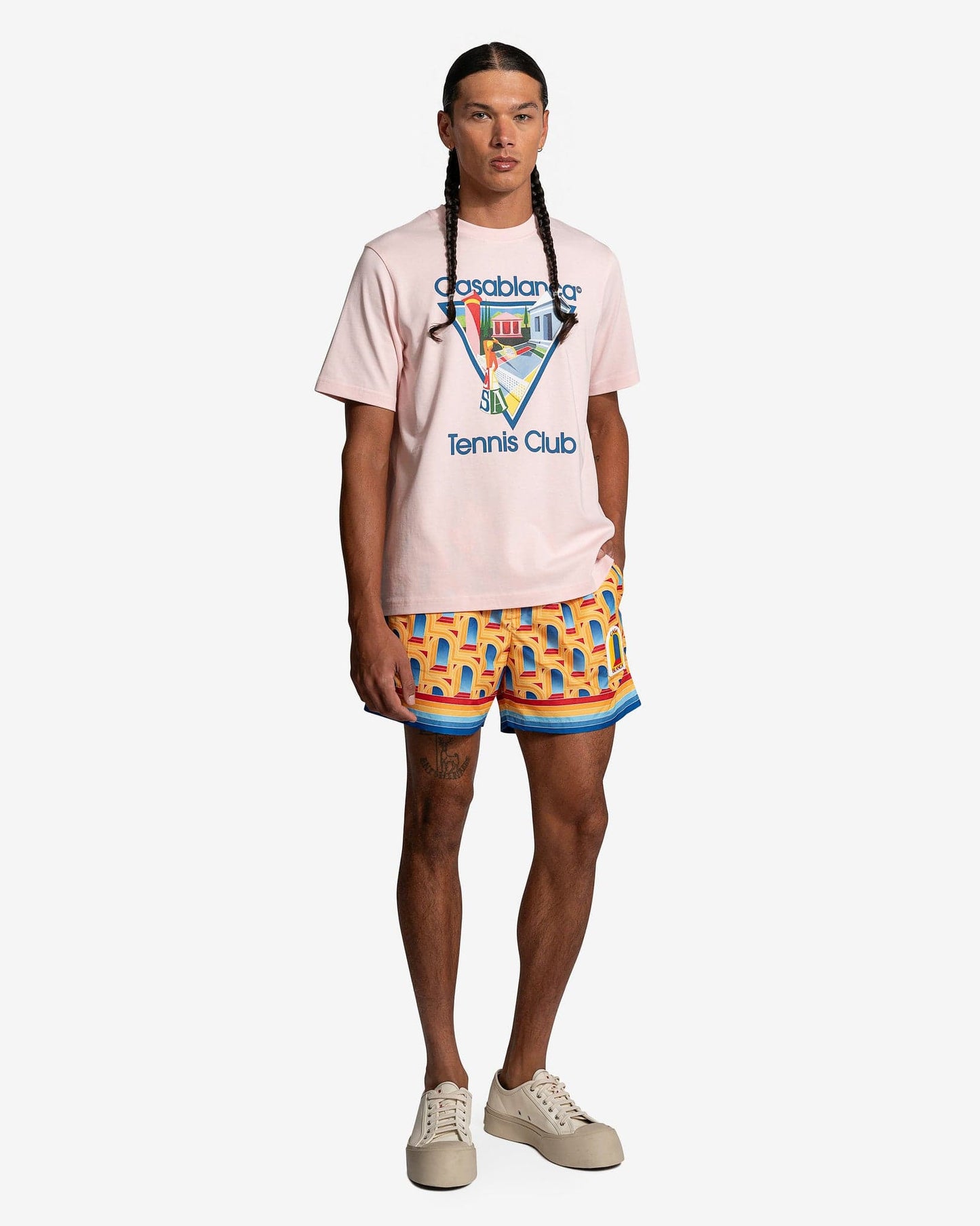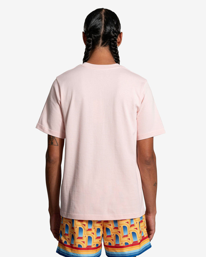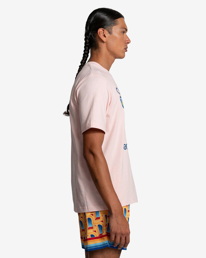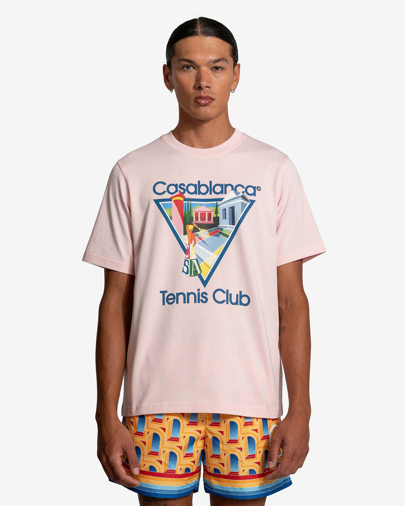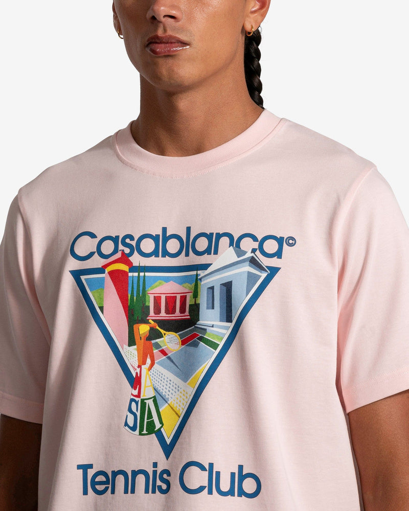 Casablanca men's graphic tennis club shirt in light pink. This shirt features a crew neckline, short sleeves, and a triangle logo graphic on the chest.