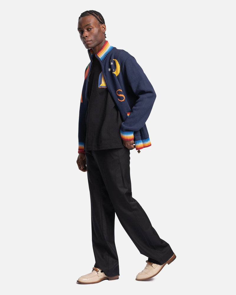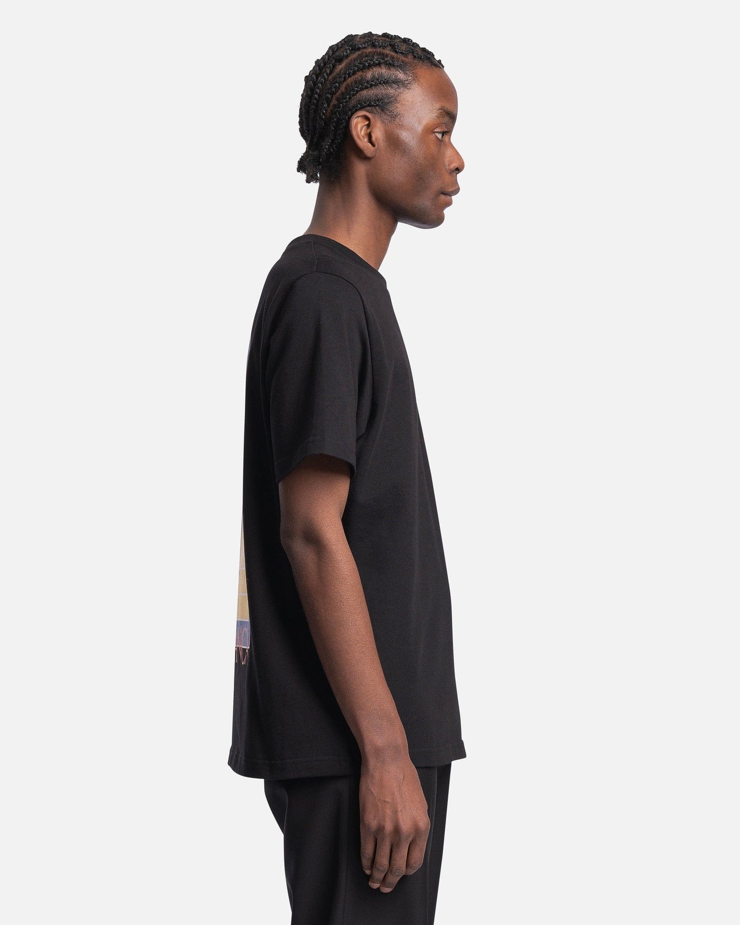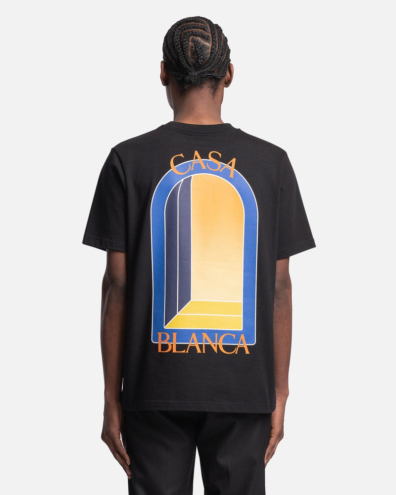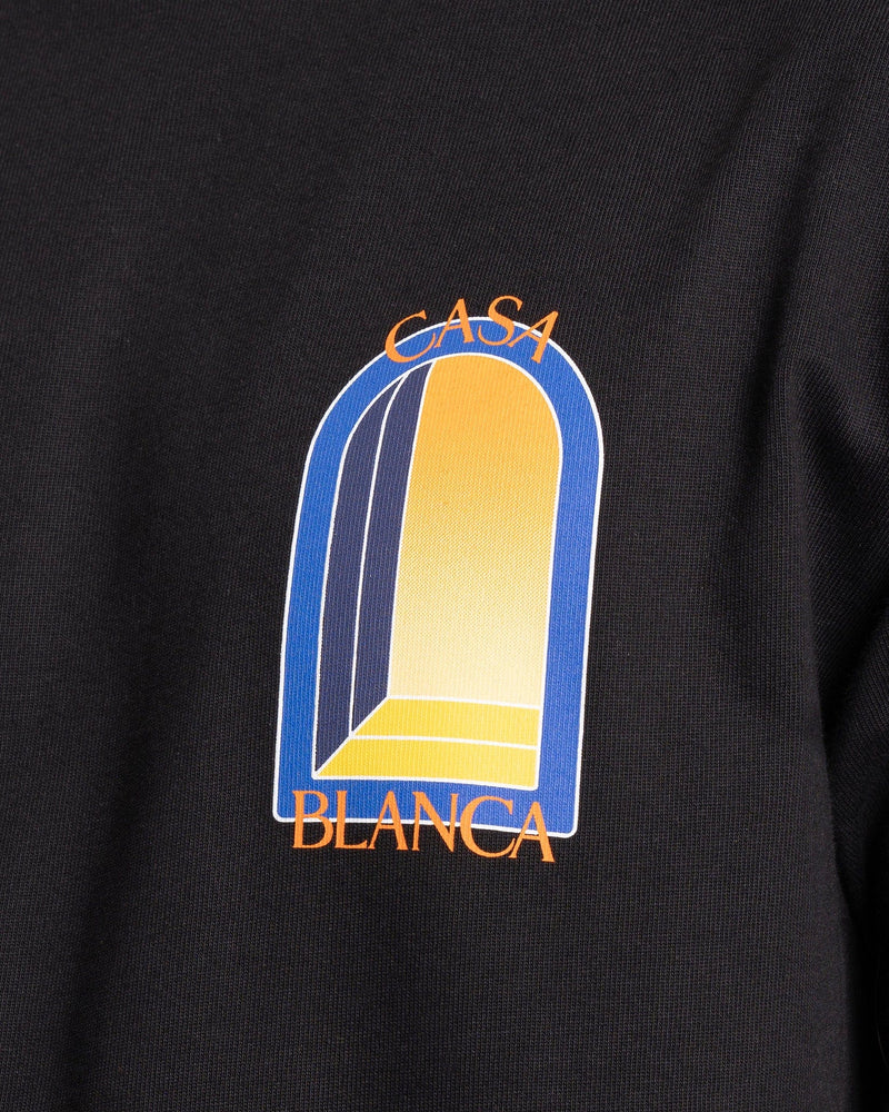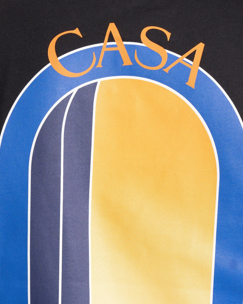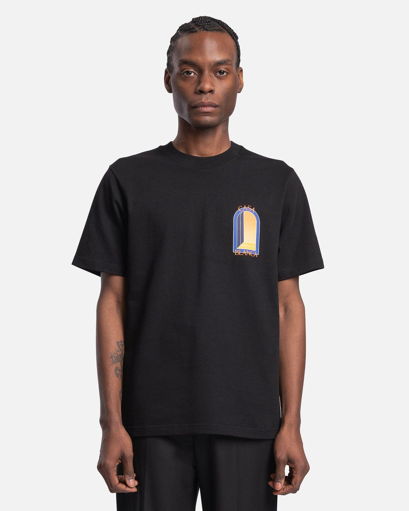 Casablanca men's graphic t-shirt in black. This shirt features a rib knit crewneck collar and arch graphics printed on the chest and back.