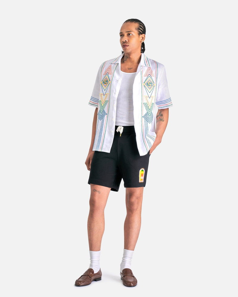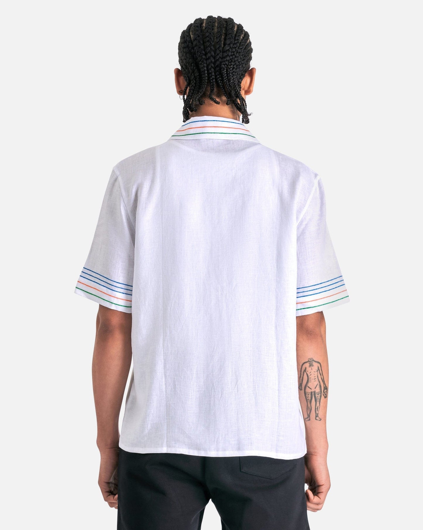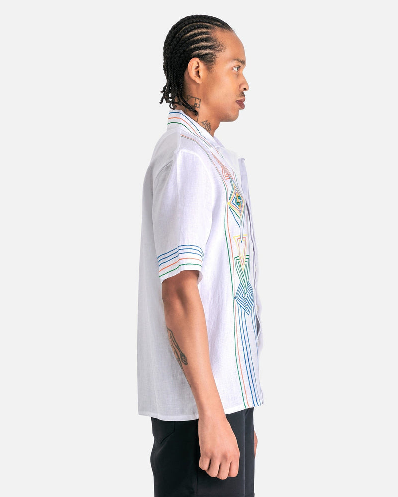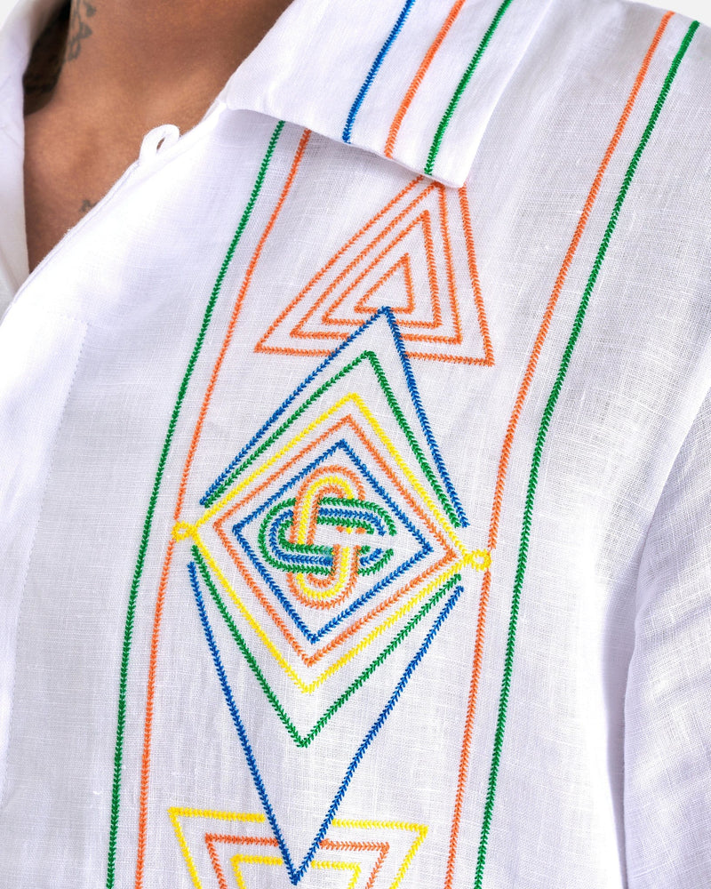 Men's Casablanca Le Fil de La Musique Linen Shirt in White. This shirt features a concealed front-button closure, multicolor chainstitch design on the sleeves, collar and front.