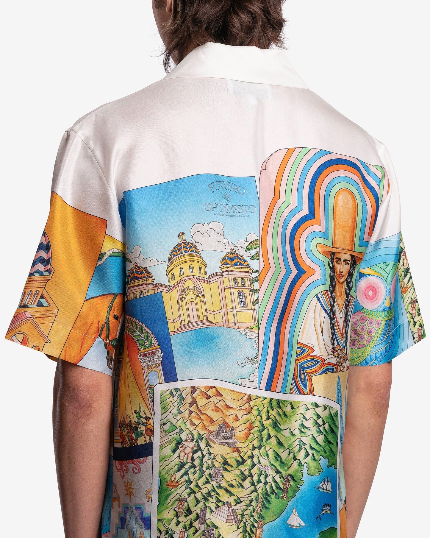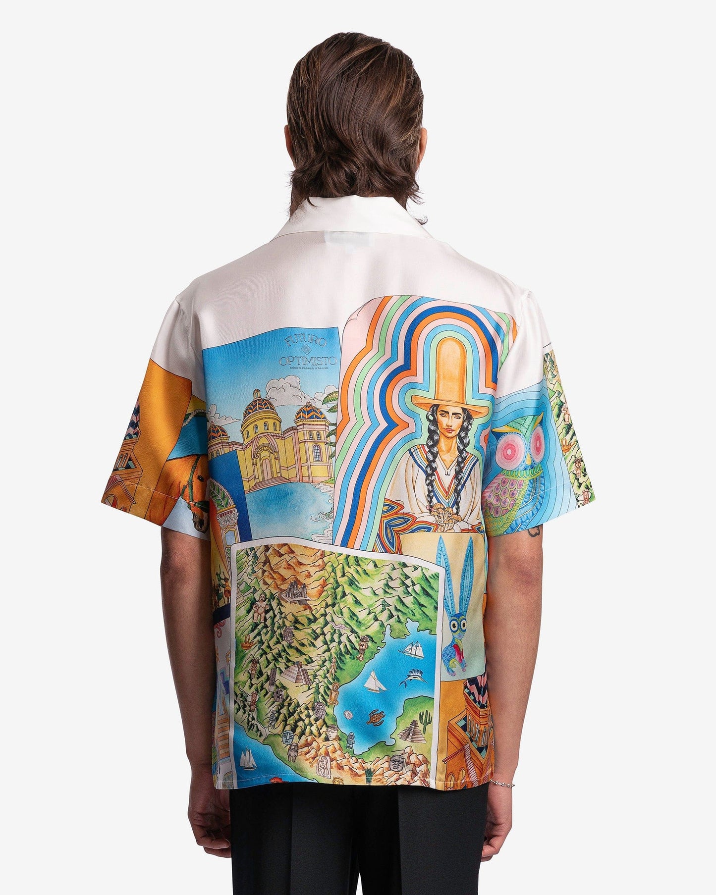 Casablanca men's cuban collared silk shirt in multicolor. This shirt features an allover graphic prints on the front and back.