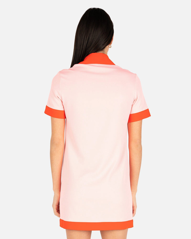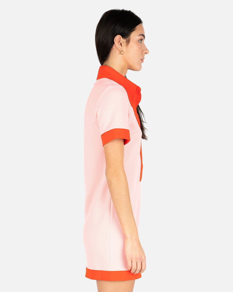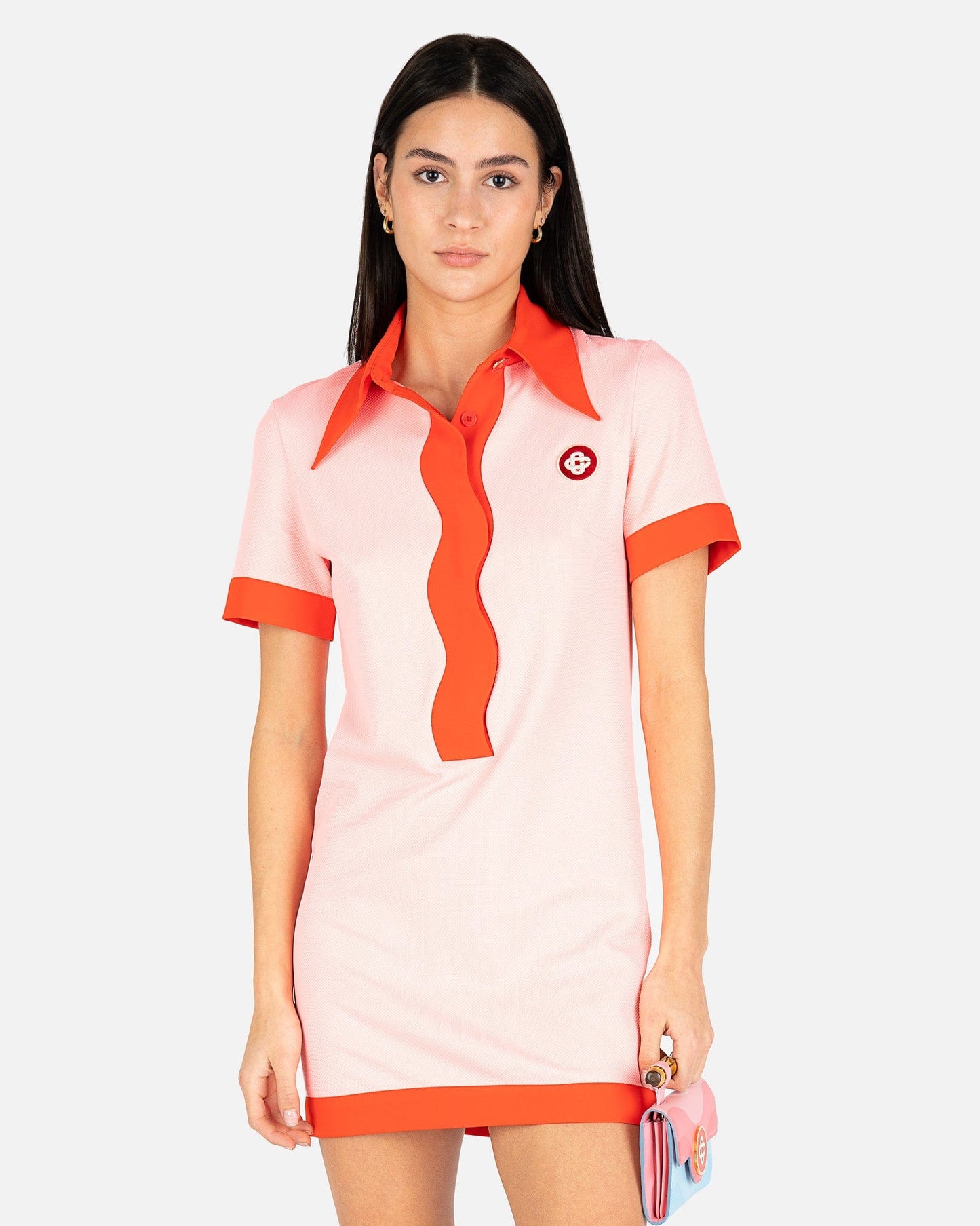 Casablanca women's polo dress in pink. This dress features a polo collar and concealed front button closure. The hem, cuffs and collar are a bright red orange. The placket is wavy and there is a logo patch on the front left chest.