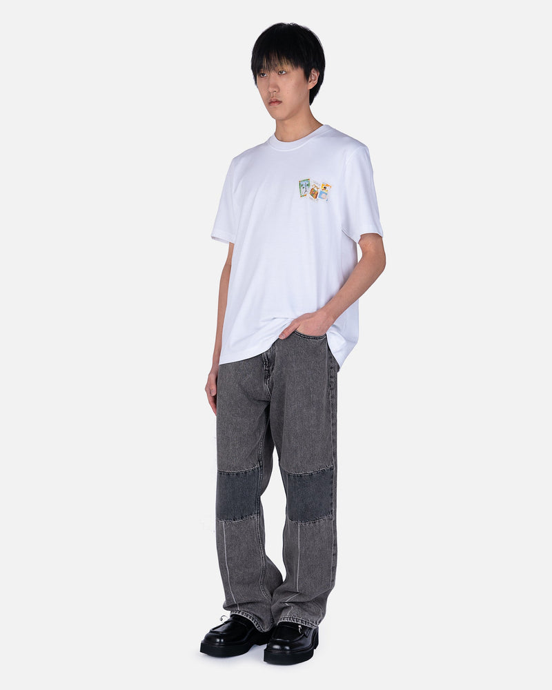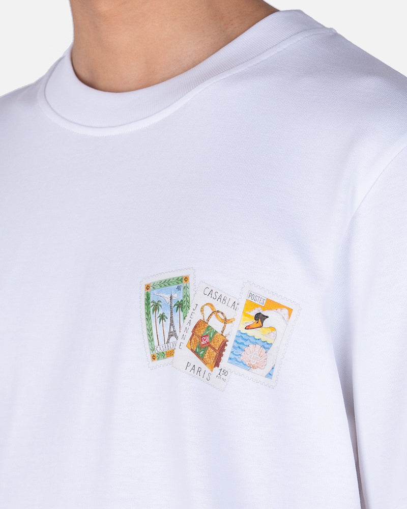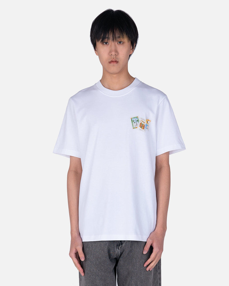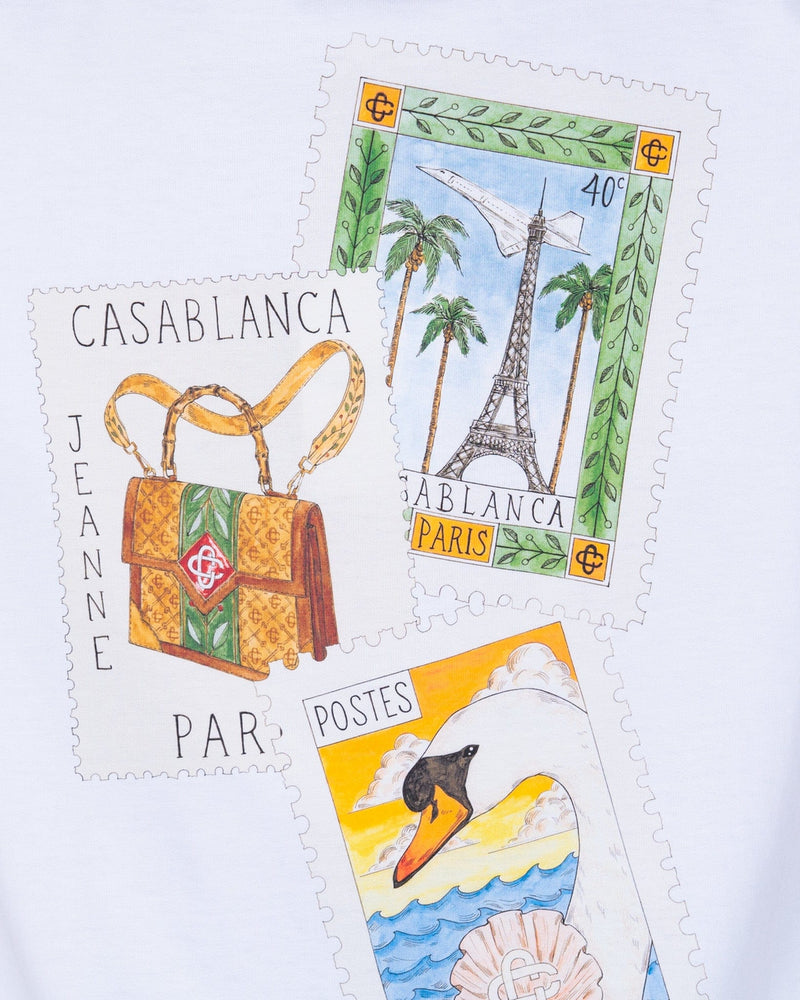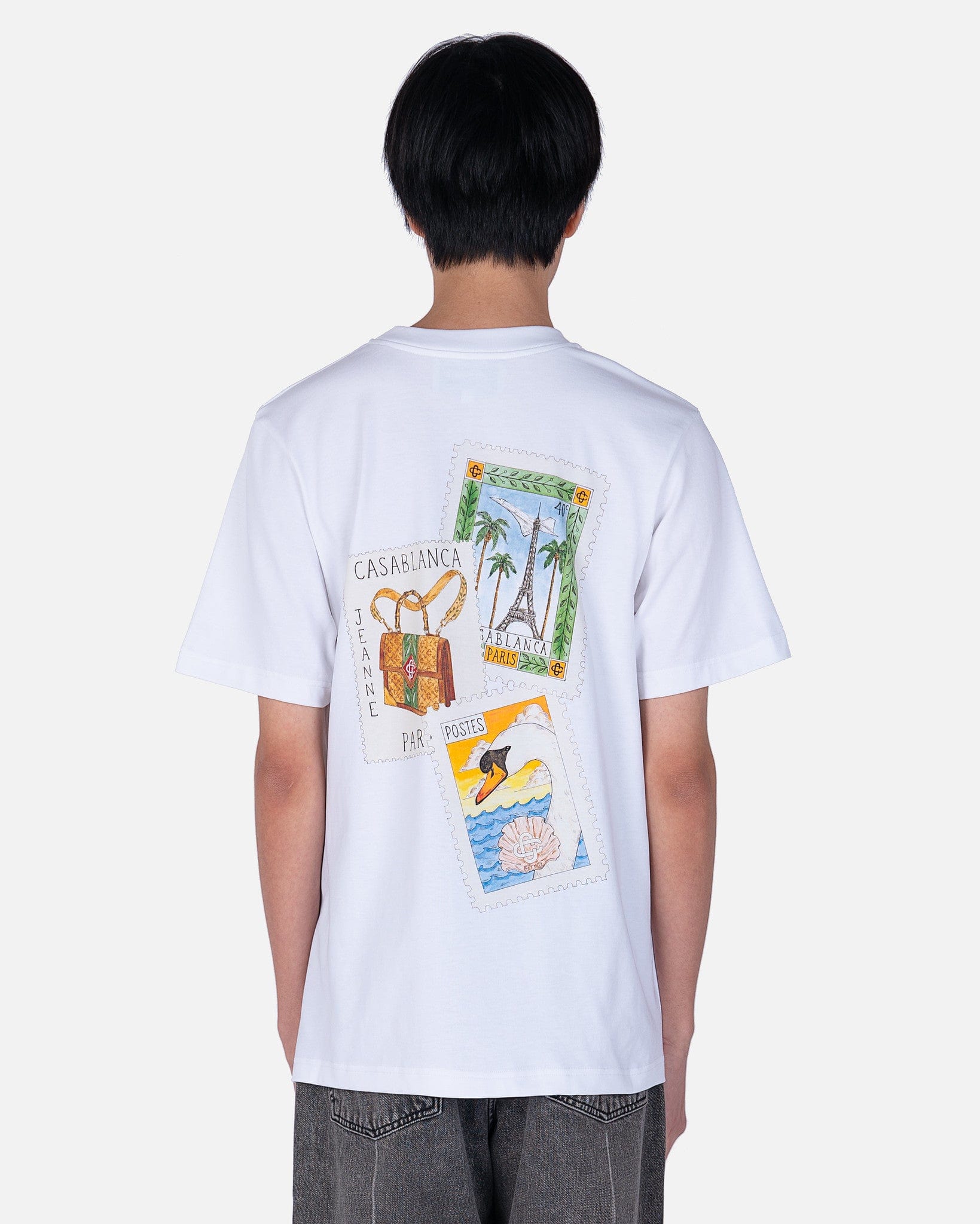 Casablanca men's graphic t-shirt in white. This top features a crew neck and straight hem. The front left chest has a graphic print of three postcards, one of which reads Casablanca. The back features the same three postcards enlarged to cover the body.