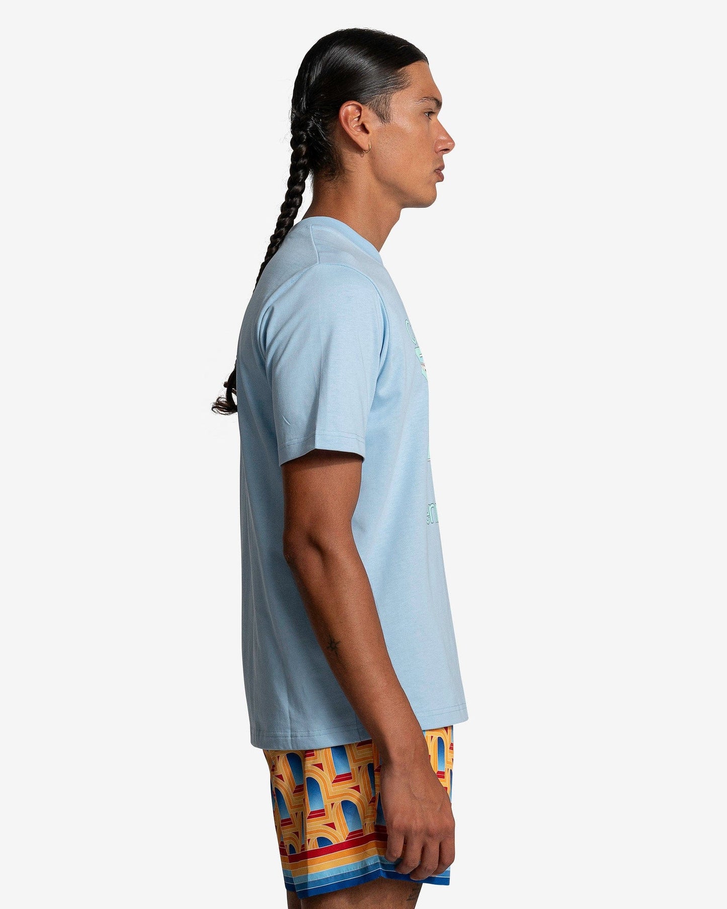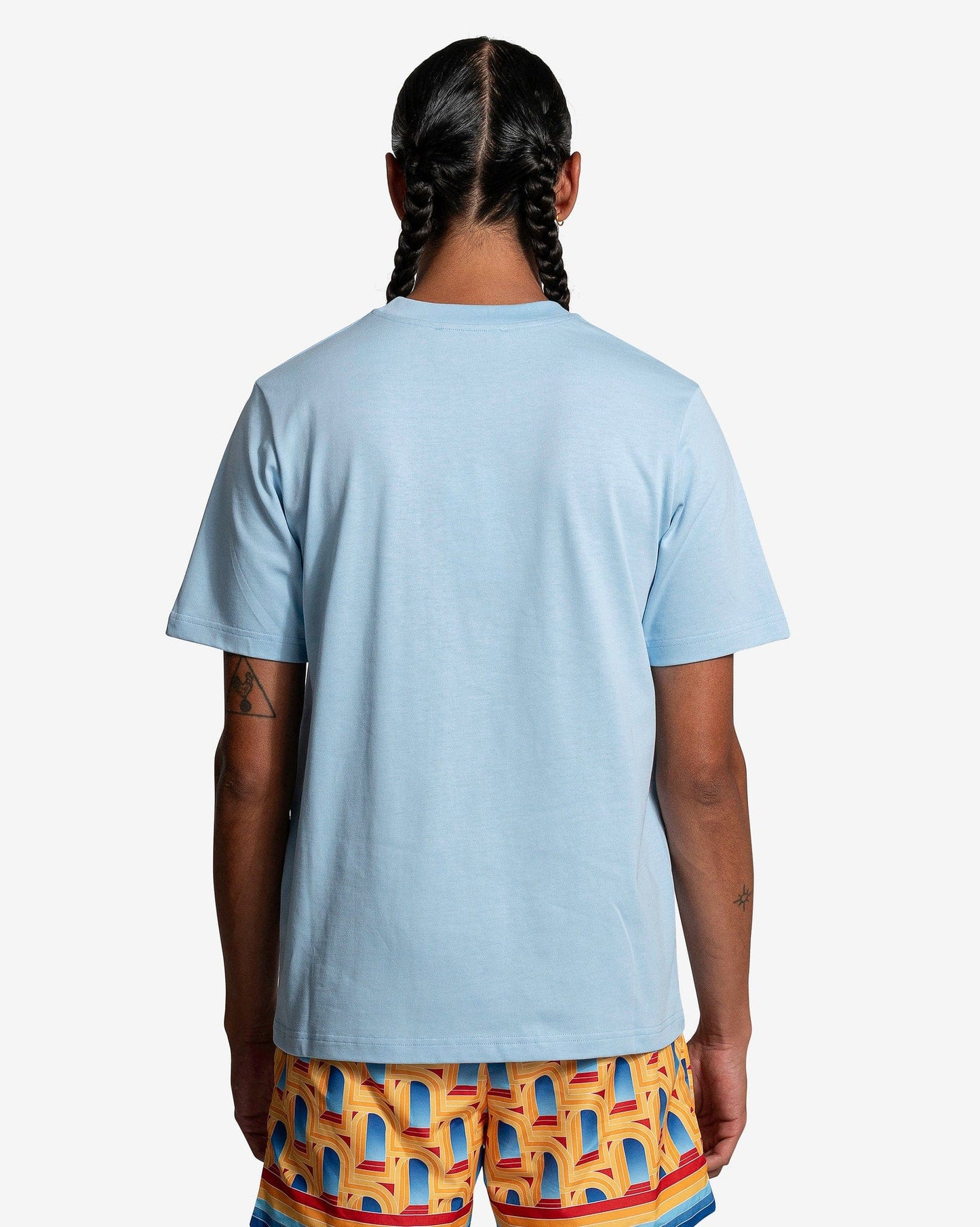 Casablanca men's graphic shirt in light blue. This shirt features a crew neckline, short sleeves and a tennis club logo graphic on the front.