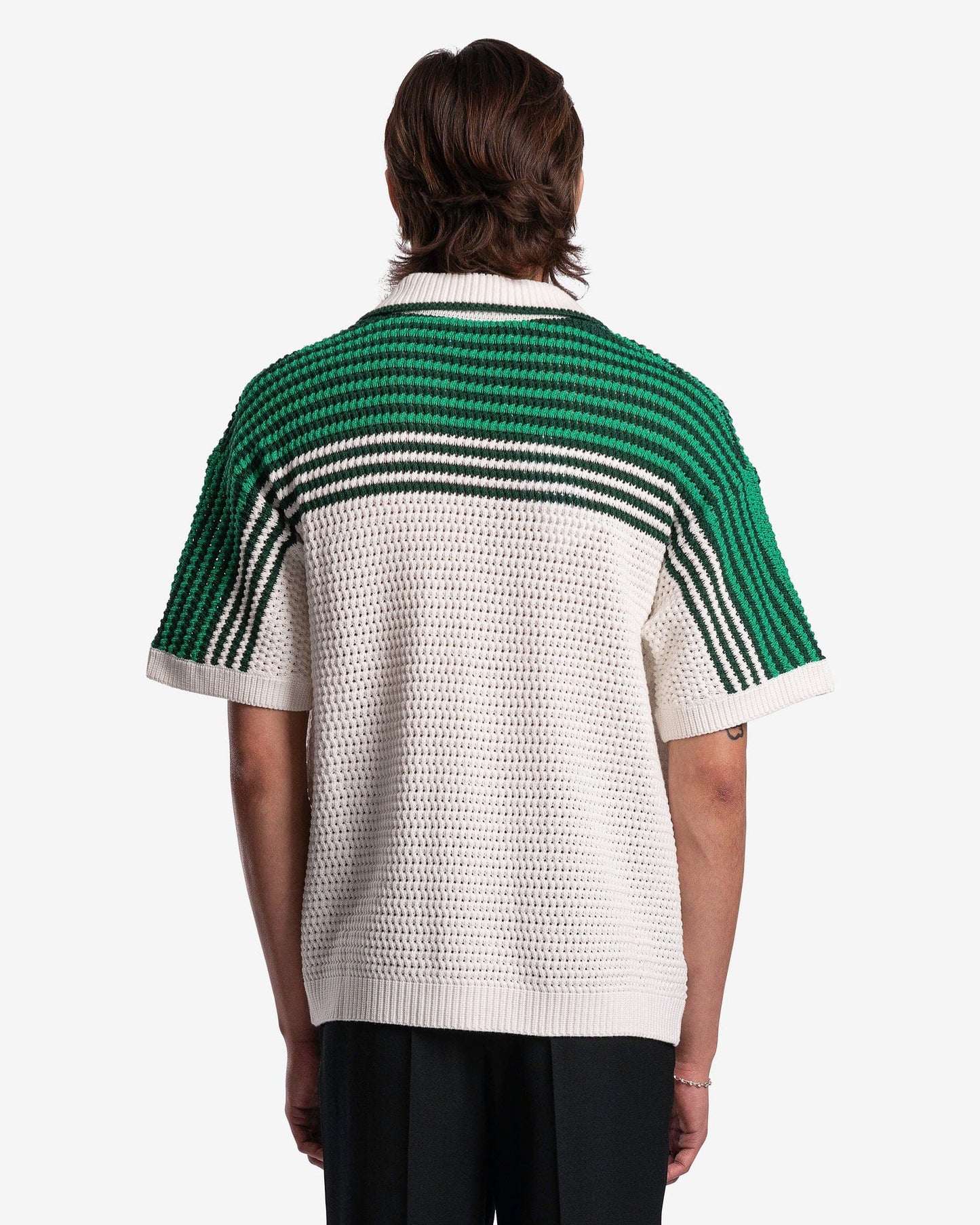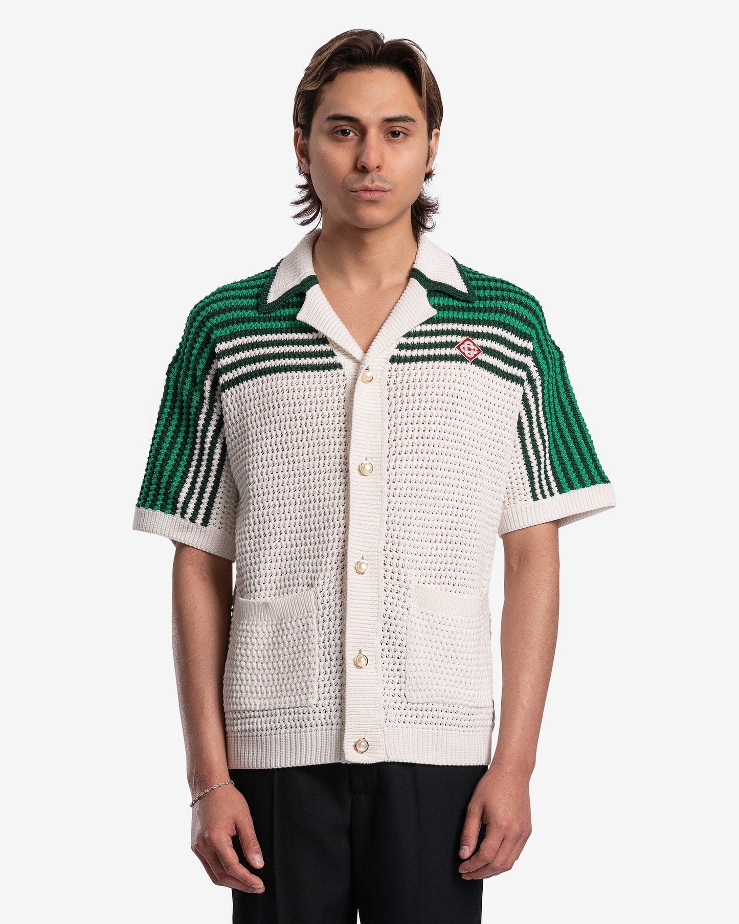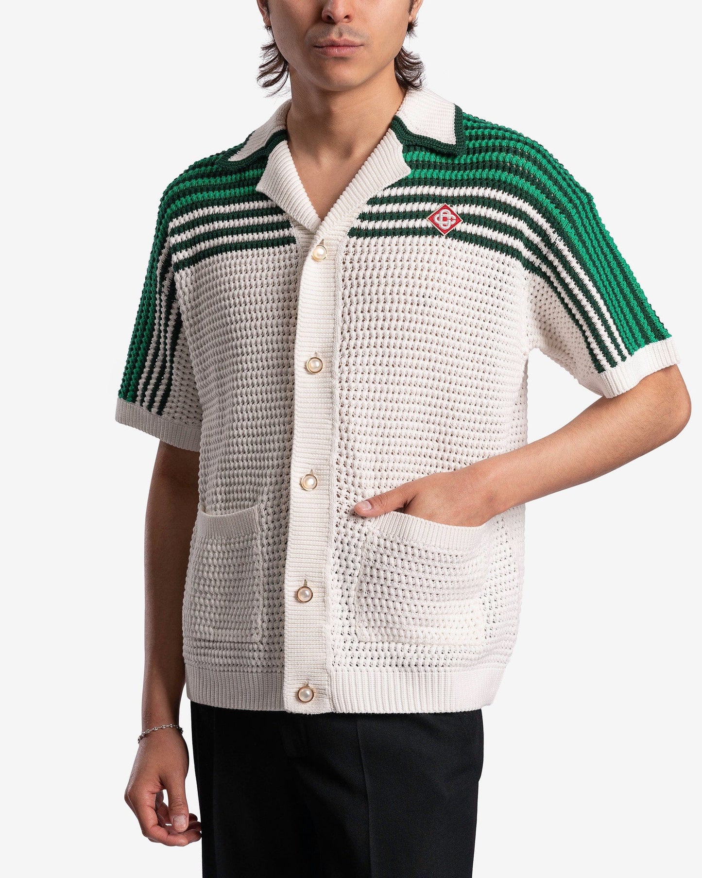 Casablanca men's cuban collared shirt in green and white. This shirt features a crocheted pattern with green stripes on the upper half and patch pockets at the waist.