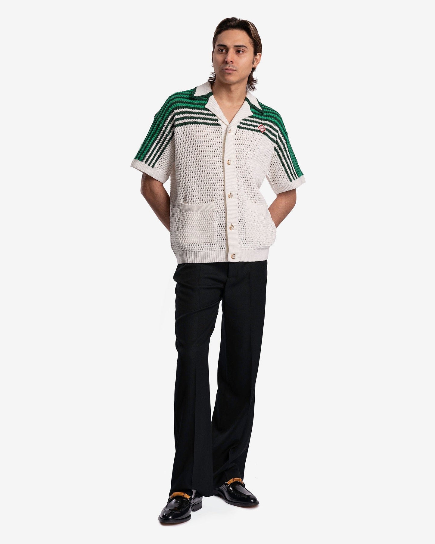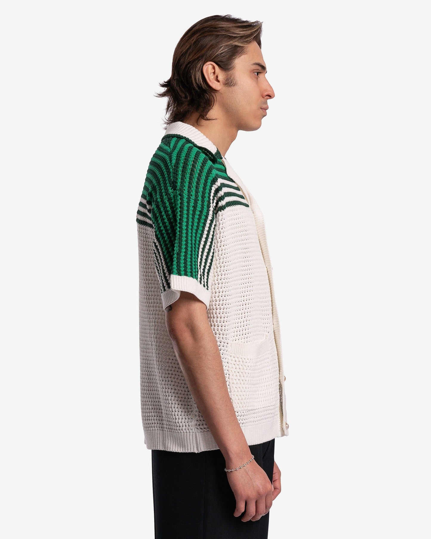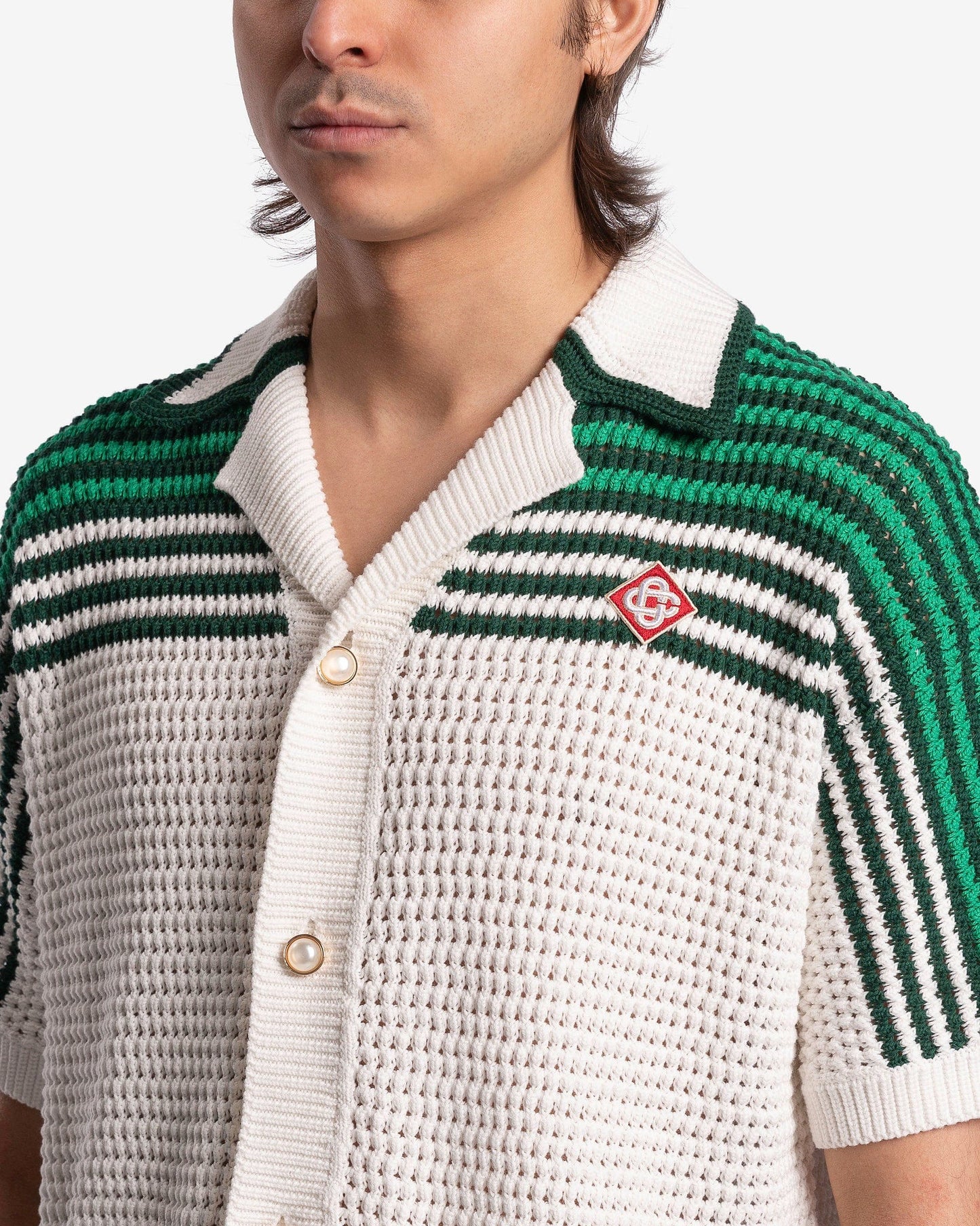 Casablanca men's cuban collared shirt in green and white. This shirt features a crocheted pattern with green stripes on the upper half and patch pockets at the waist.