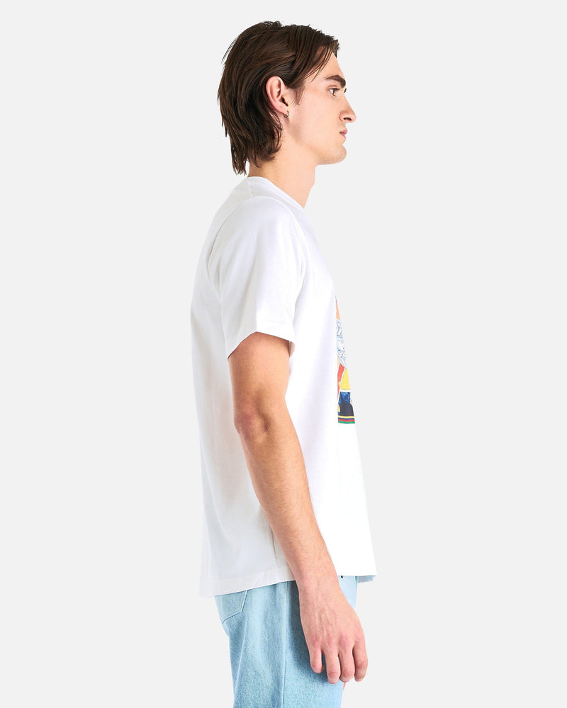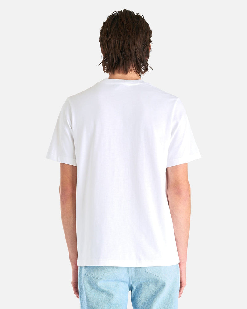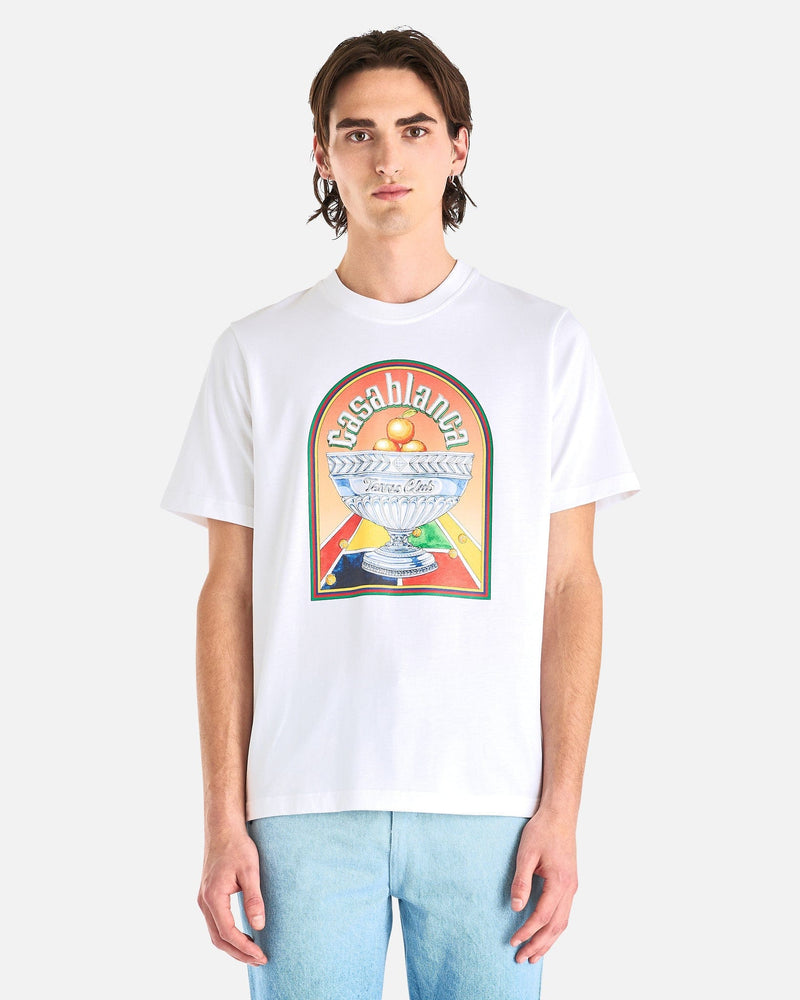 Casablanca men's graphic printed t-shirt in white. This shirt features a crew neckline, short sleeves, and a logo graphic of oranges in a bowl on the chest.