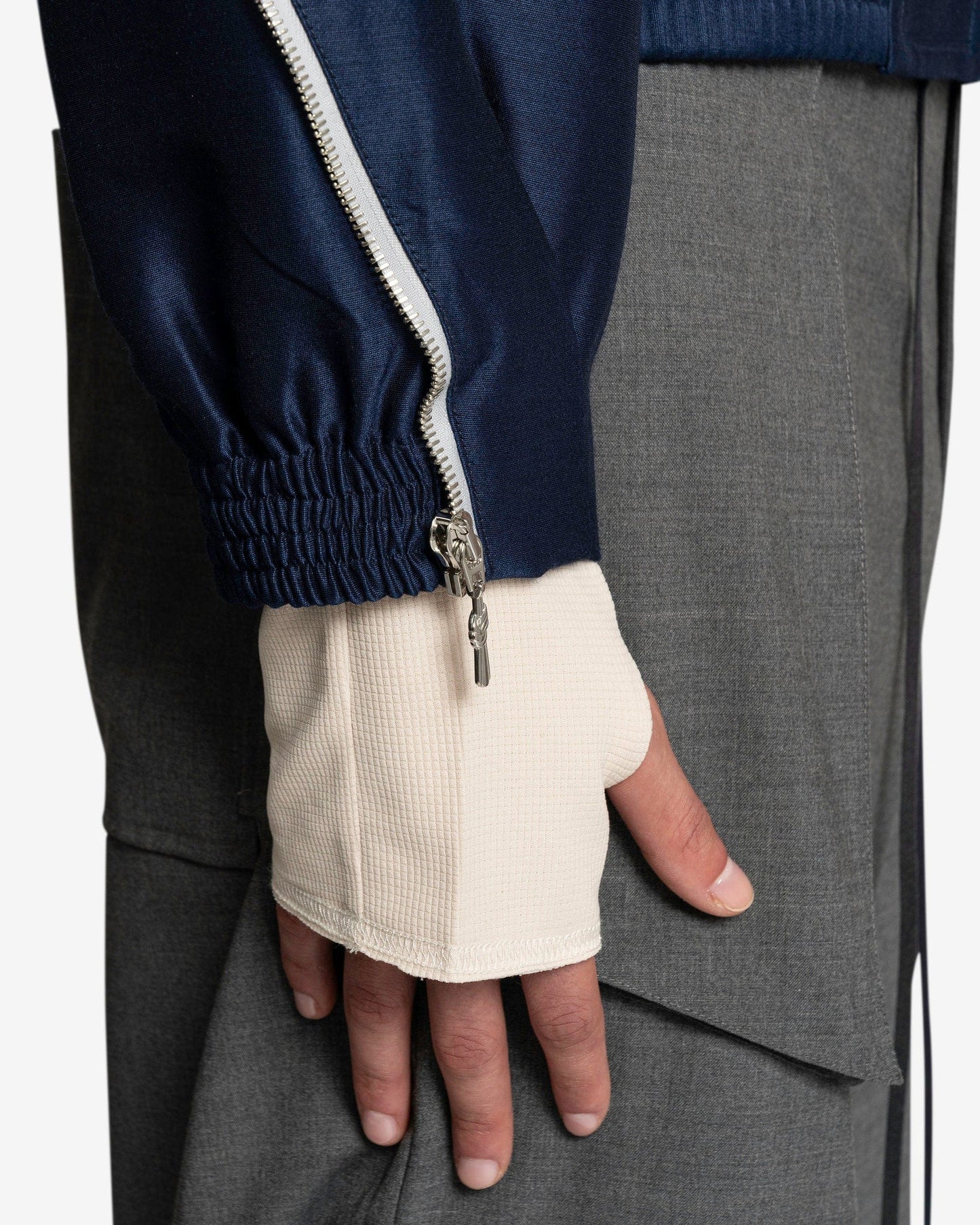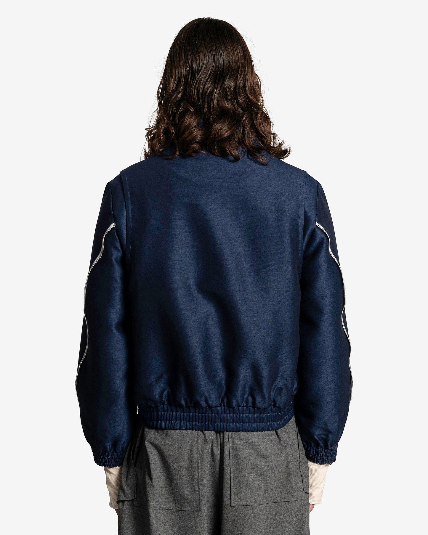 CMMAWEAR men's batwing bomber jacket in blue. This jacket features a batwing inspired collar with a piercing detail at the edge. There are zipper details along the sleeves.