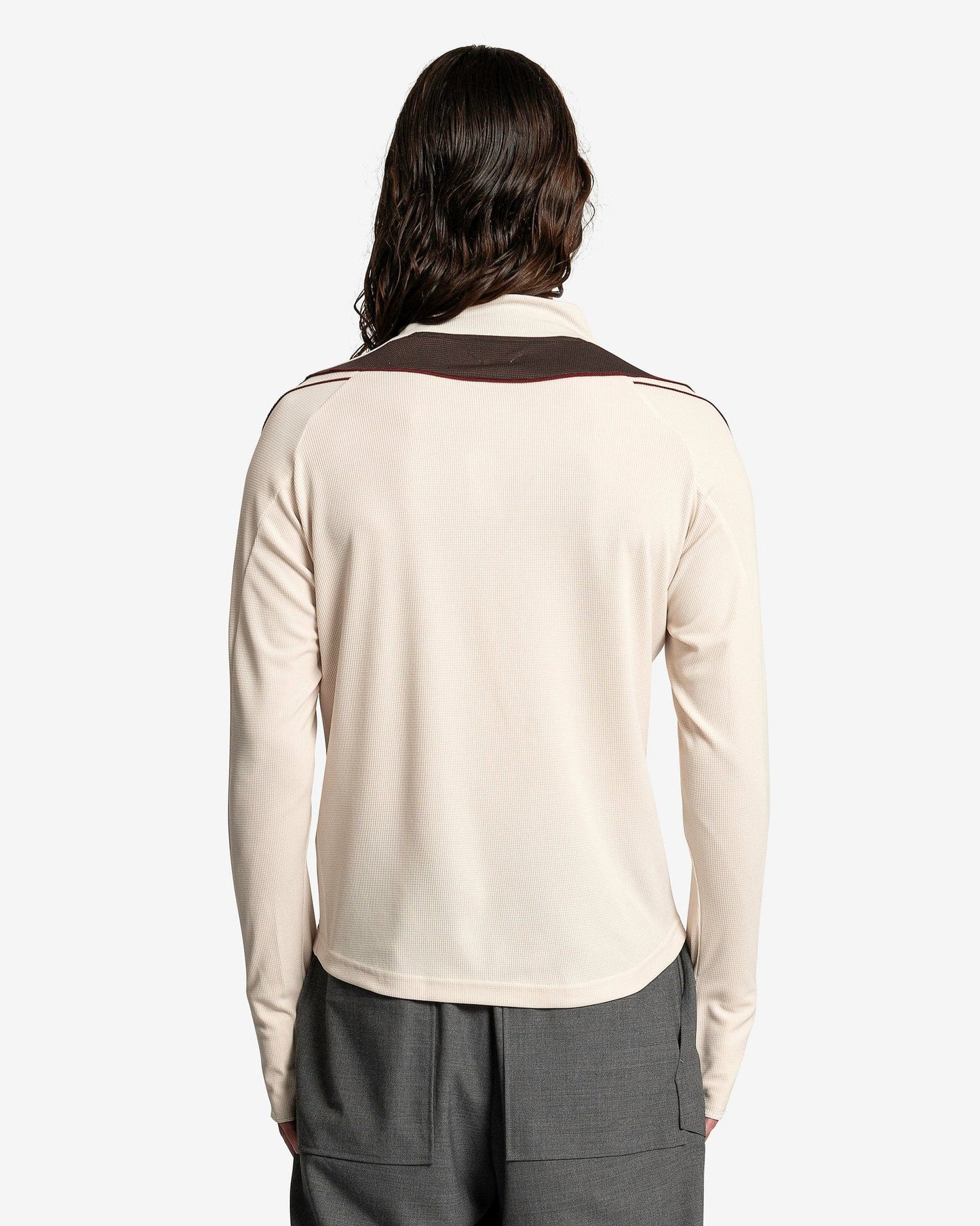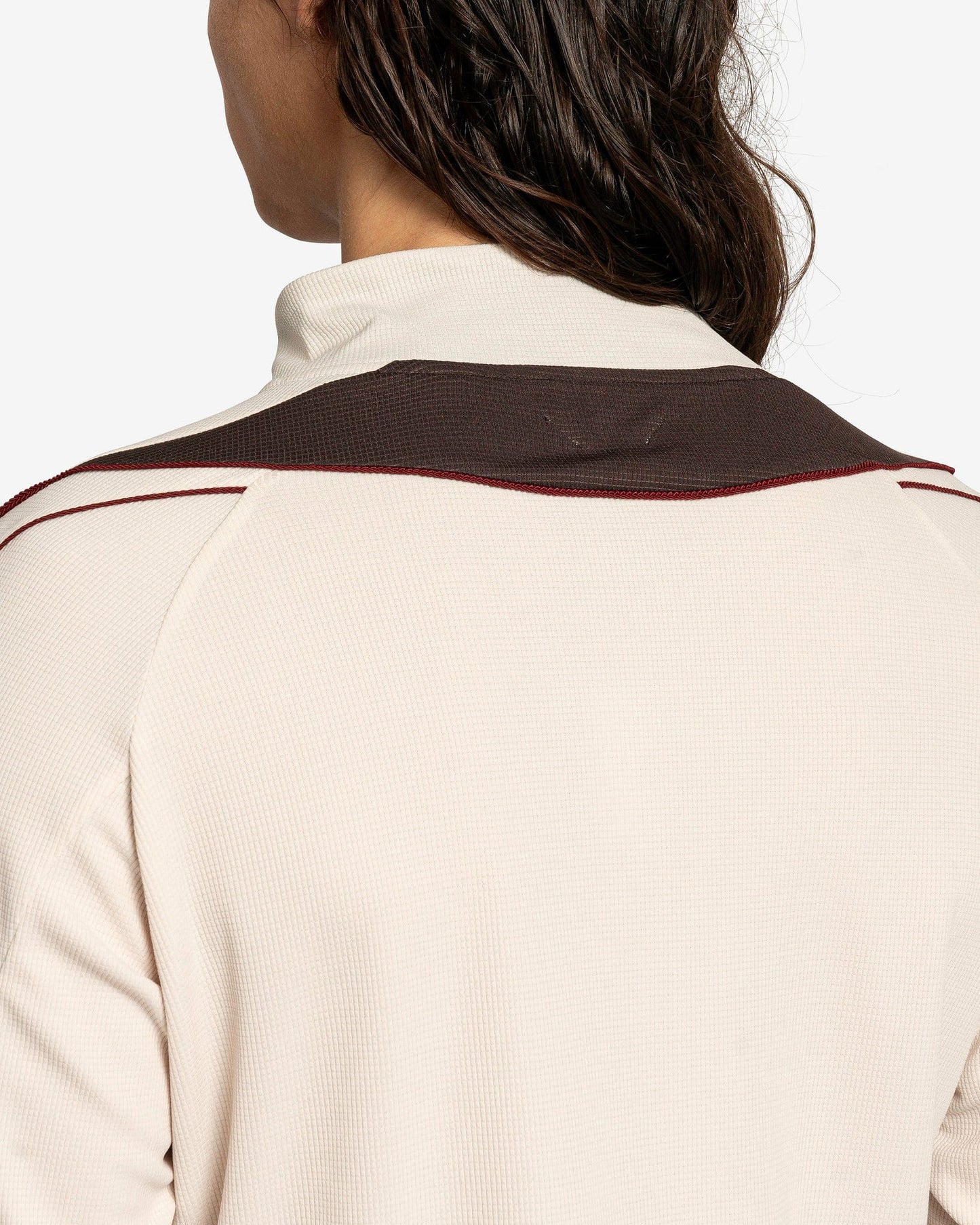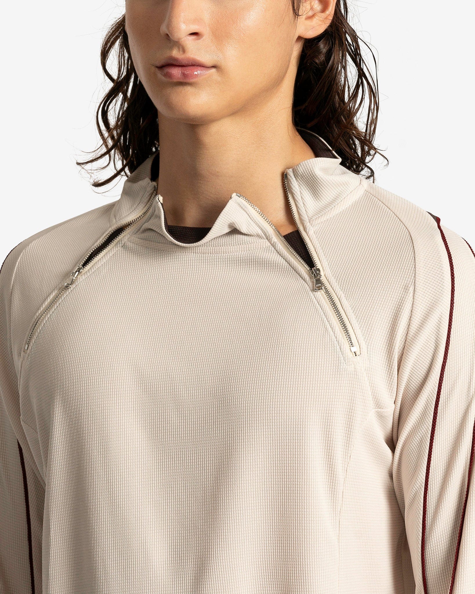 CMMAWEAR men's dual quarter zip jacket in cream. This jacket features two quarter zips at the neckline, thumb holes and a brown panel detail with piping.