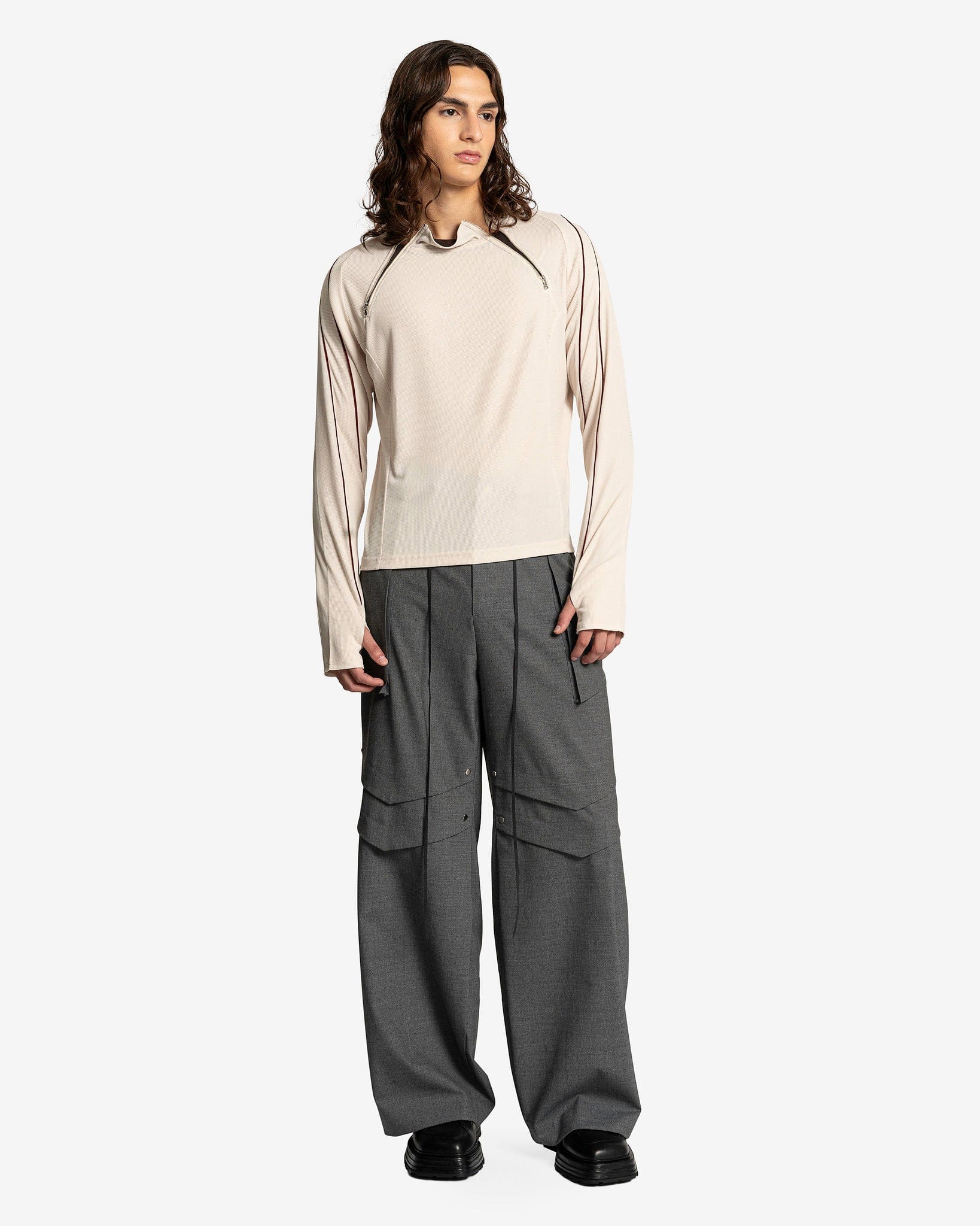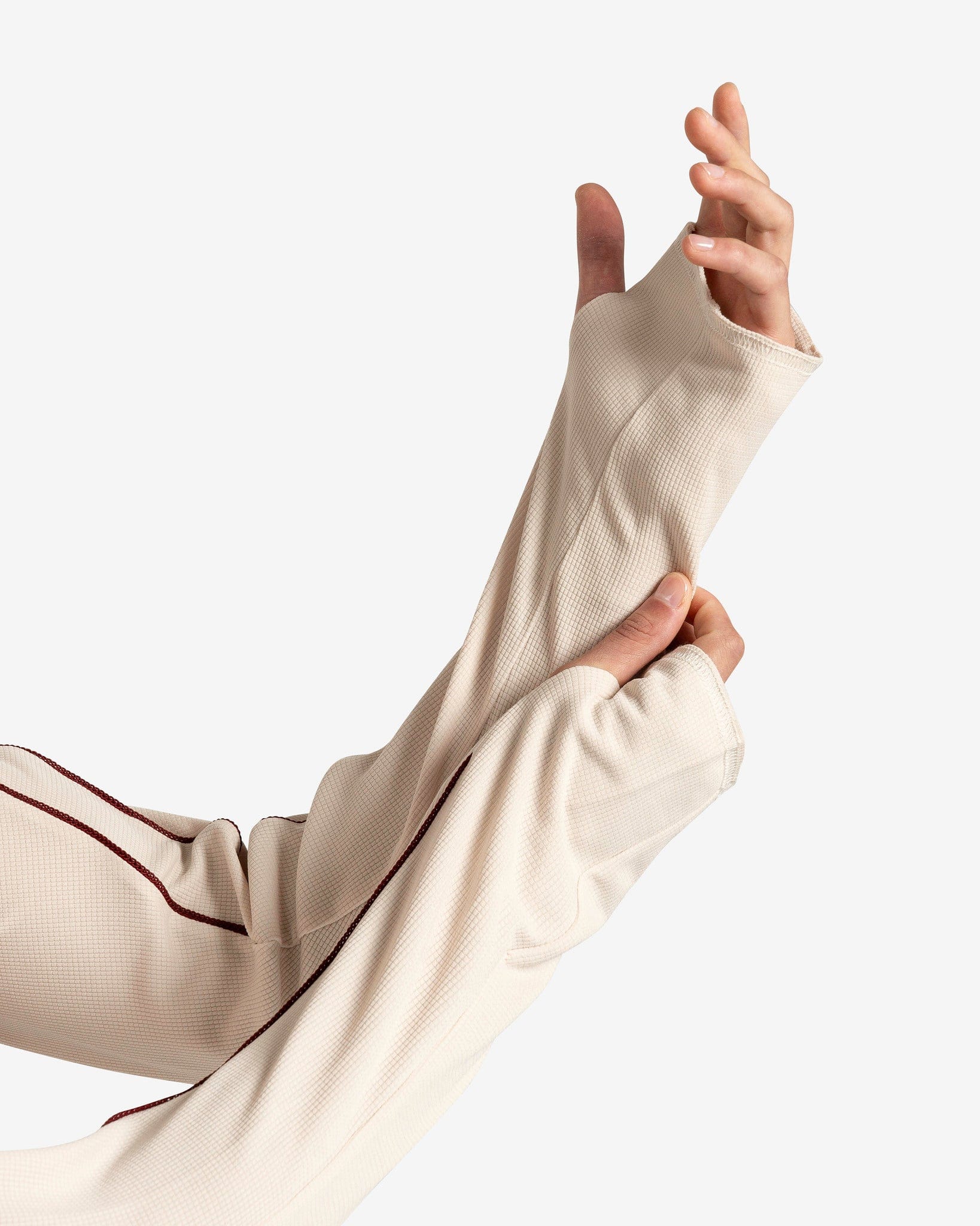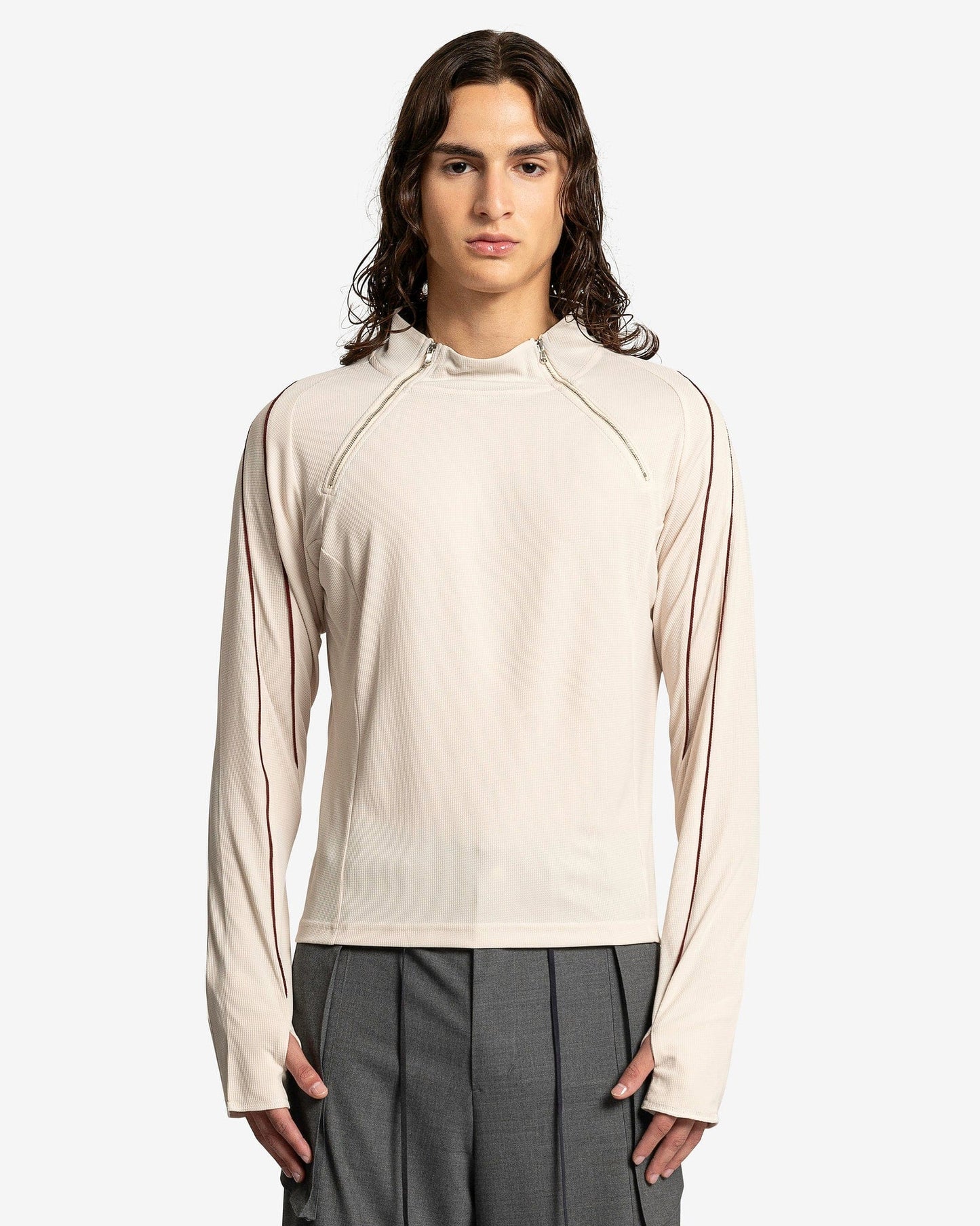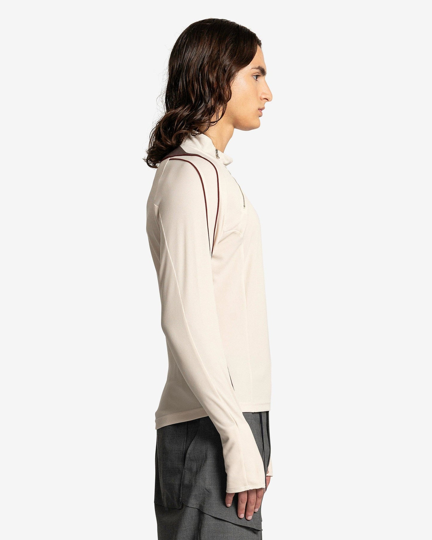 CMMAWEAR men's dual quarter zip jacket in cream. This jacket features two quarter zips at the neckline, thumb holes and a brown panel detail with piping.