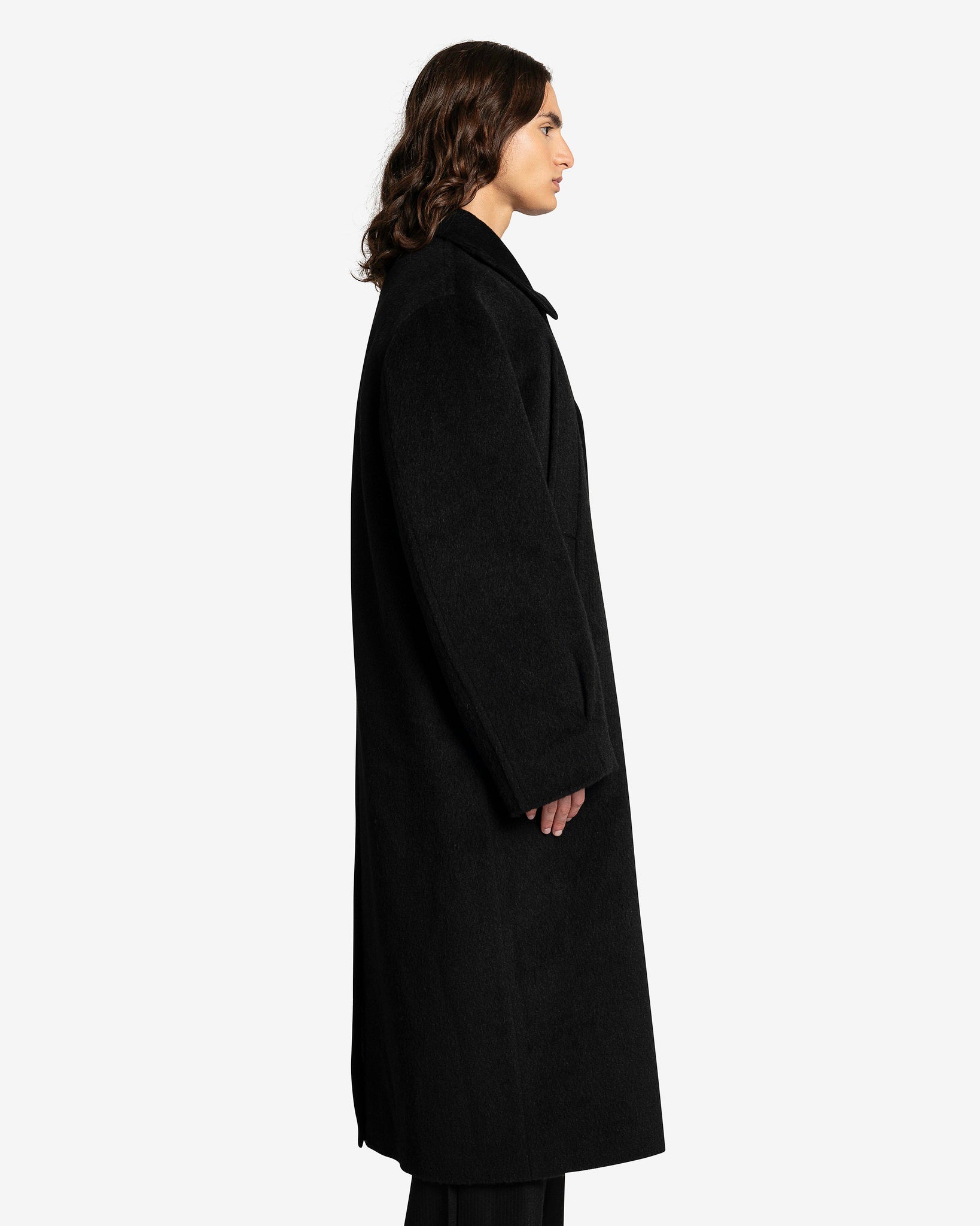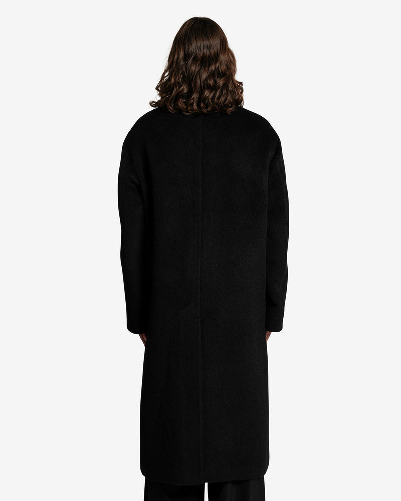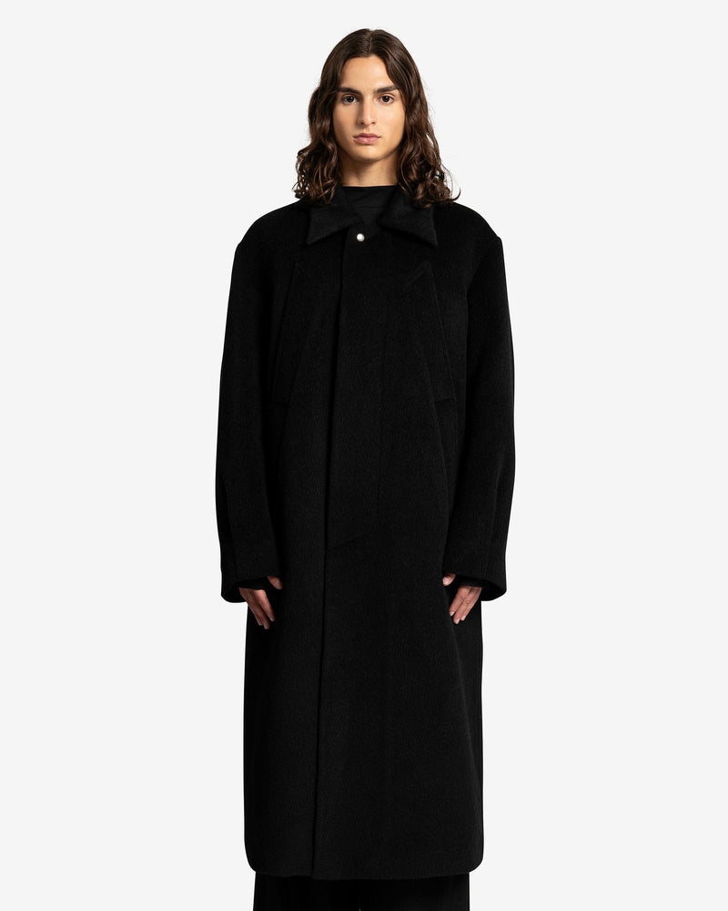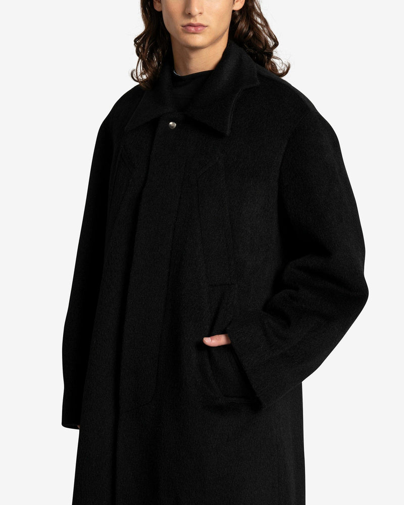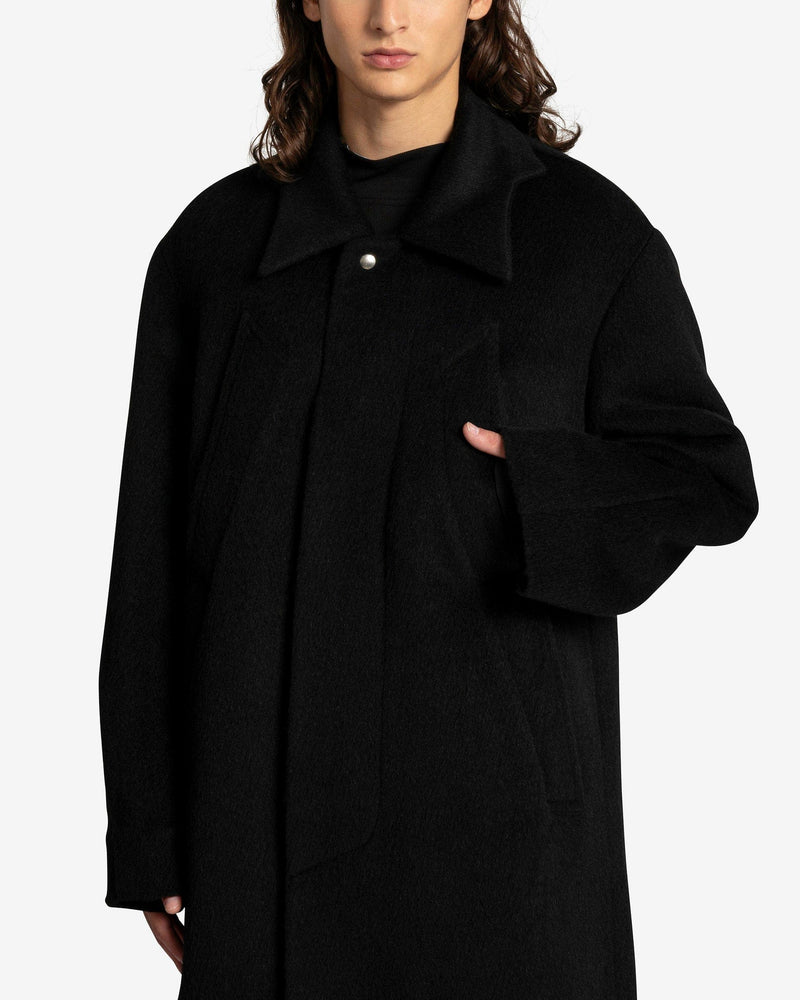 CMMAWEAR SVRN exclusive trench coat in black. This coat features a spread collar, concealed front button closure, oversized welt pockets at the chest and a central seam down the back.
