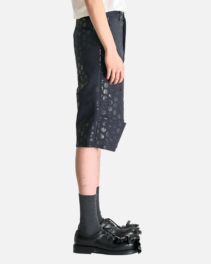Comme des Garçons HOMME PLUS Polka Dot Shorts in Black. These shorts are crafted from a nylon blend fabric with a very soft hand feel. The shorts feature a zip closure with button fastening, 4-pocket styling polyurethane polka dot print and layered cuffed hem detail.