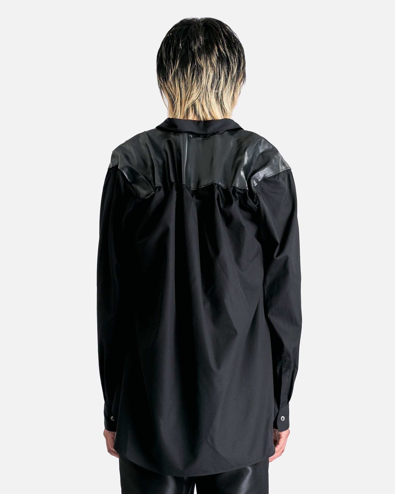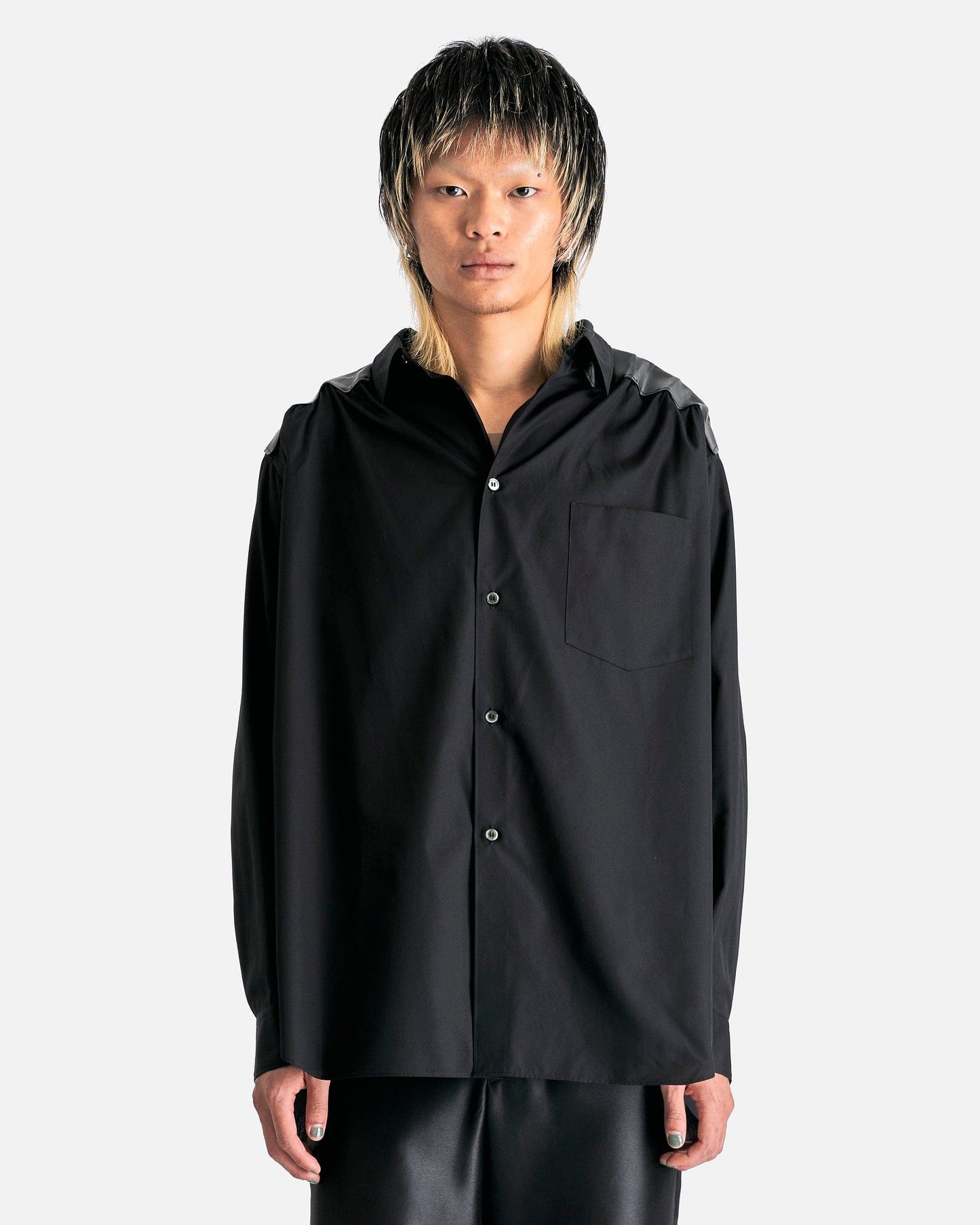 Comme des Garçons HOMME PLUS Gathered Panel Shirt in Black. This shirt features a classic collar, button closure, faux leather shoulder yoke and gathered dropped shoulders.