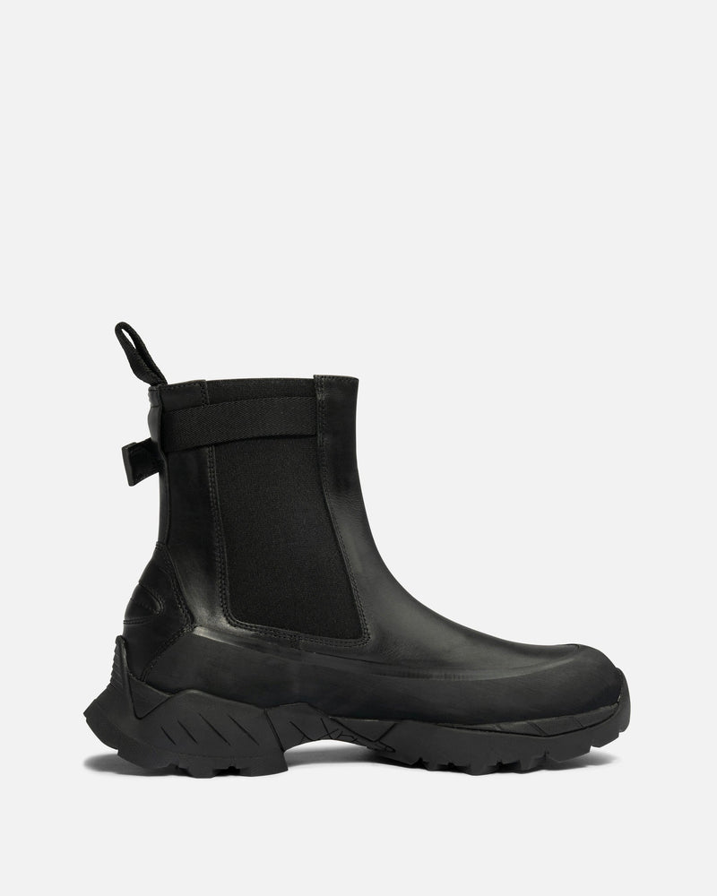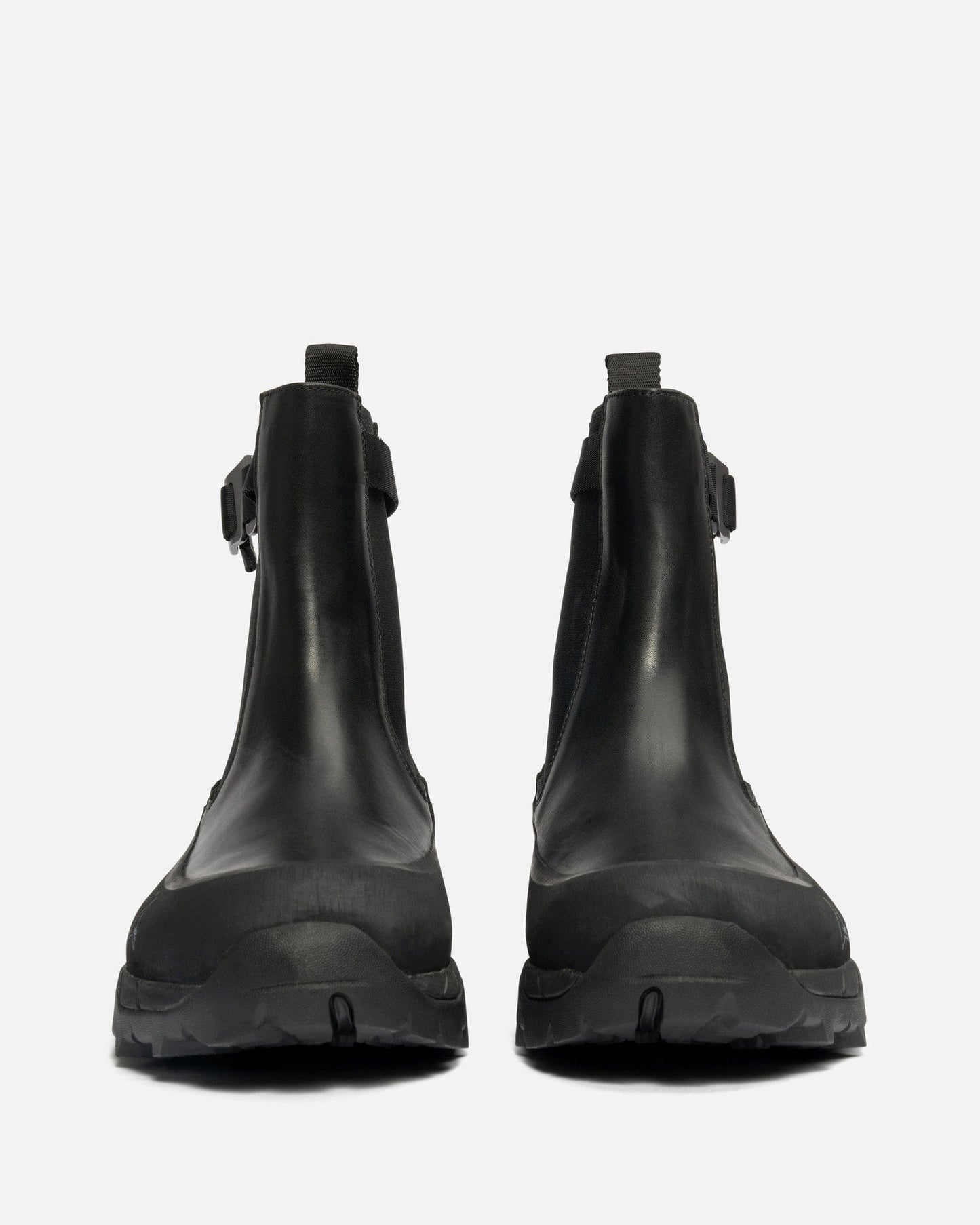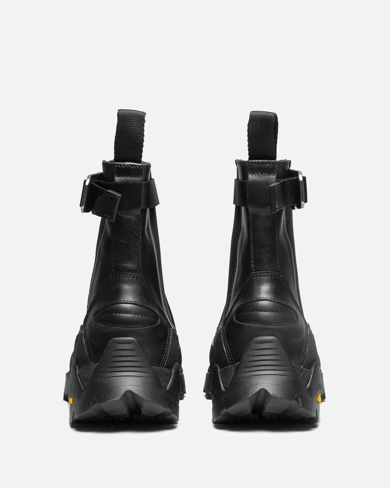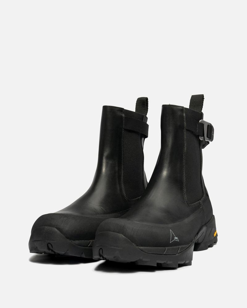 ROA women's chelsea boots in black. These ankle length boots are paneled with calfskin and have a buckle detail at the top.