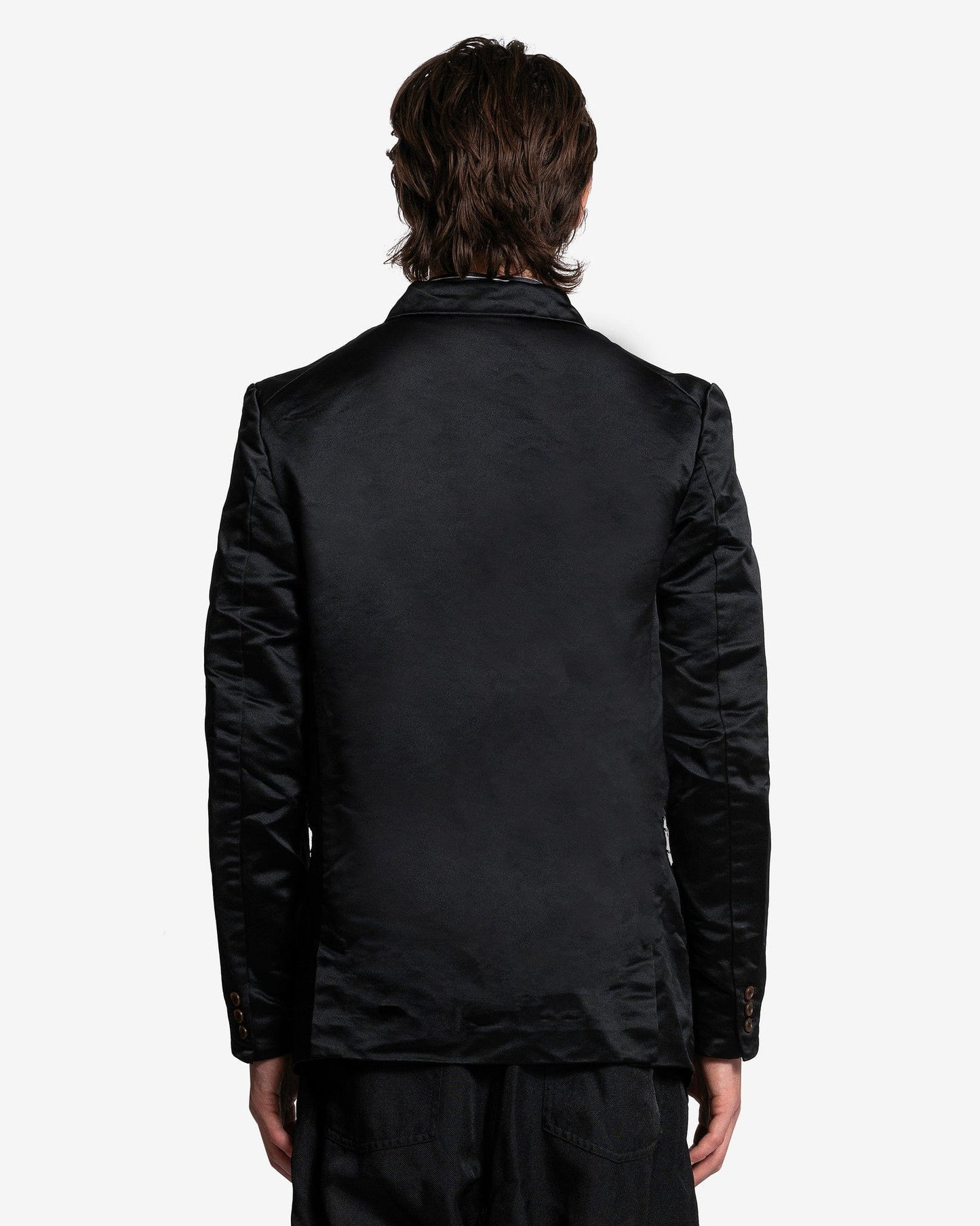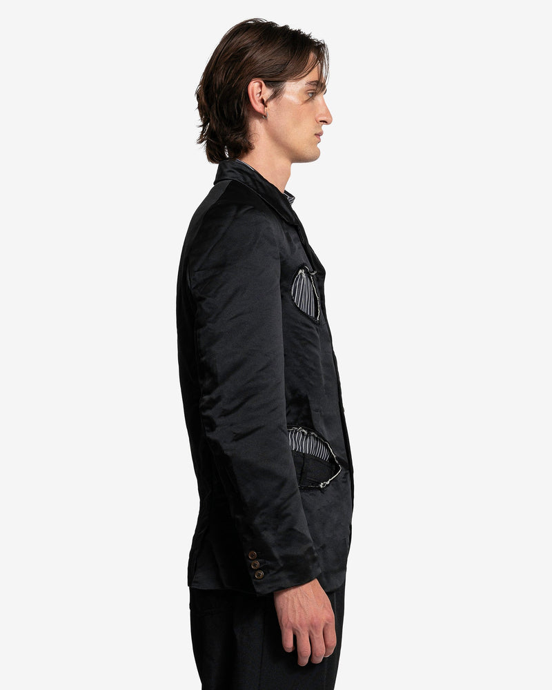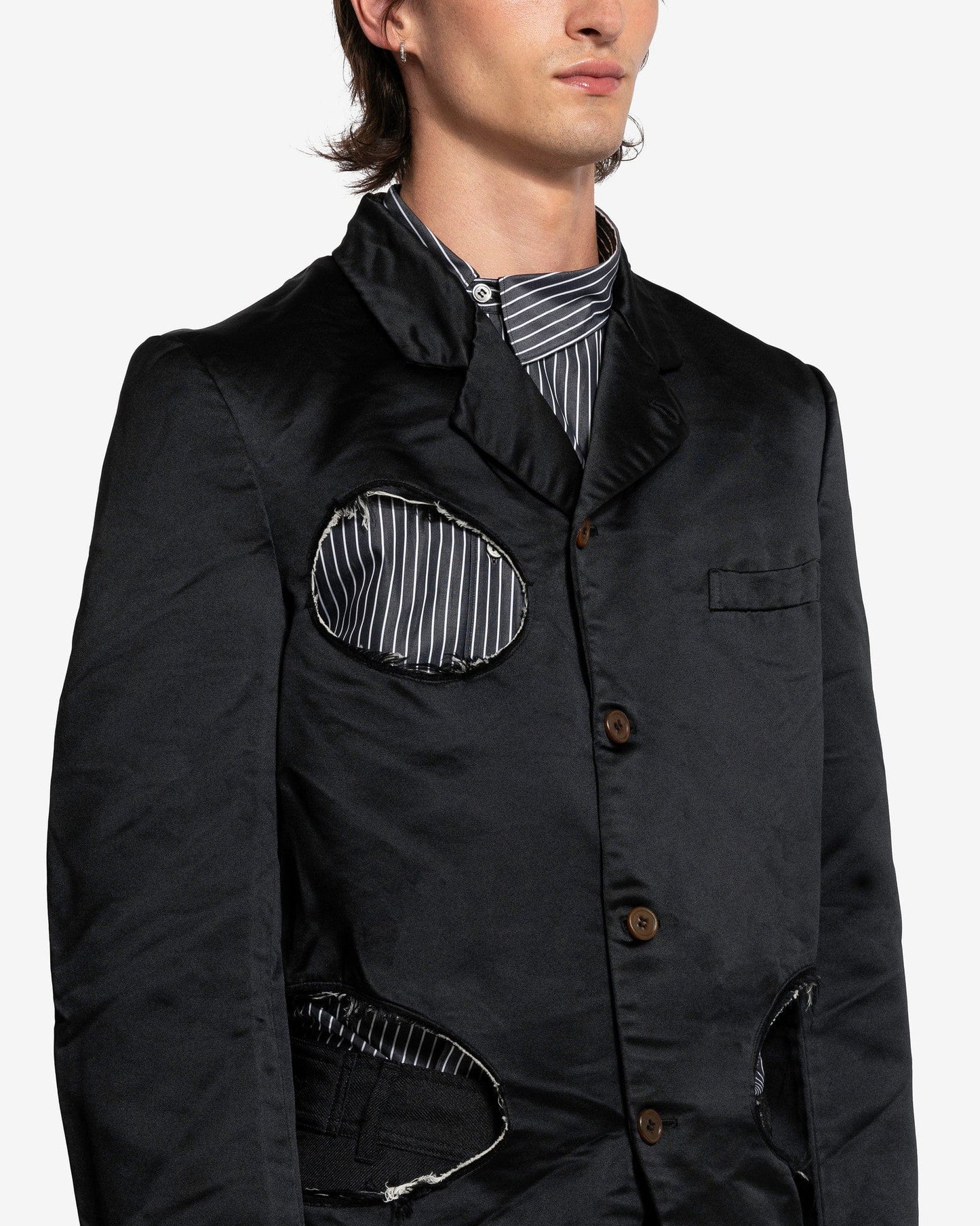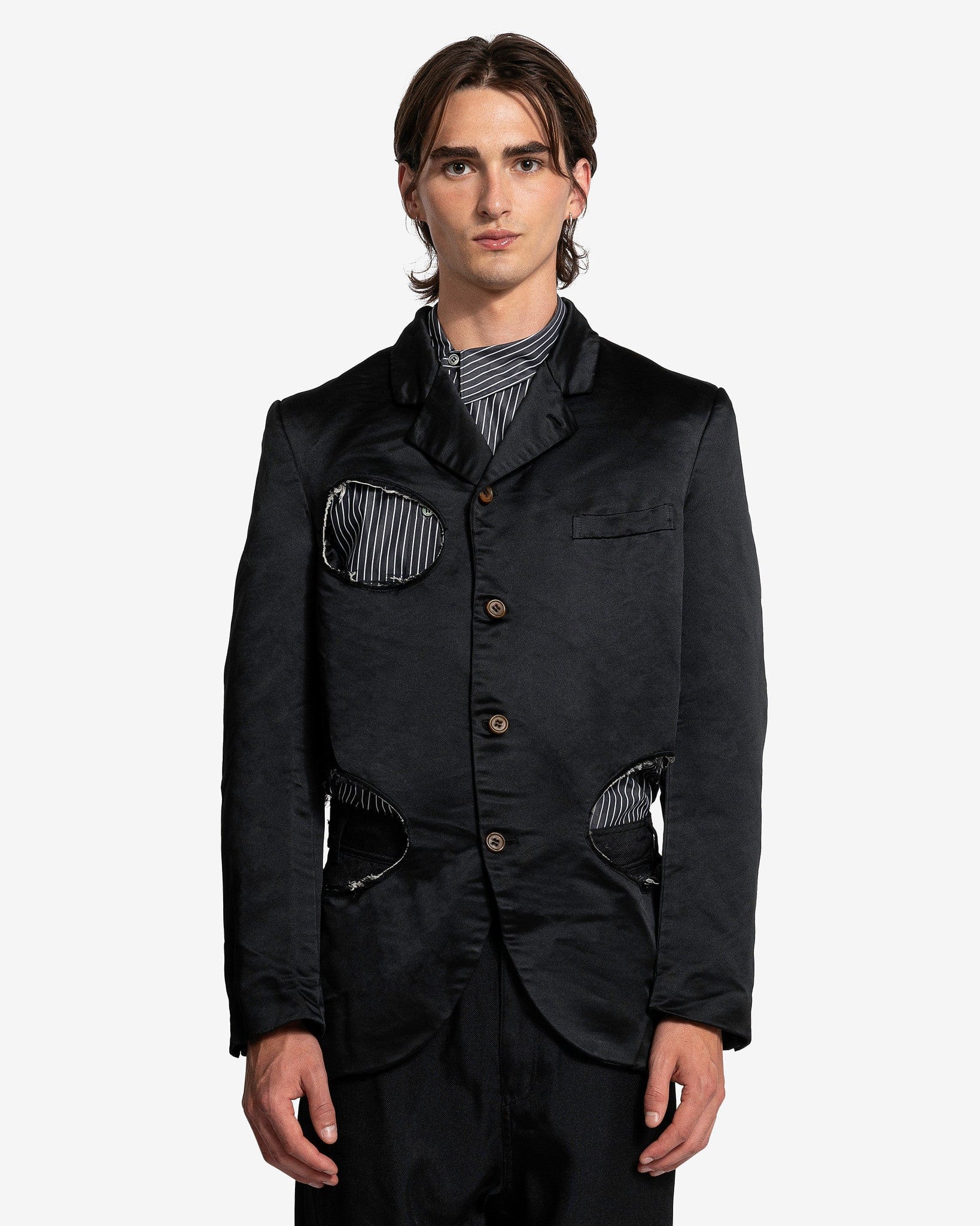 BLACK Comme des Garçons men's cutout blazer in black. This blazer features a notched lapel and cutout details with raw edges.