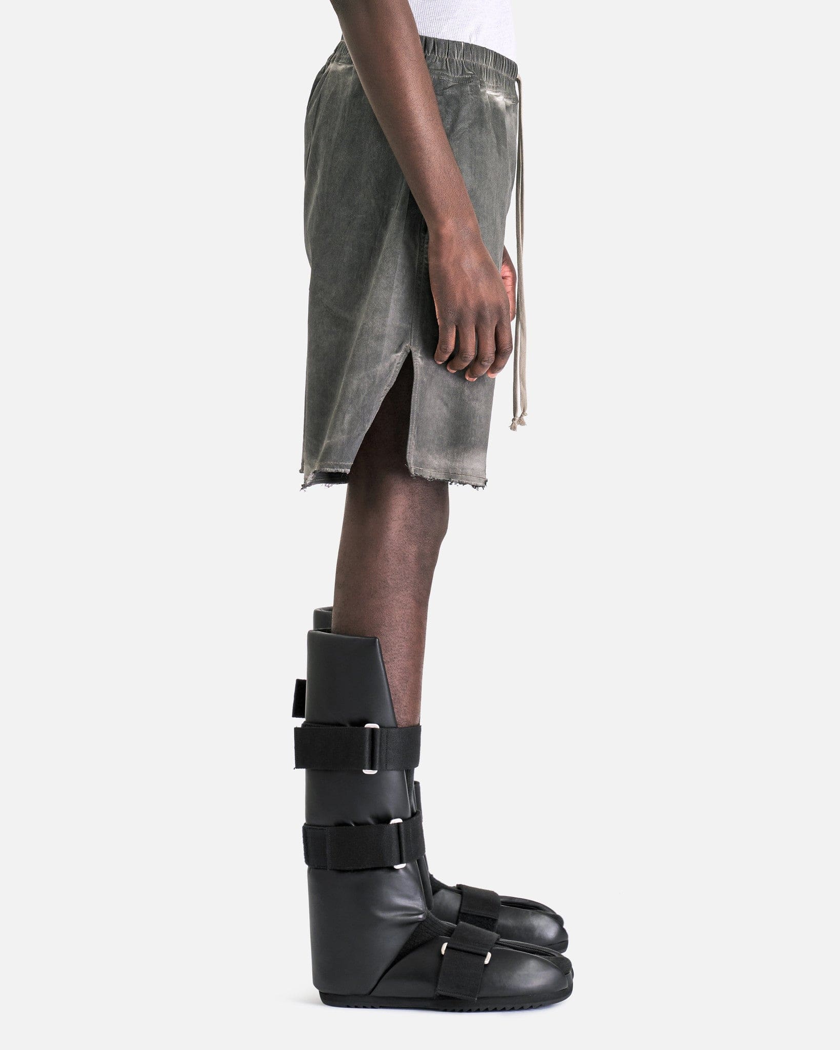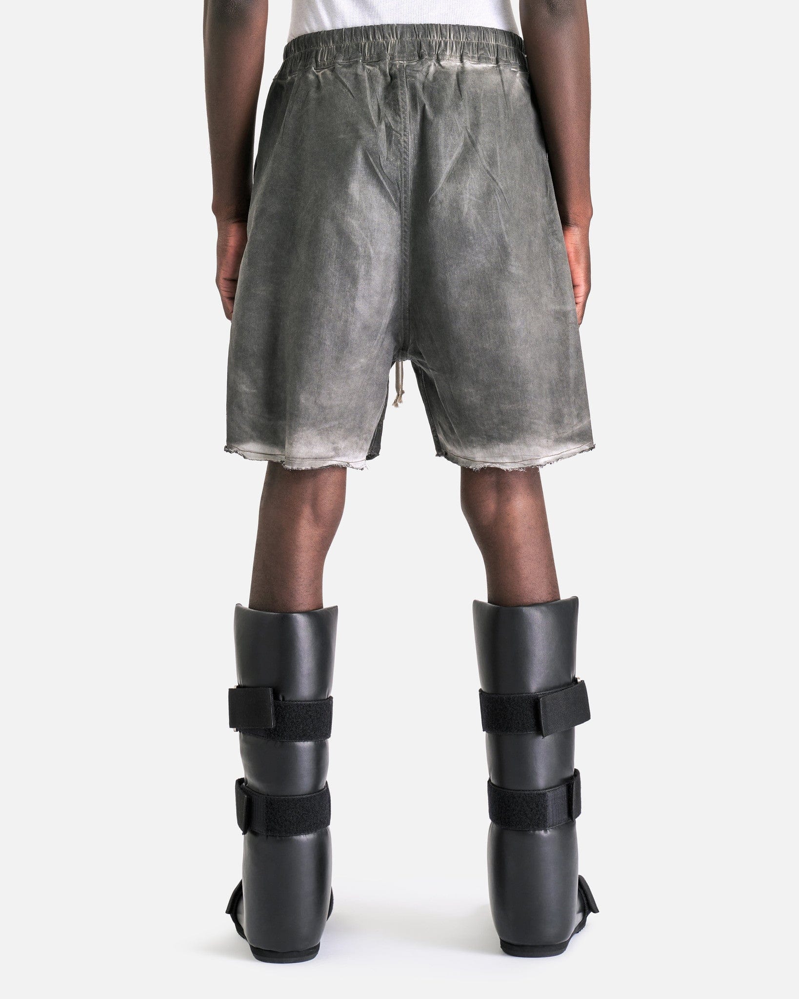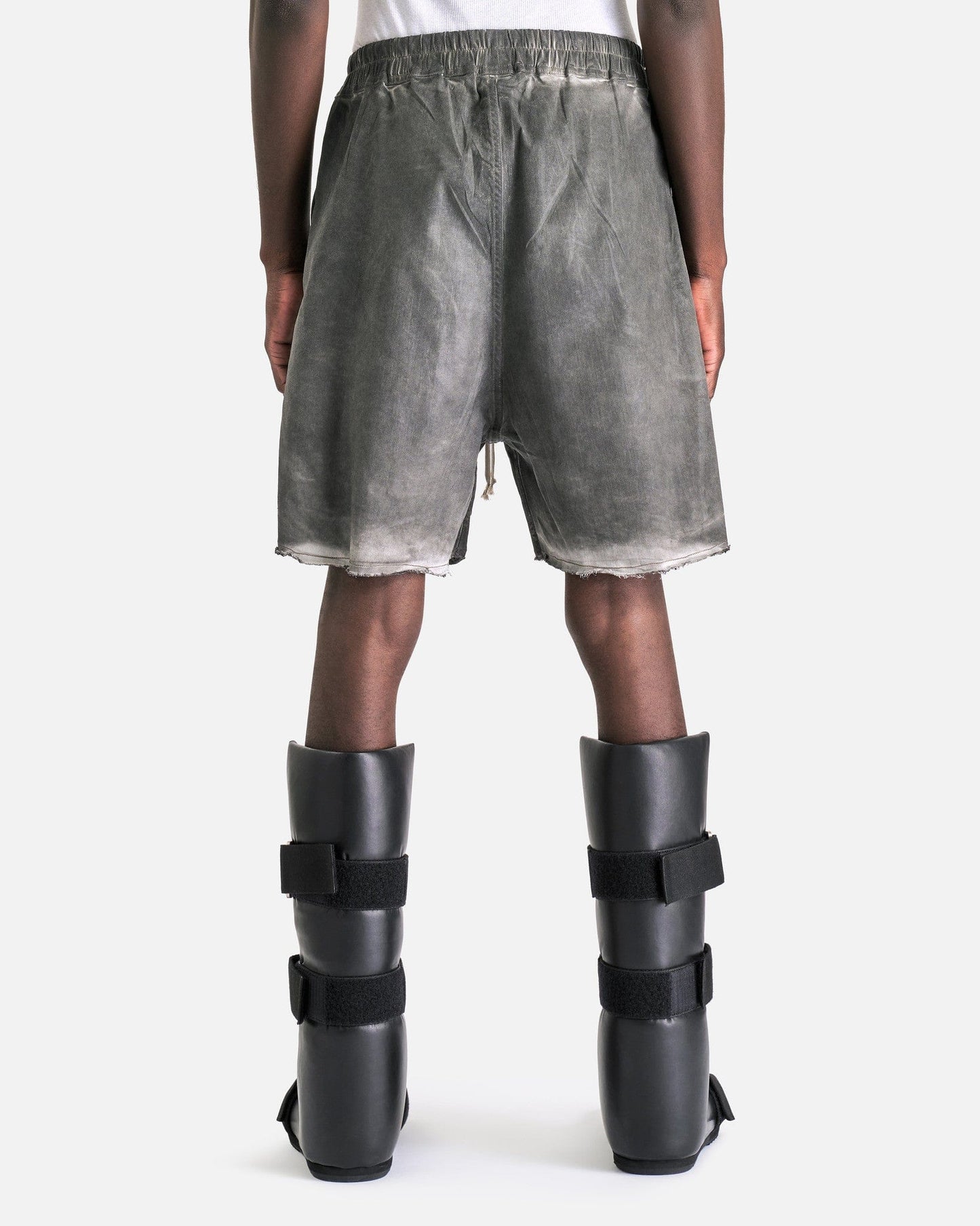 Rick Owens Denim Long Boxer Shorts in Dark Dust. These shorts feature an elasticated waist, slightly dropped inseam, side welt pockets and beveled side splits. This lightweight stretch denim is overdyed with a clear foil overlay that creates the waxy touch.