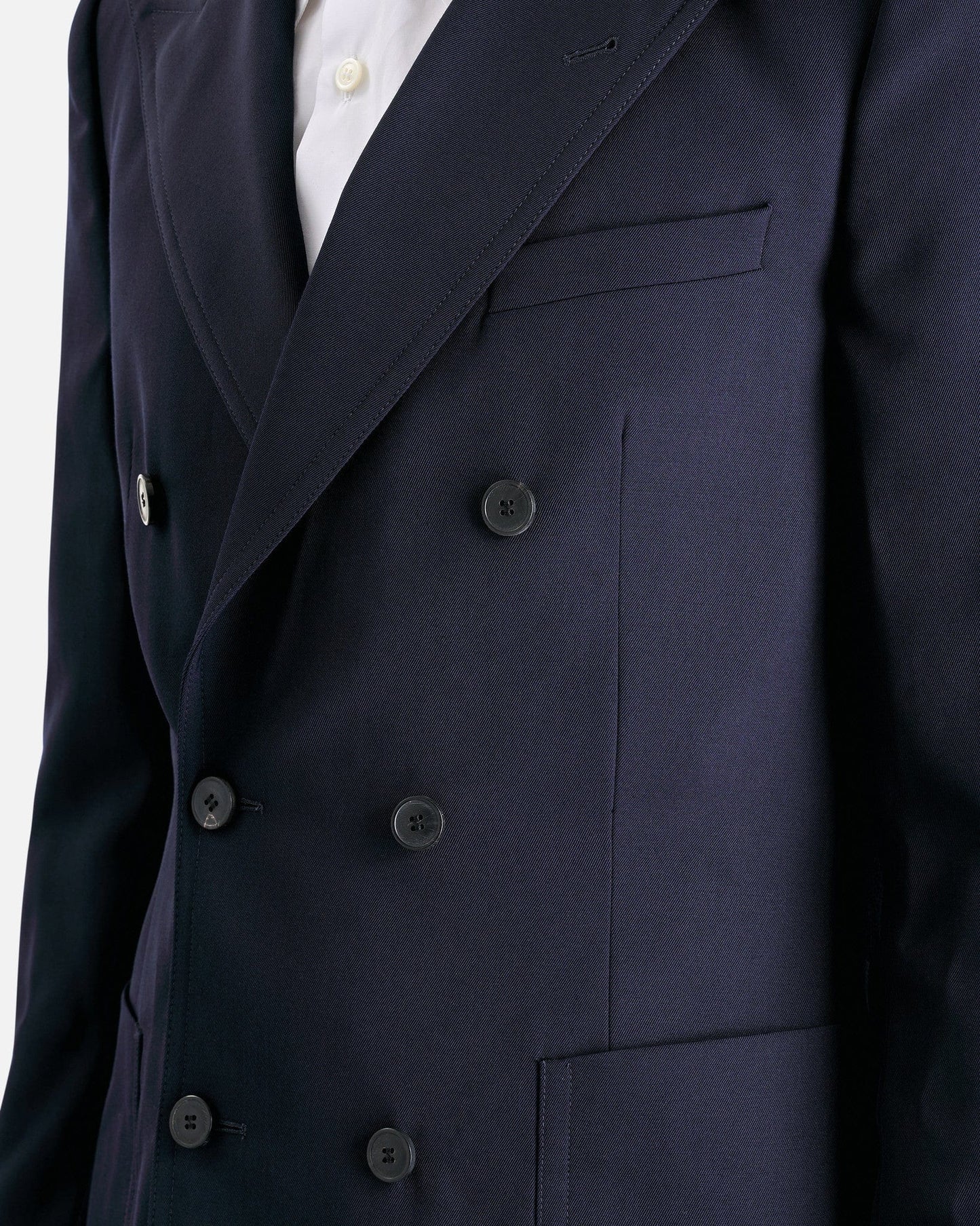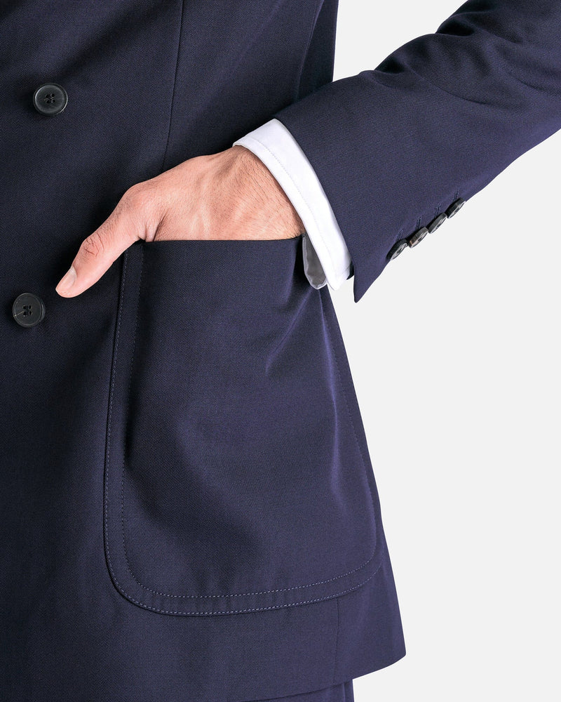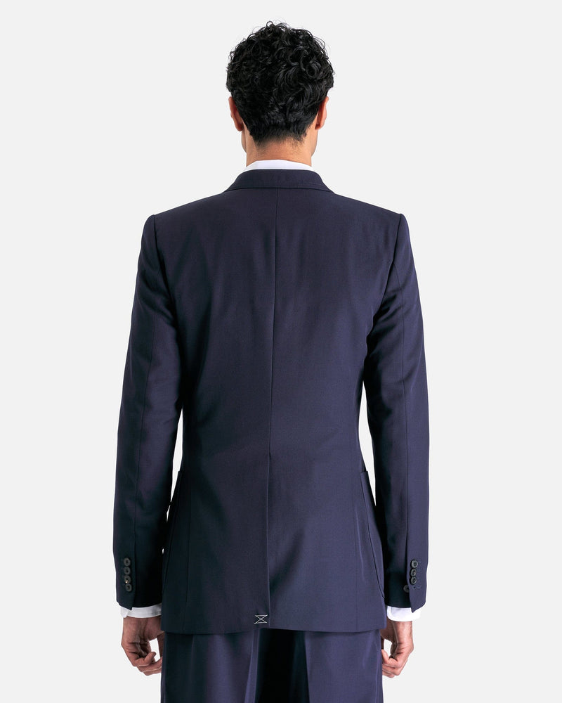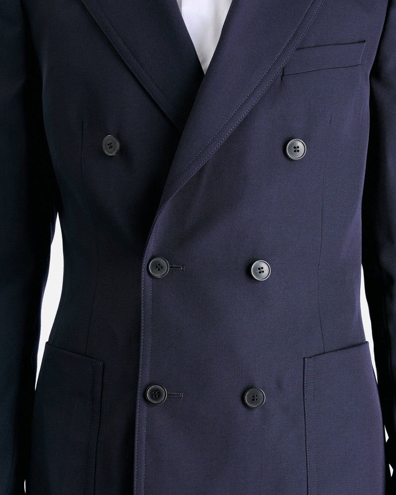 Dries Van Noten Bruce Jacket in Navy. This jacket features peaked lapels, double-breasted button closure, welt pocket and patch pockets, front darts, padded shoulders and central back vent.