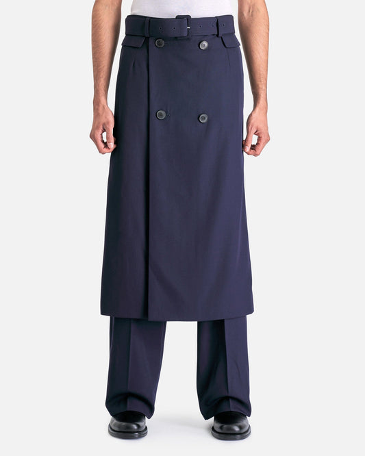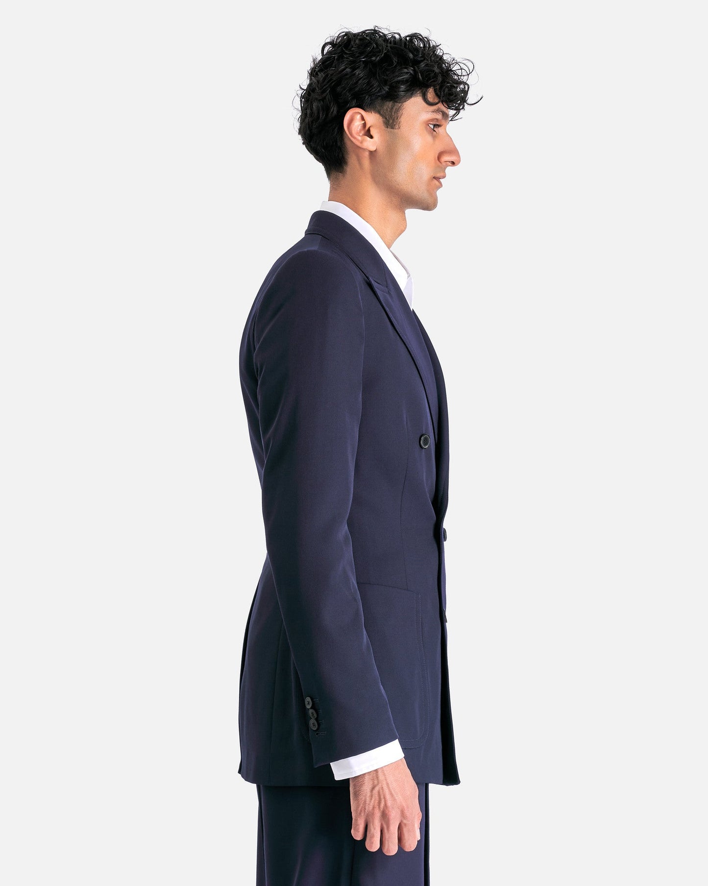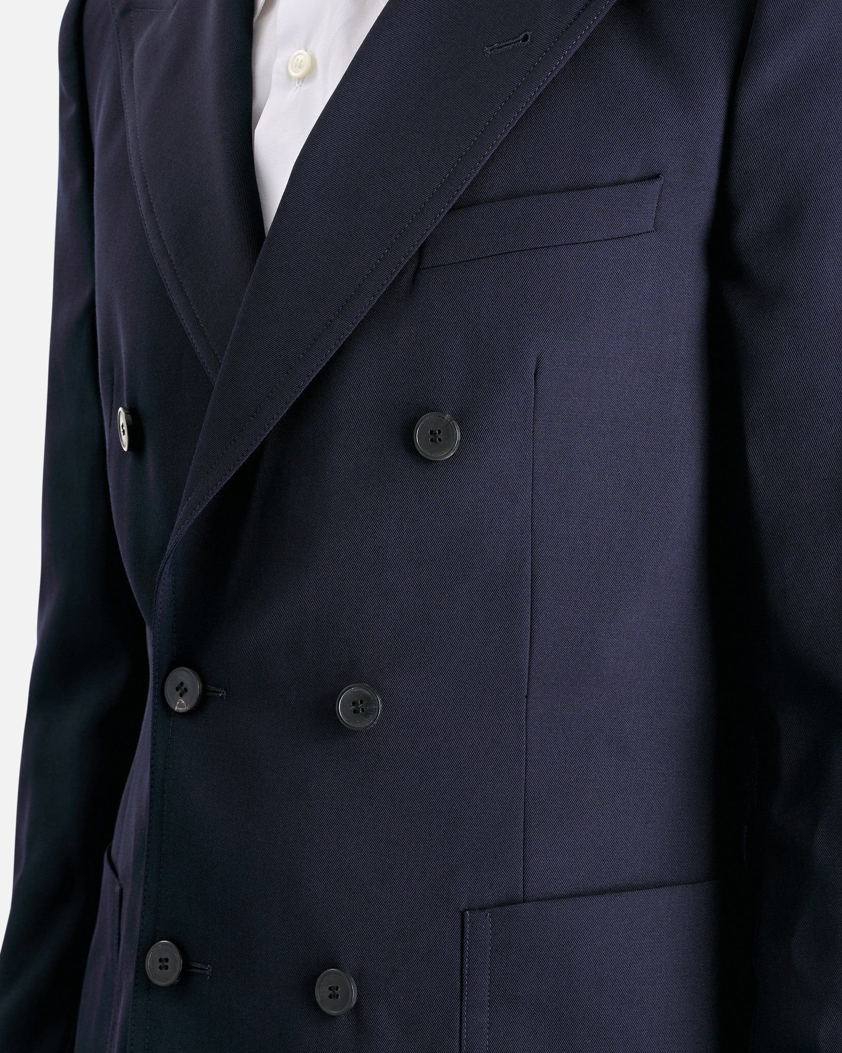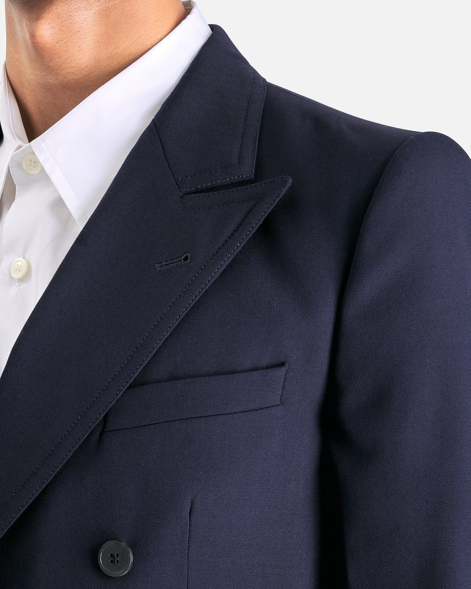 Dries Van Noten Bruce Jacket in Navy. This jacket features peaked lapels, double-breasted button closure, welt pocket and patch pockets, front darts, padded shoulders and central back vent.