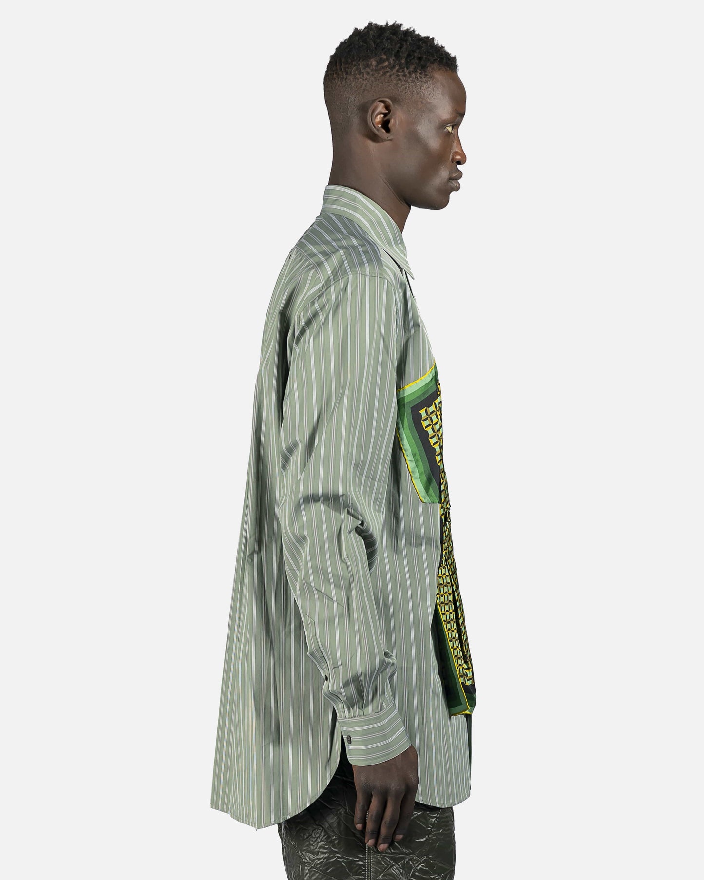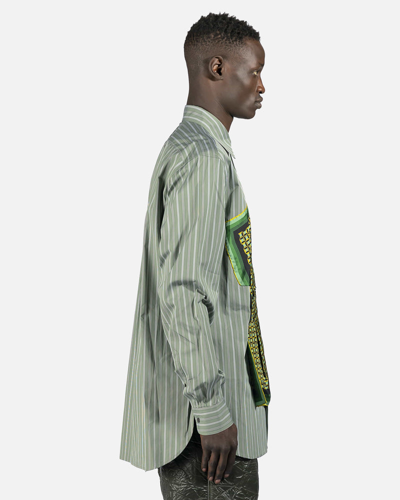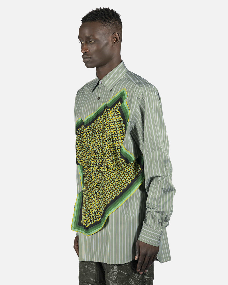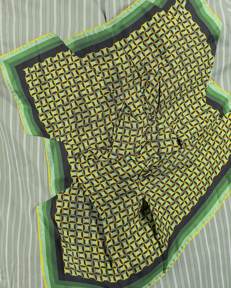Long sleeve cotton poplin shirt striped in green and white. Spread collar. Button closure and integrated silk twill scarf-style overlay featuring graphic pattern in multicolor at front. Adjustable single-button barrel cuffs. Shirttail hem. Central box pleat at back. Tonal hardware.