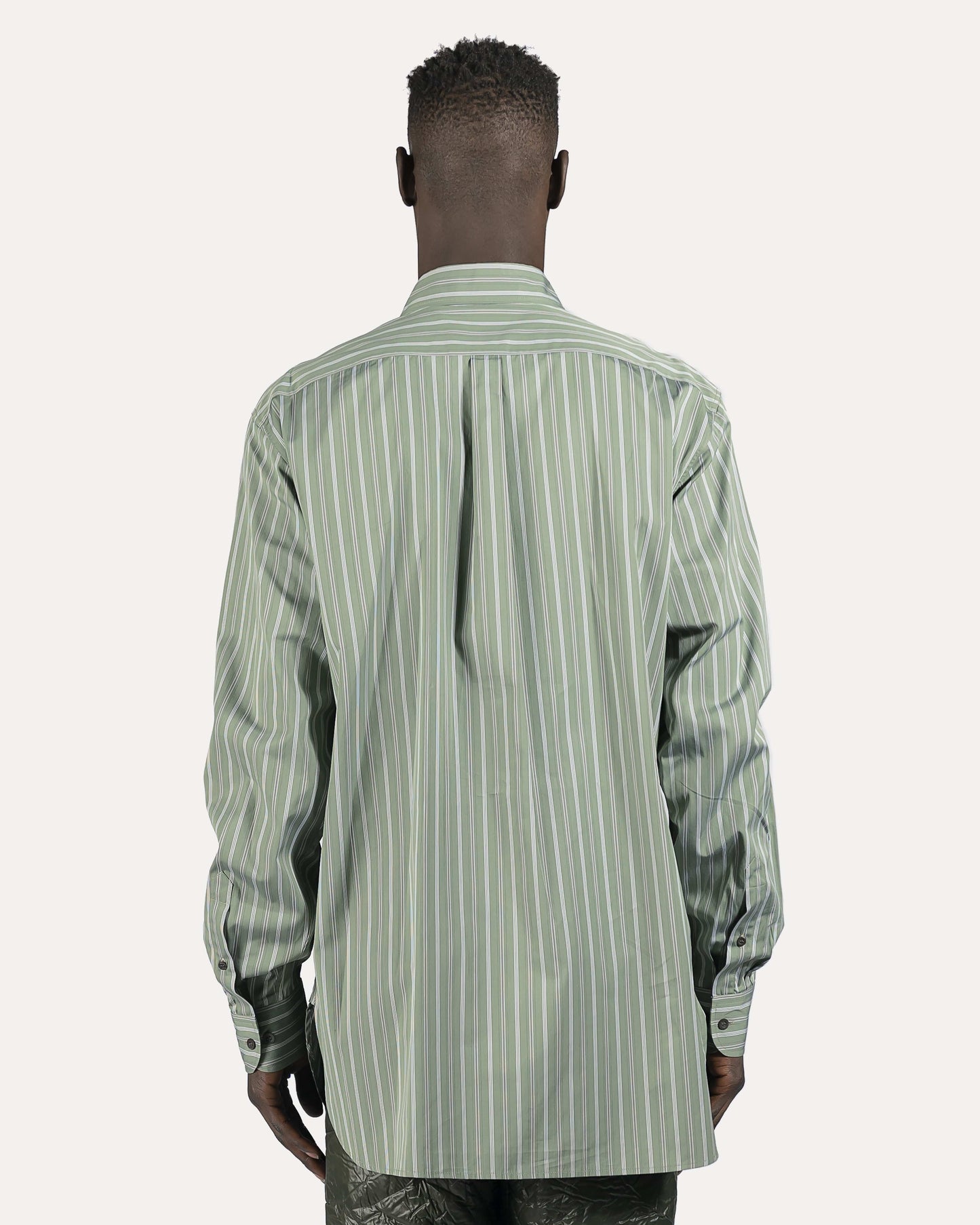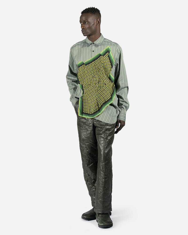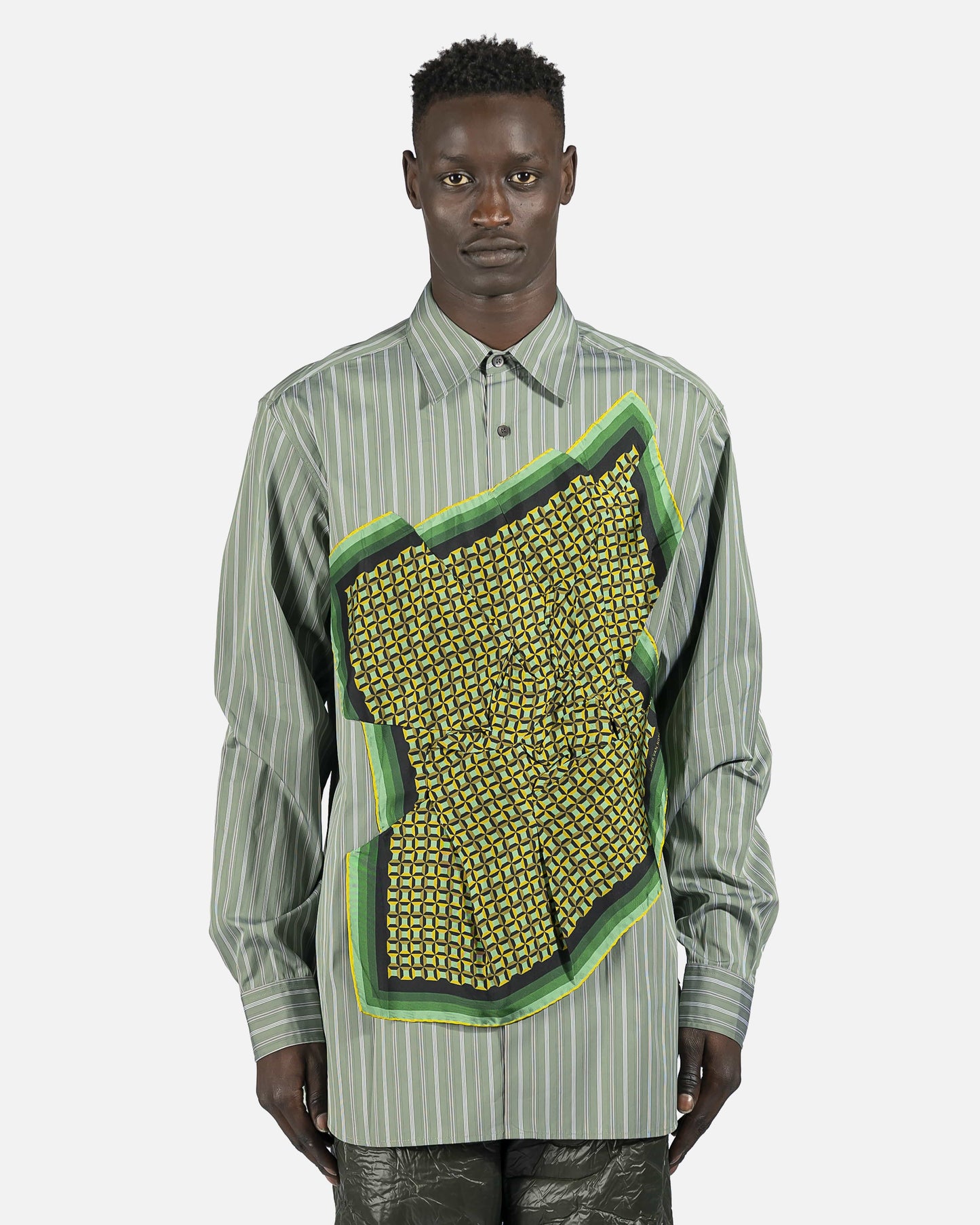 Long sleeve cotton poplin shirt striped in green and white. Spread collar. Button closure and integrated silk twill scarf-style overlay featuring graphic pattern in multicolor at front. Adjustable single-button barrel cuffs. Shirttail hem. Central box pleat at back. Tonal hardware.