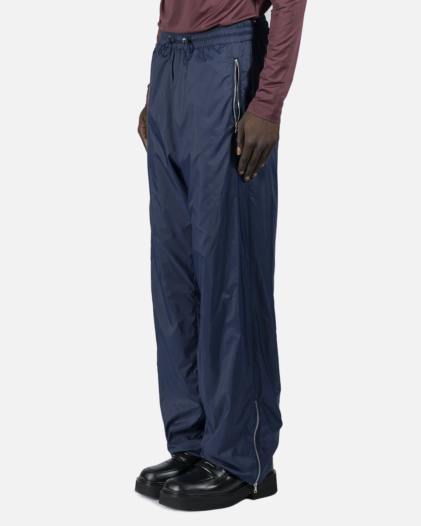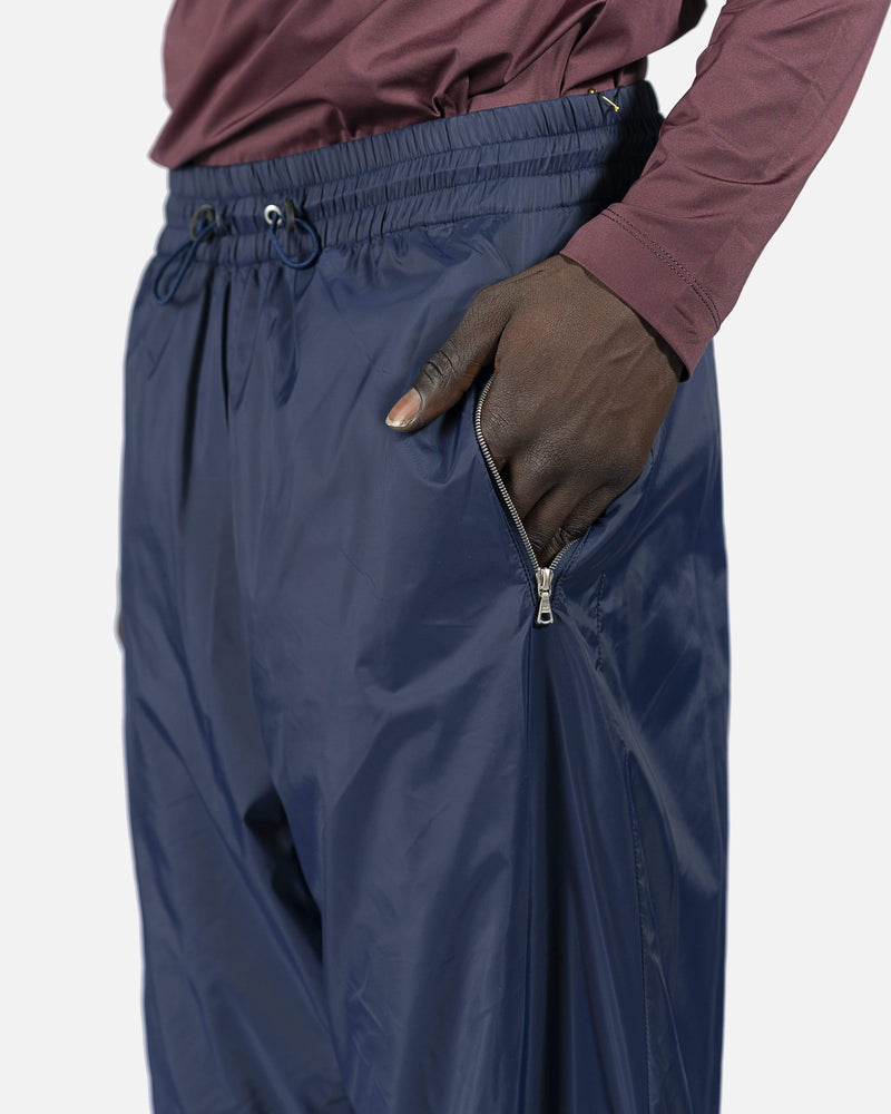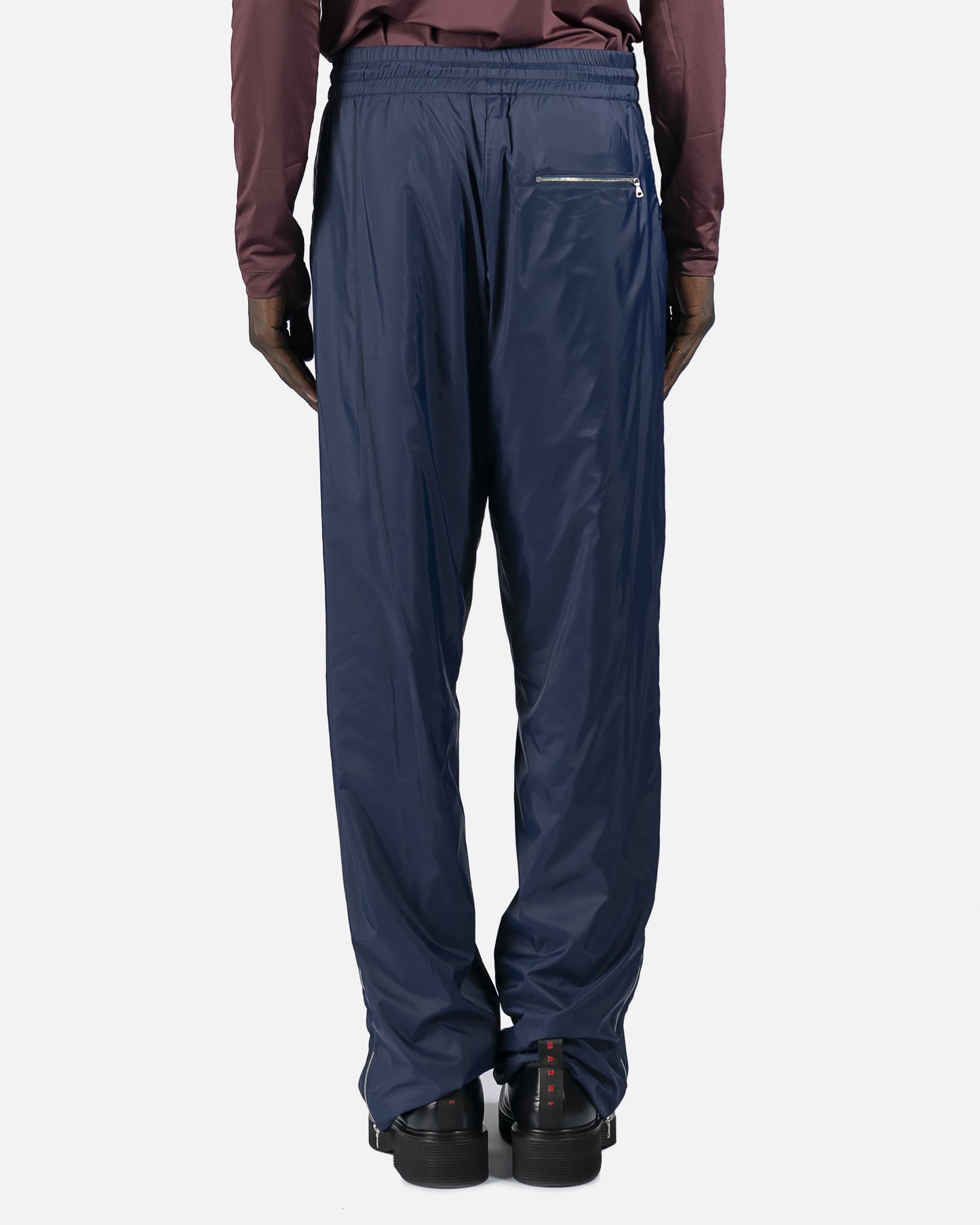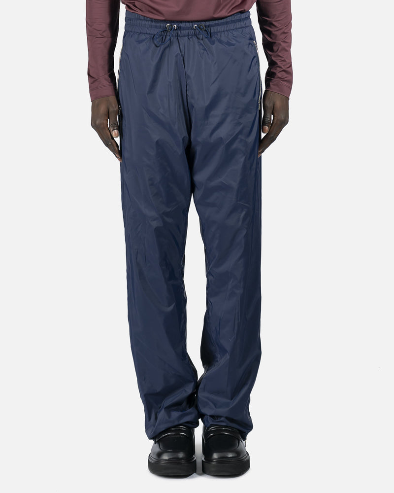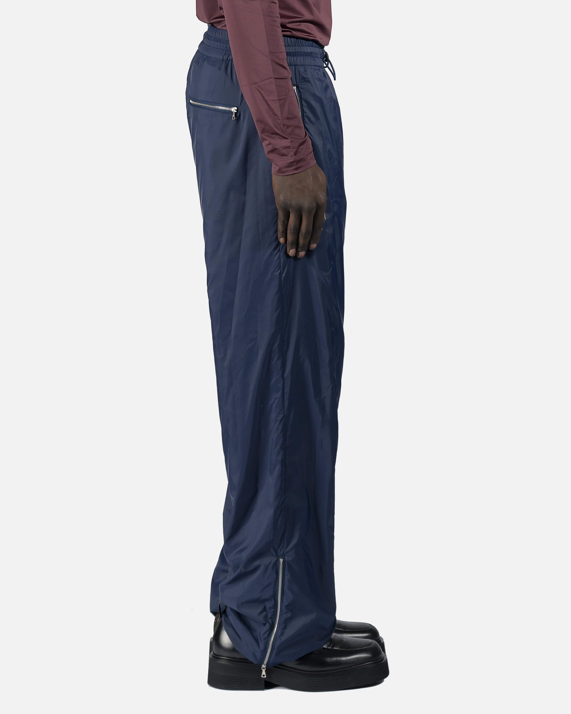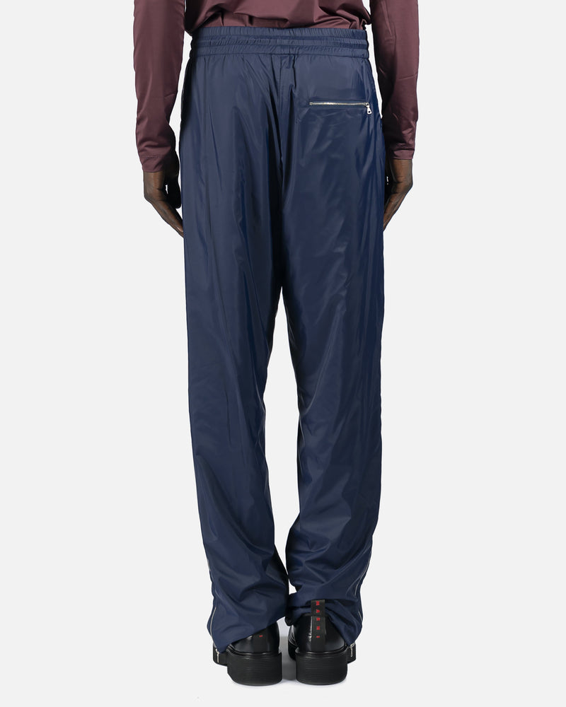 Nylon full length pants in navy. Elasticated drawstring waistband with silver-tone zippers at hem. Corresponding zippers found at side slash pockets and single back pocket.