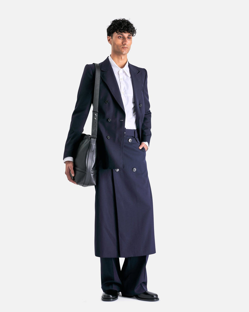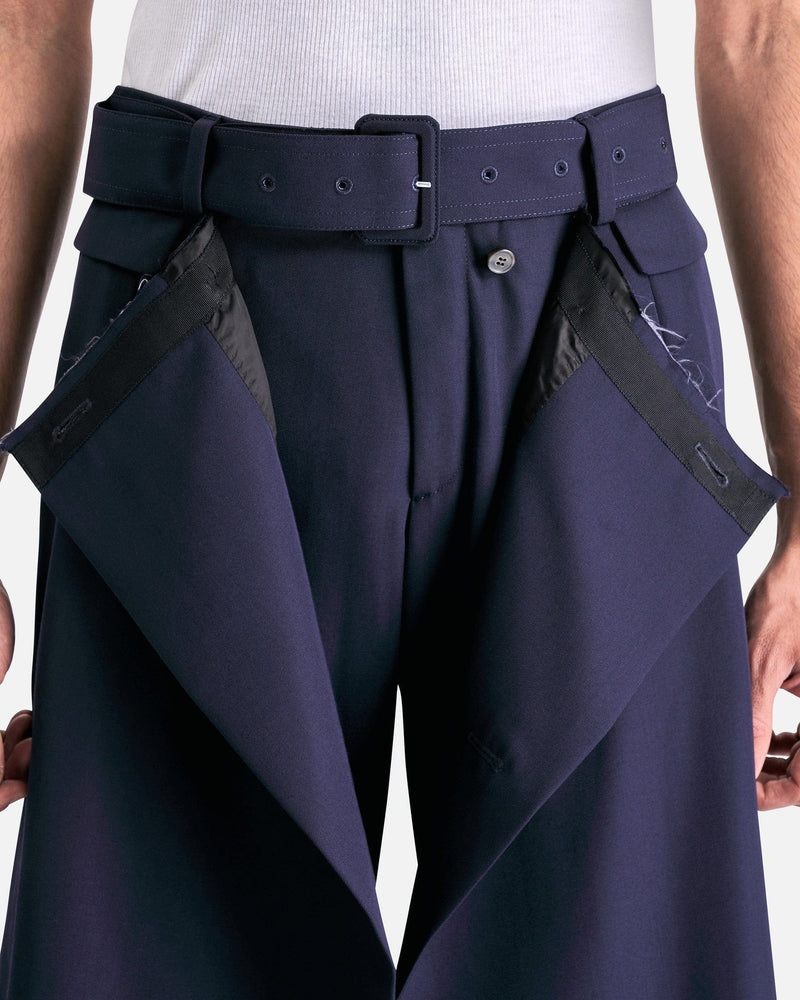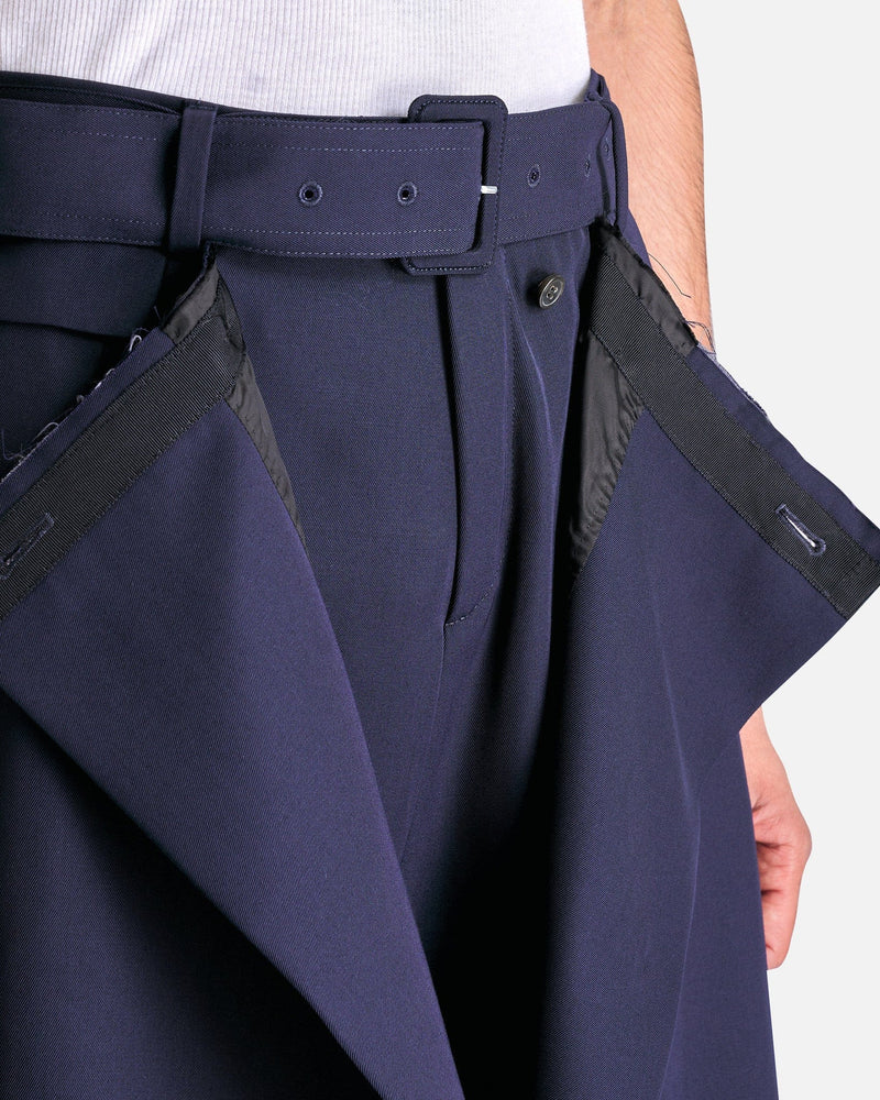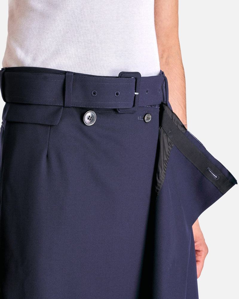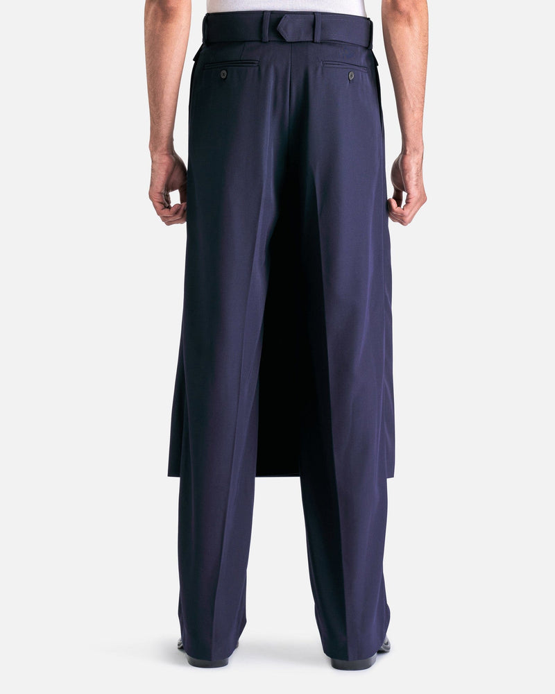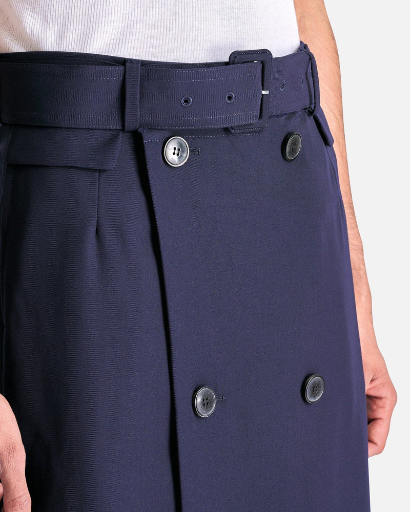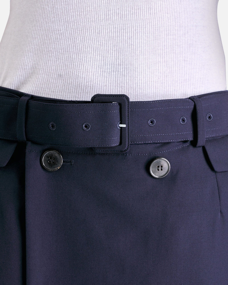 Dries Van Noten Priffith Pants in Navy. These pants feature a belted waist, layered buttoned wrap that is below knee length, zip fly and button closure, two back buttoned welt pockets and front pleats.