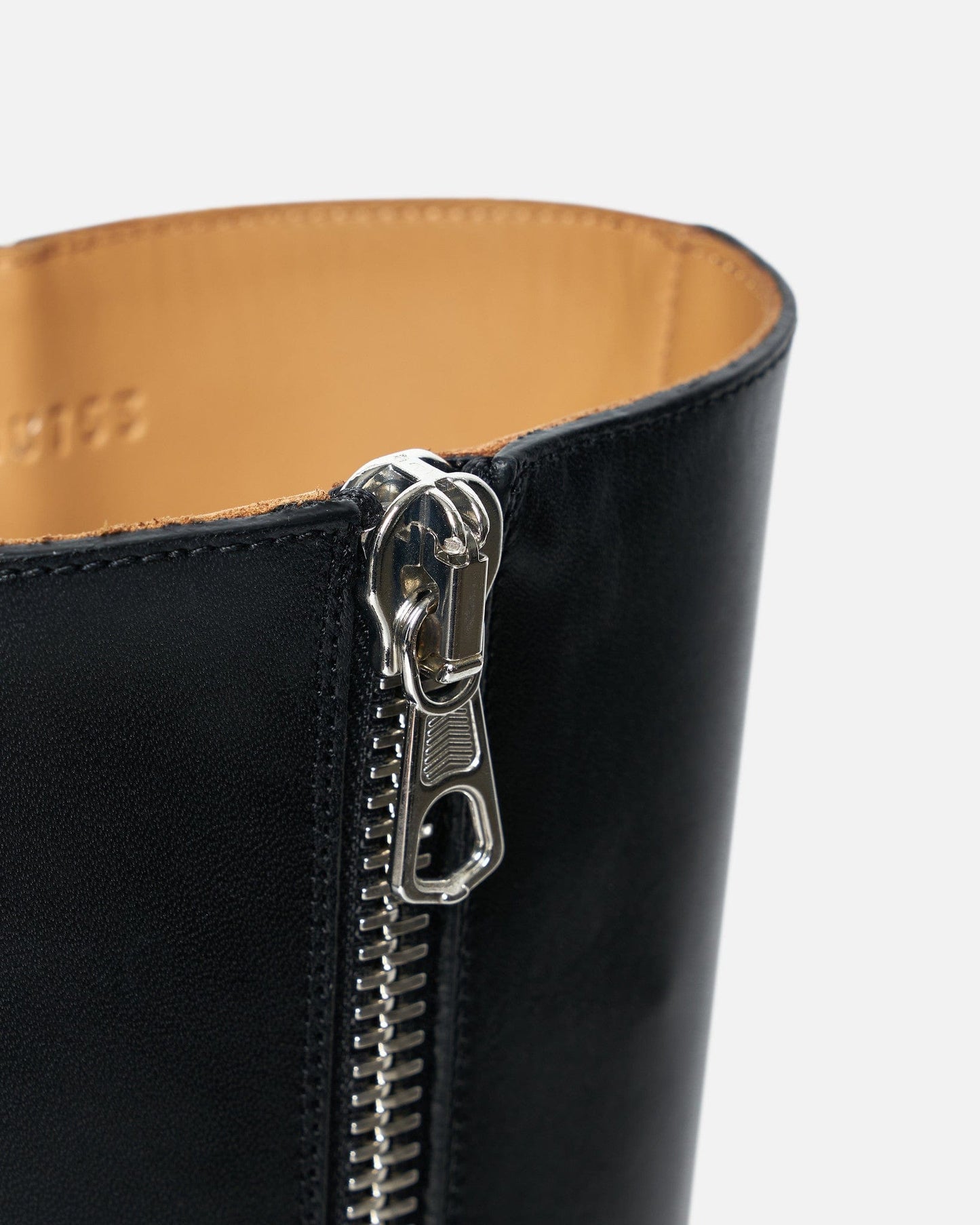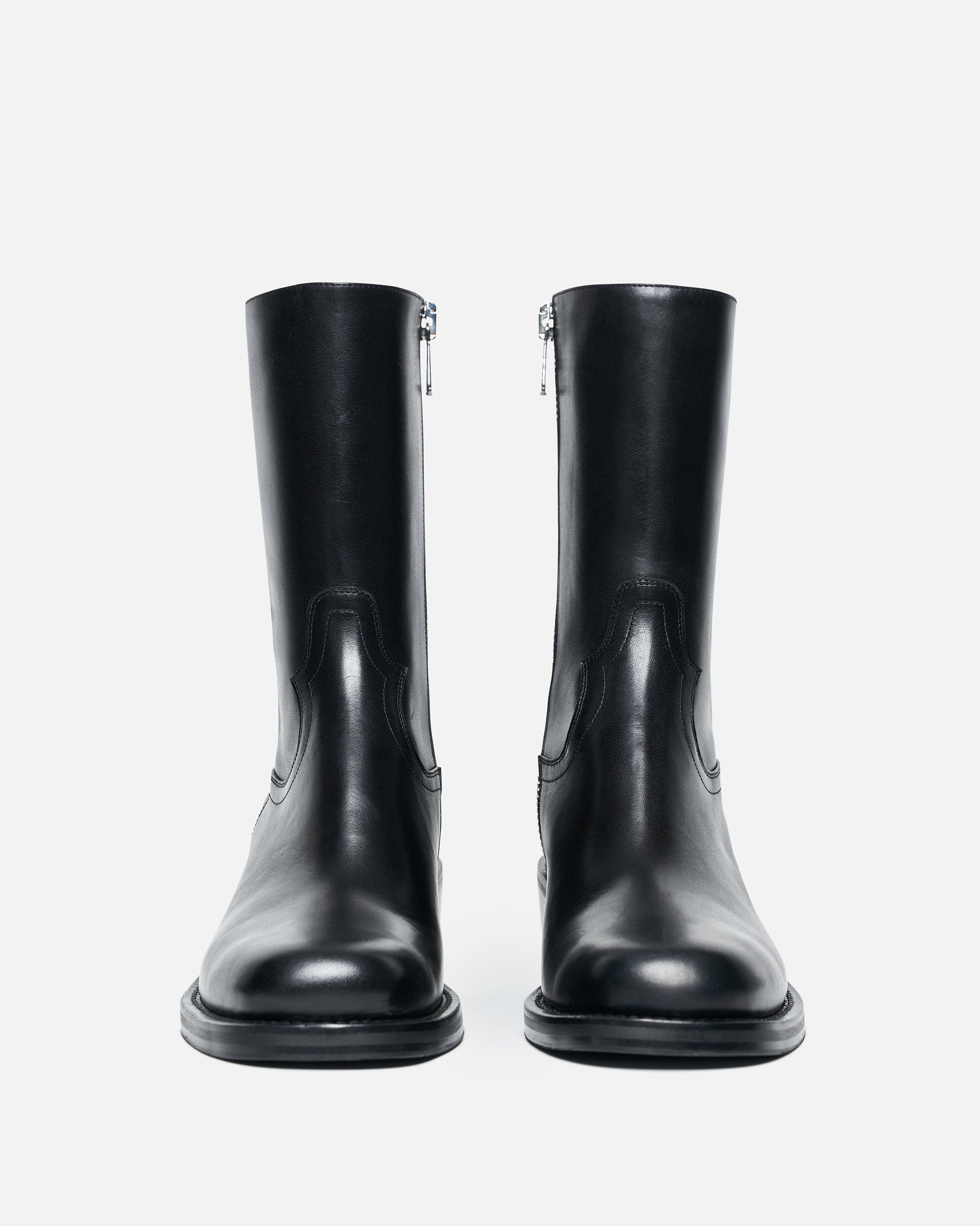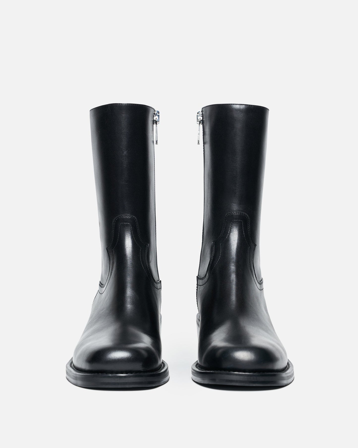 Dries Van Noten Square Toe Boots in Black. These boots are calf-high and feature paneled buffed leather. Side-zip metal closures located on the medial side of each boot and a stacked Cuban heel with rubber injection.