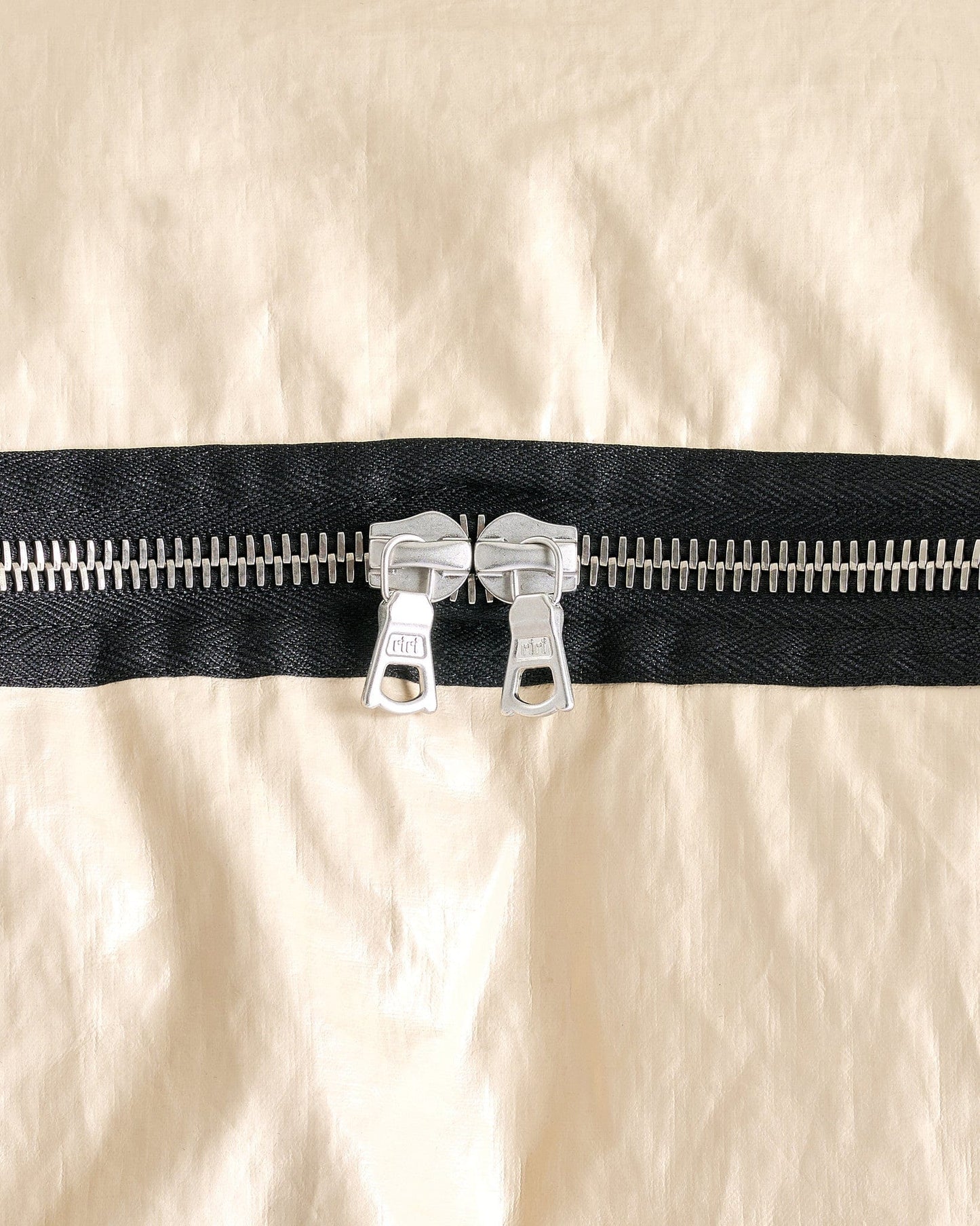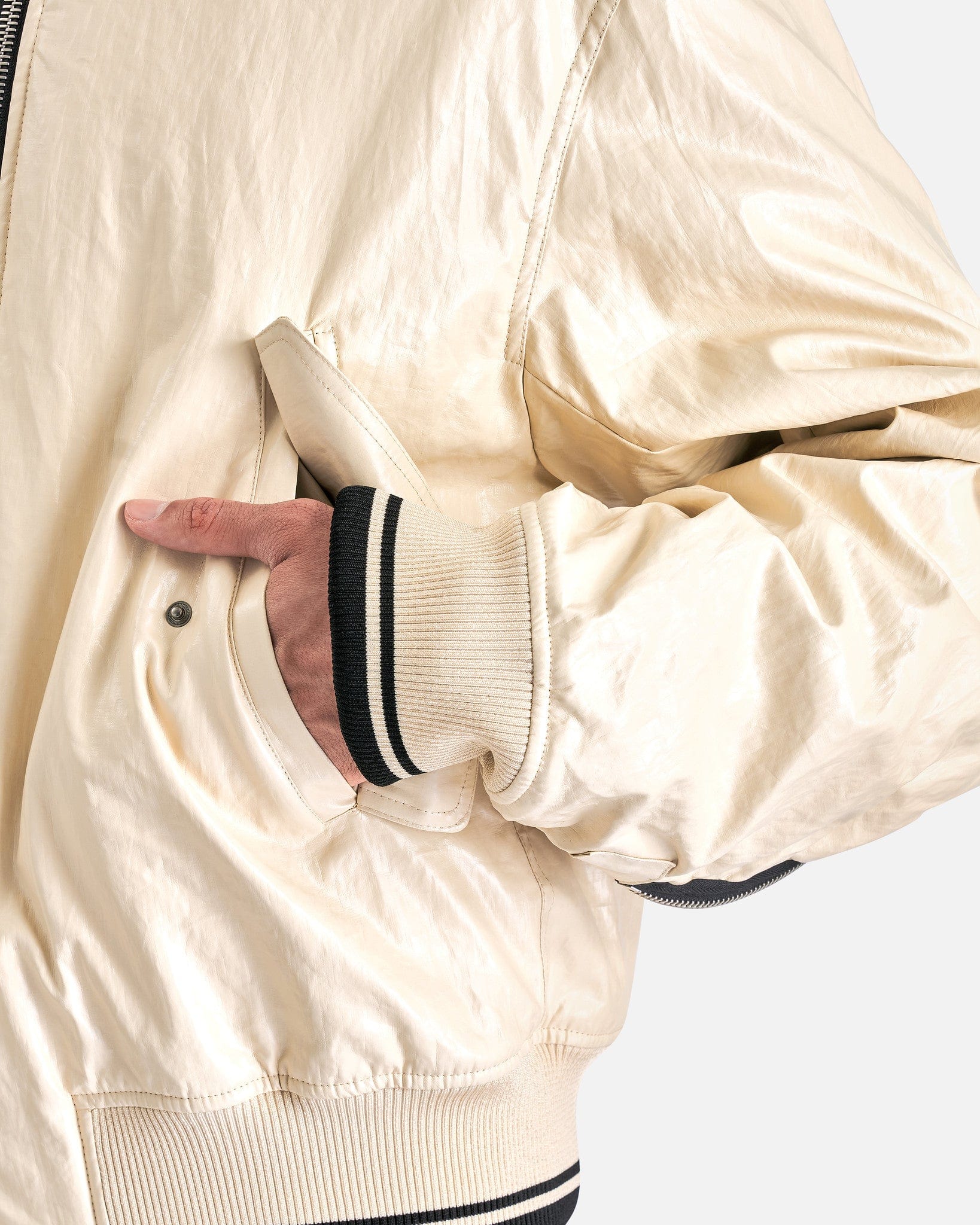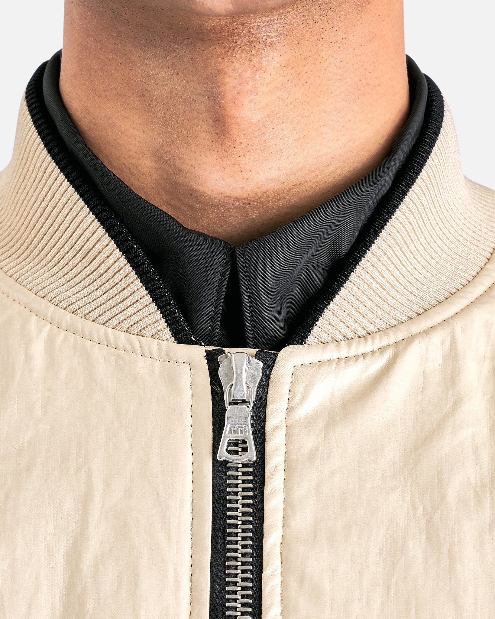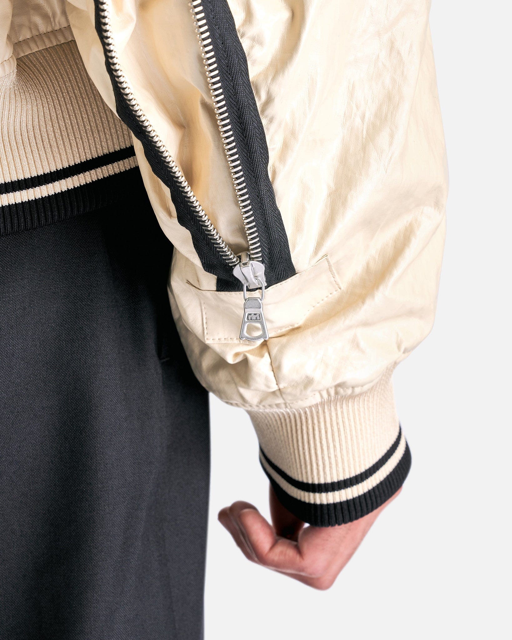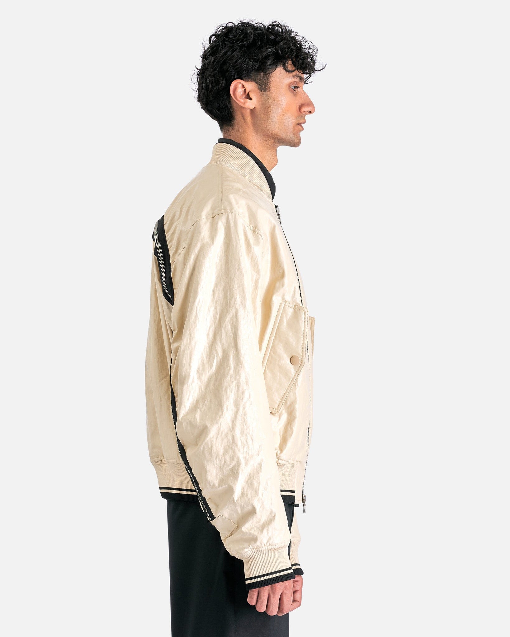 Dries Van Noten Vellom Jacket in Cream. This jacket features a zip closure, stand collar, two side flap pockets, zip detailing on the back and along the arms and elasticated cuffs and hem.