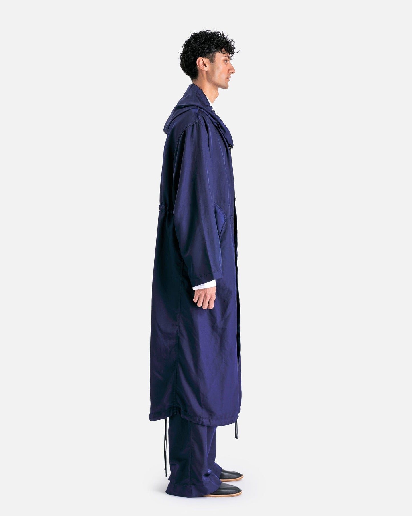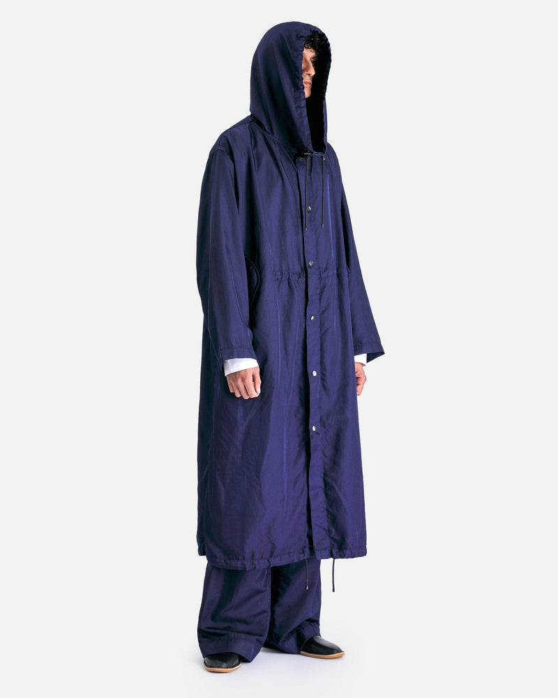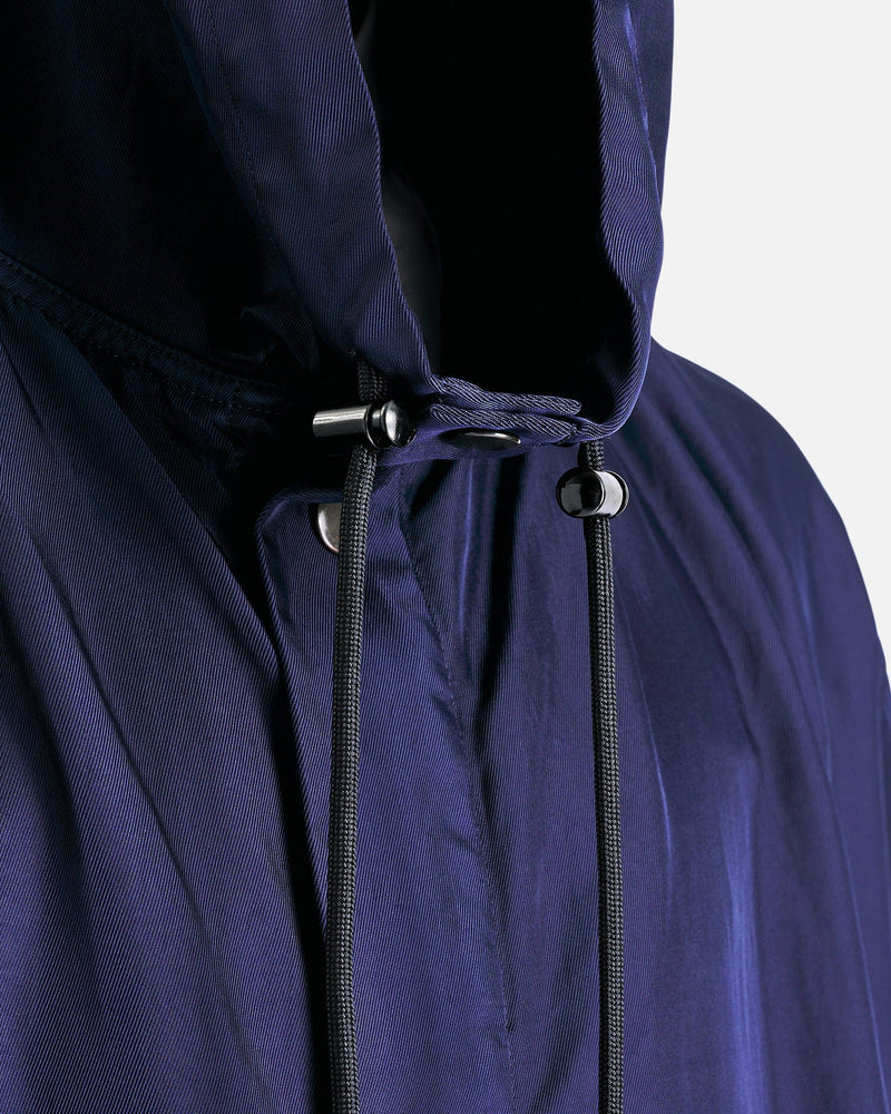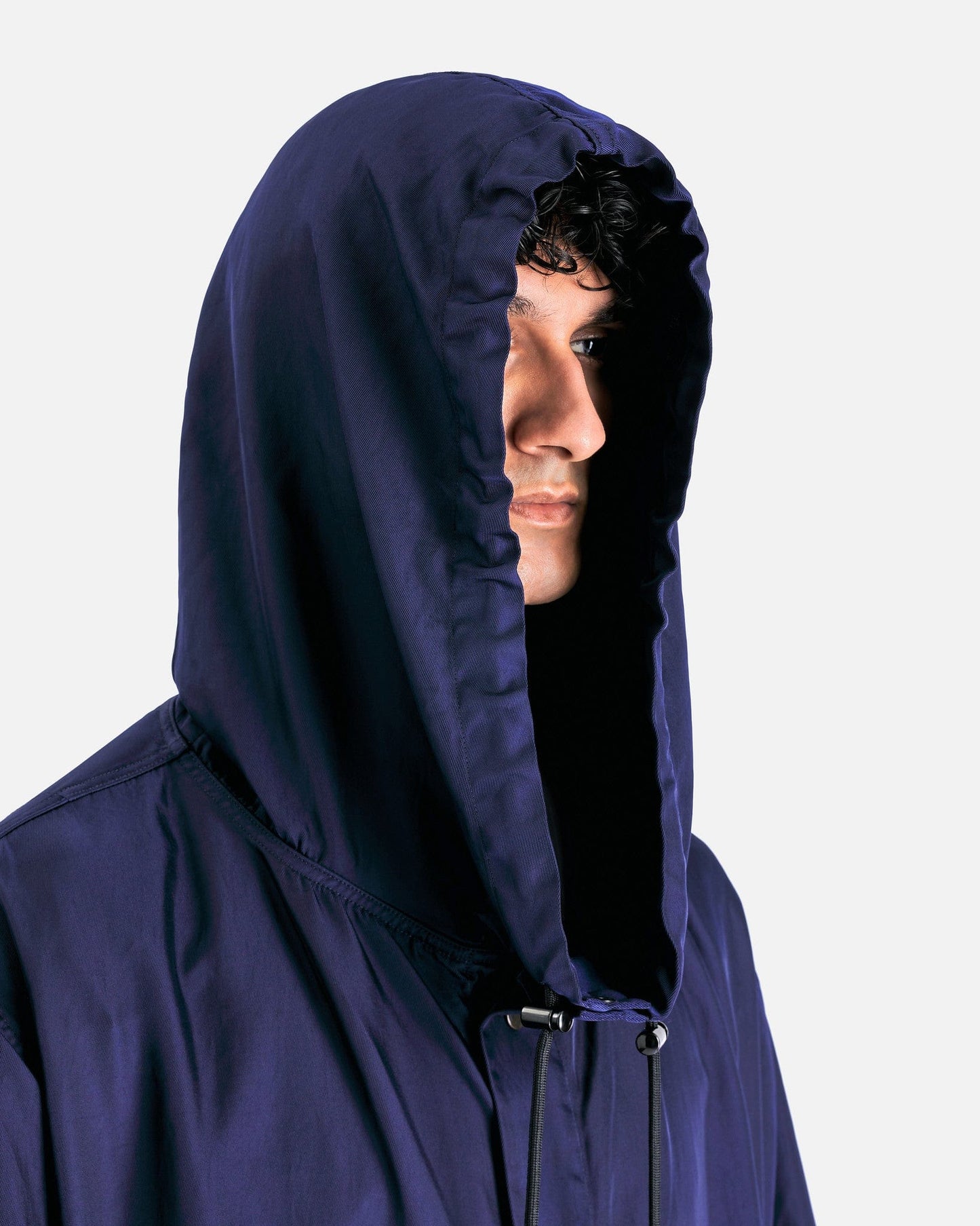 Dries Van Noten Voxbury Jacket in Blue. This jacket features a snap button closure, hood with drawstring, flared cuffs, front flap pockets and drawstrings at the waist and hem.