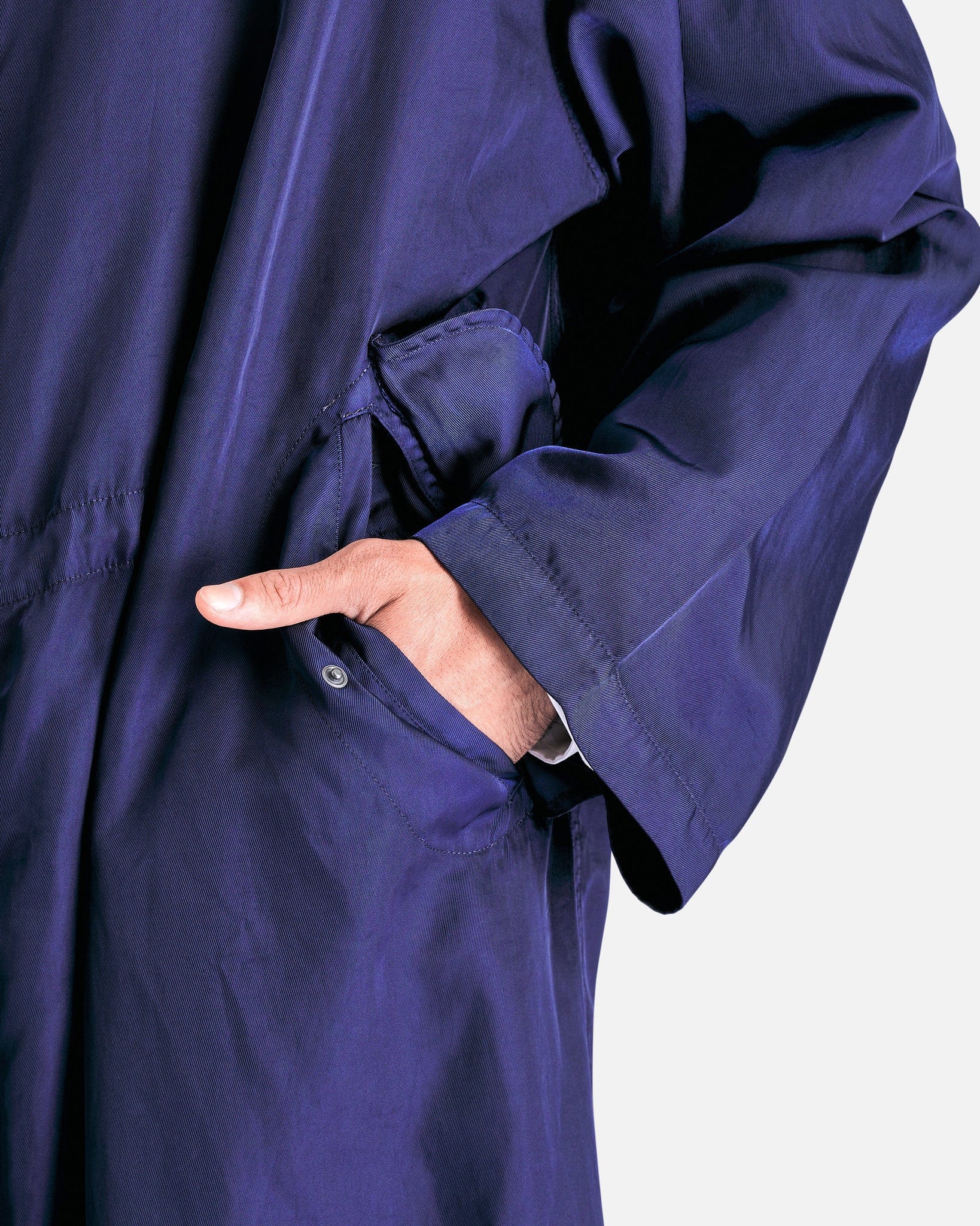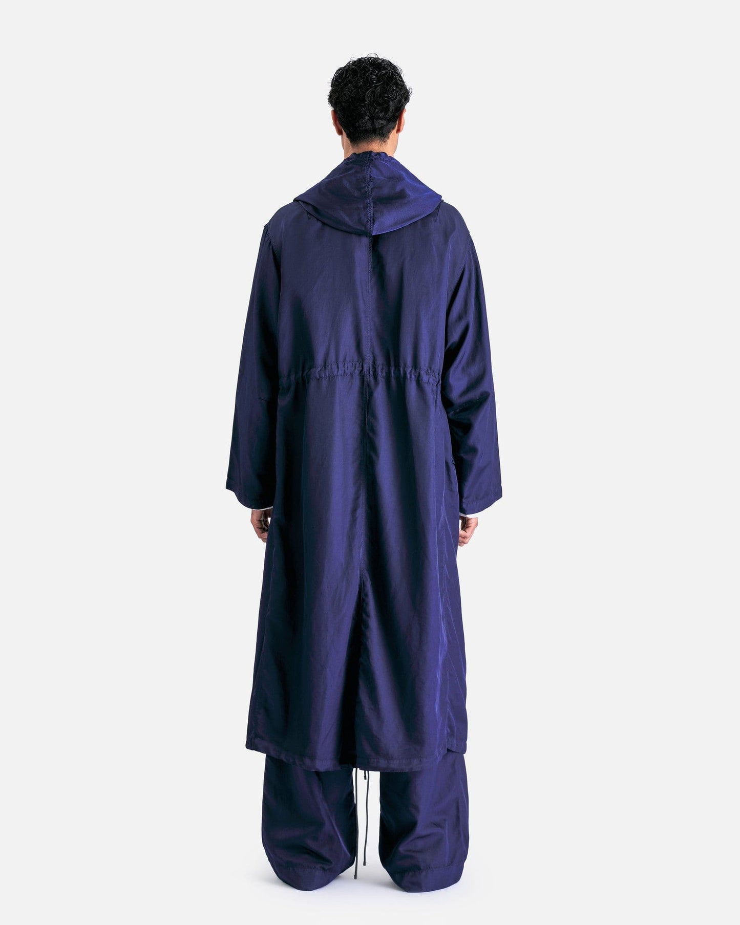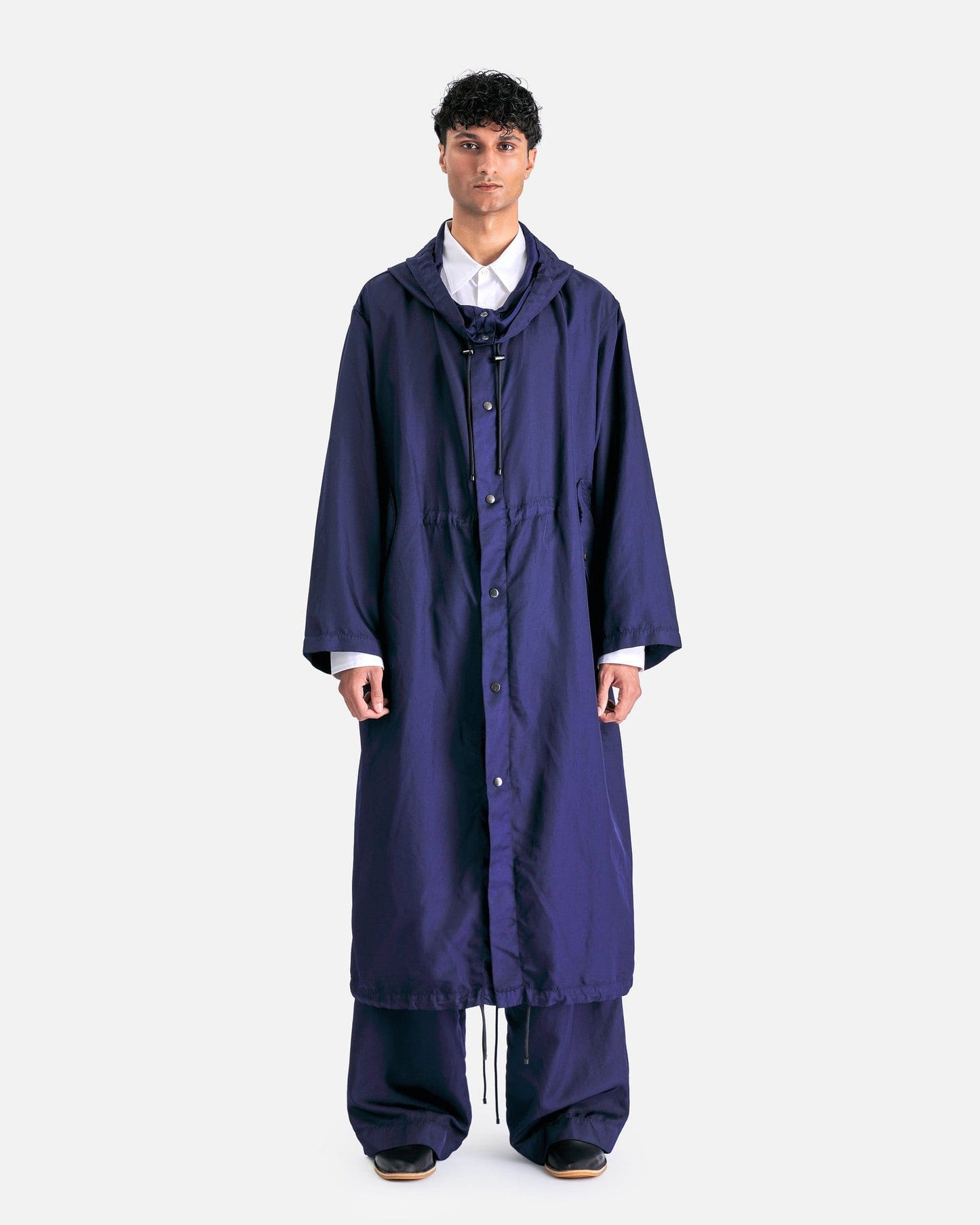 Dries Van Noten Voxbury Jacket in Blue. This jacket features a snap button closure, hood with drawstring, flared cuffs, front flap pockets and drawstrings at the waist and hem.