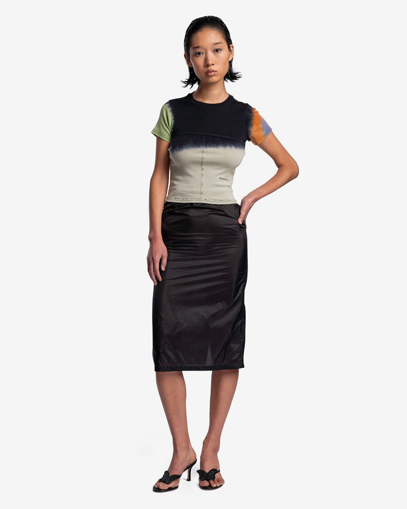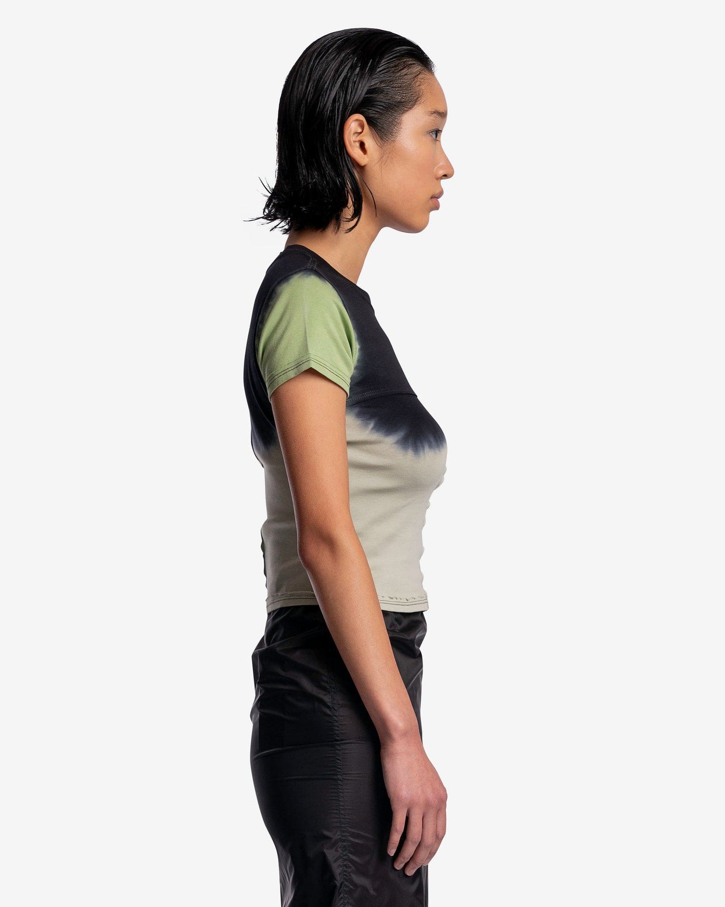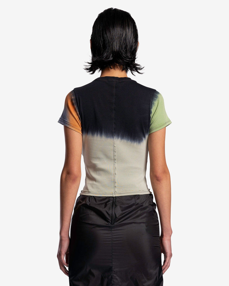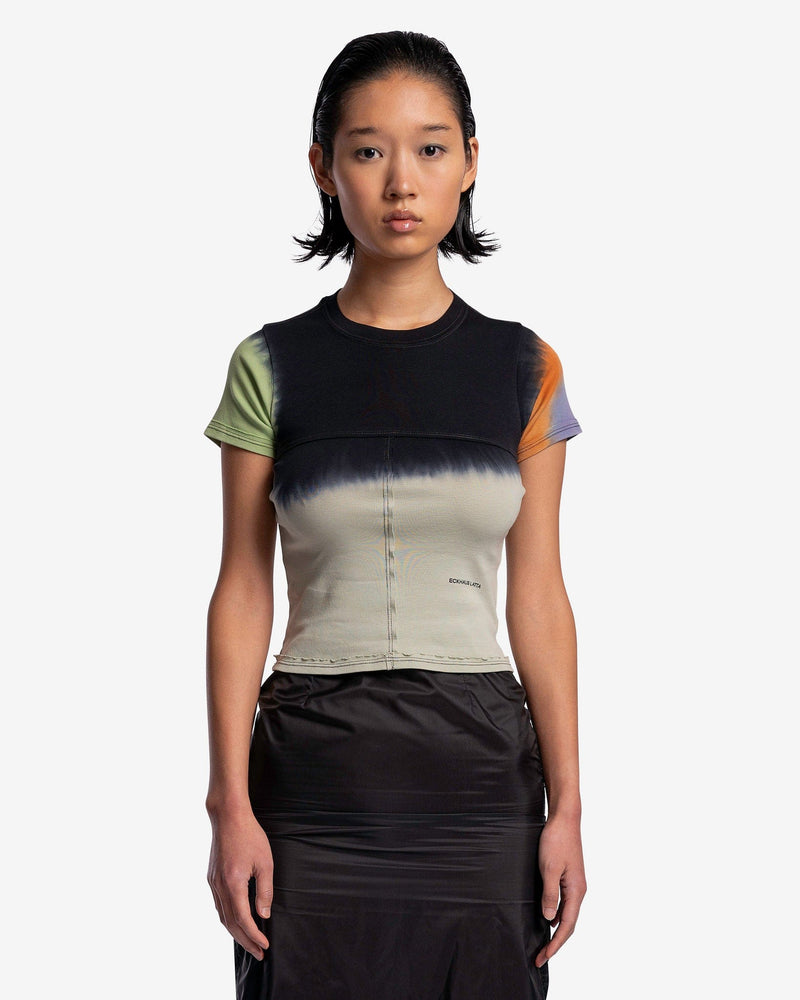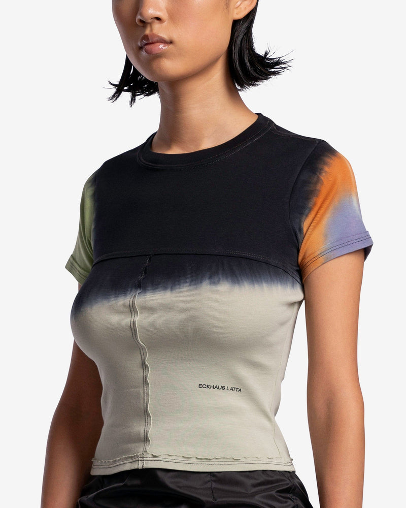 Eckhaus Latta women's short sleeve t-shirt in multicolor. This top is created from multiple lapped panels with raw edged seams throughout and has a tie-dyed pattern along the top half.
