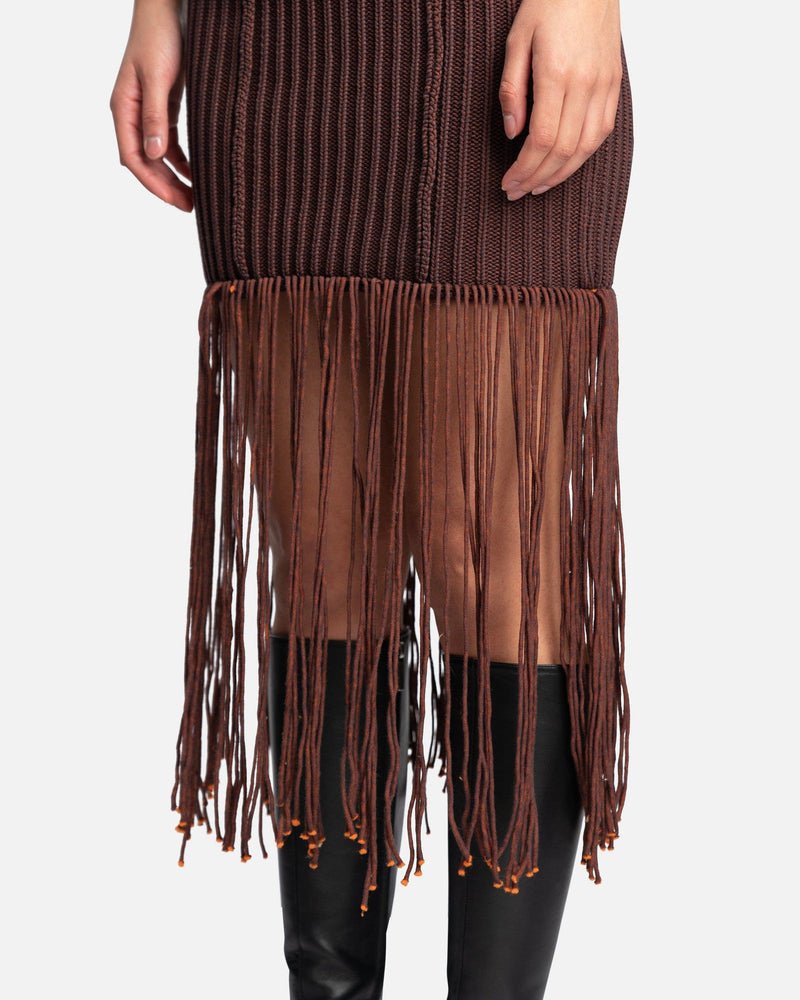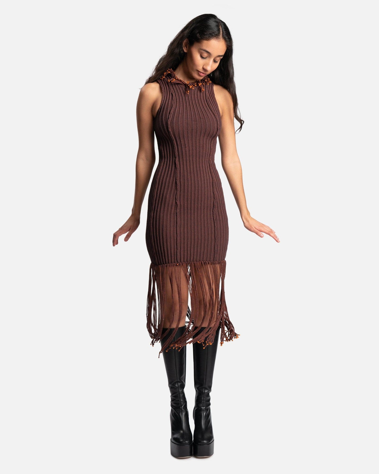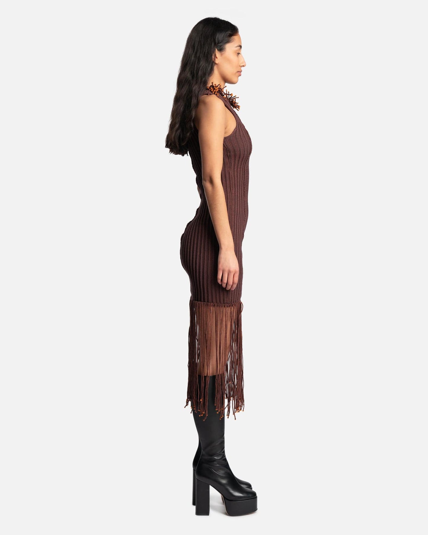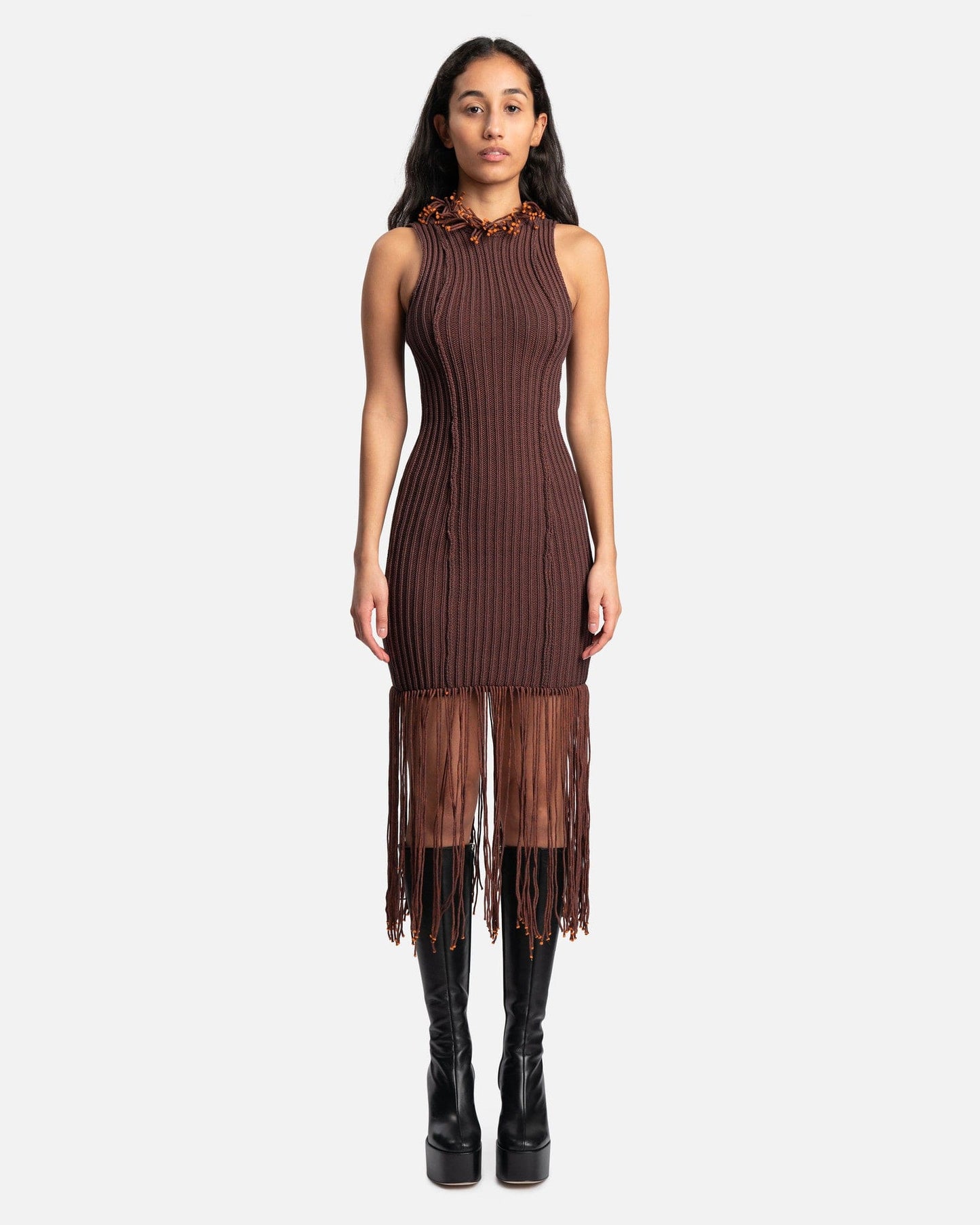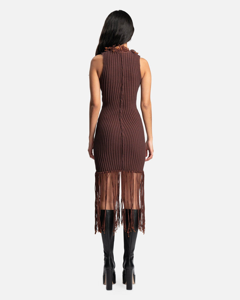 Eckhaus Latta women's rib knit dress in brown. This sleeveless dress features a bodycon fit and fringe detailing on the neck and hem.