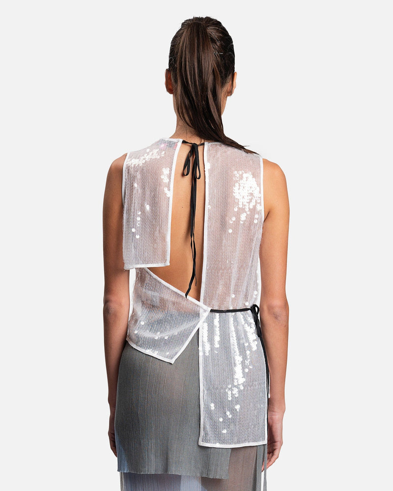 Eckhaus Latta women's sequin tie top in white. This sheer, sleeveless top features allover sequins and tie closure at the back and waist.