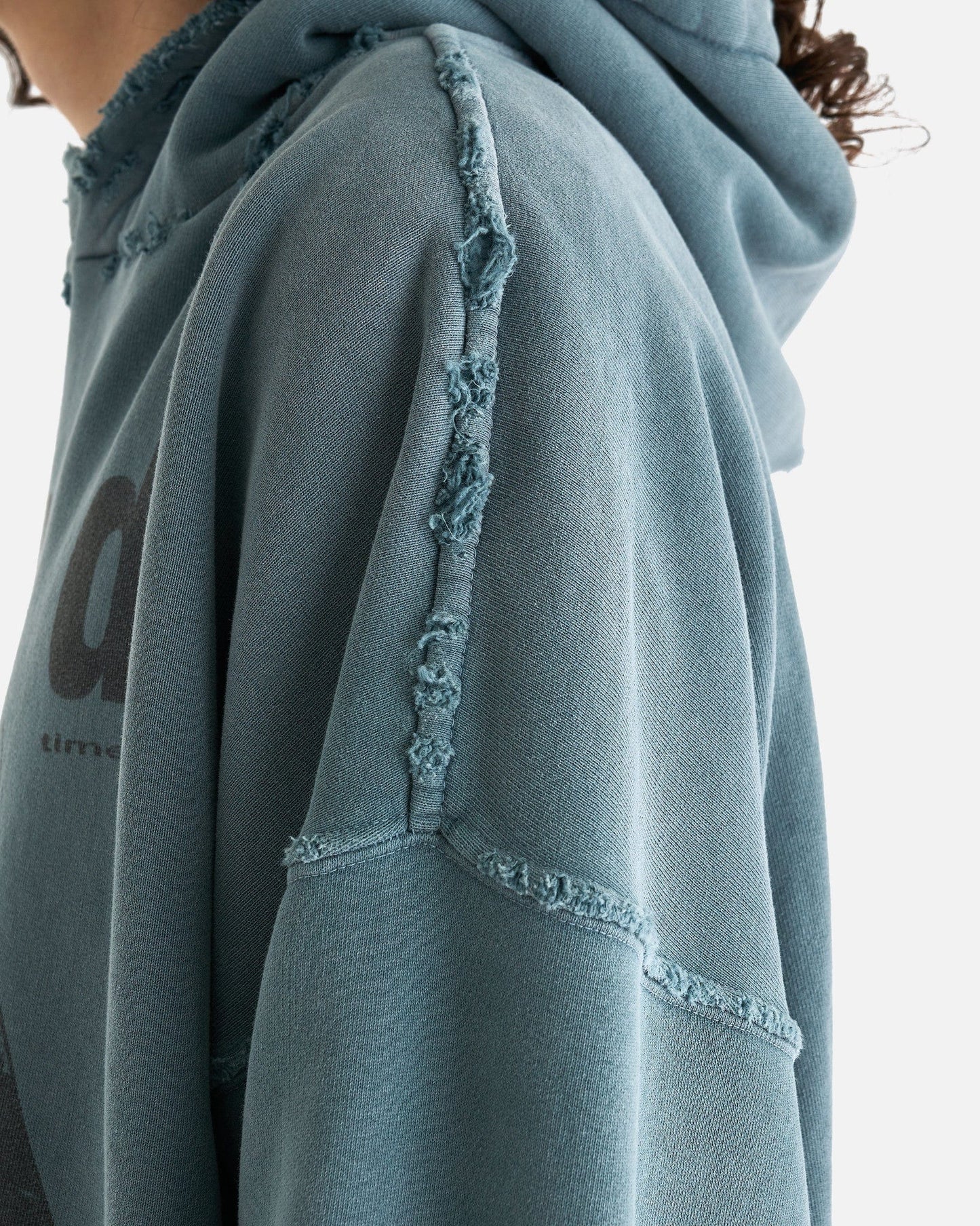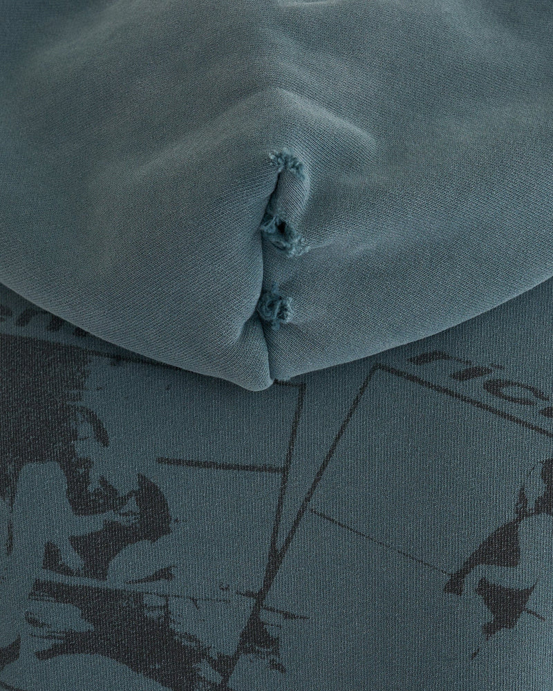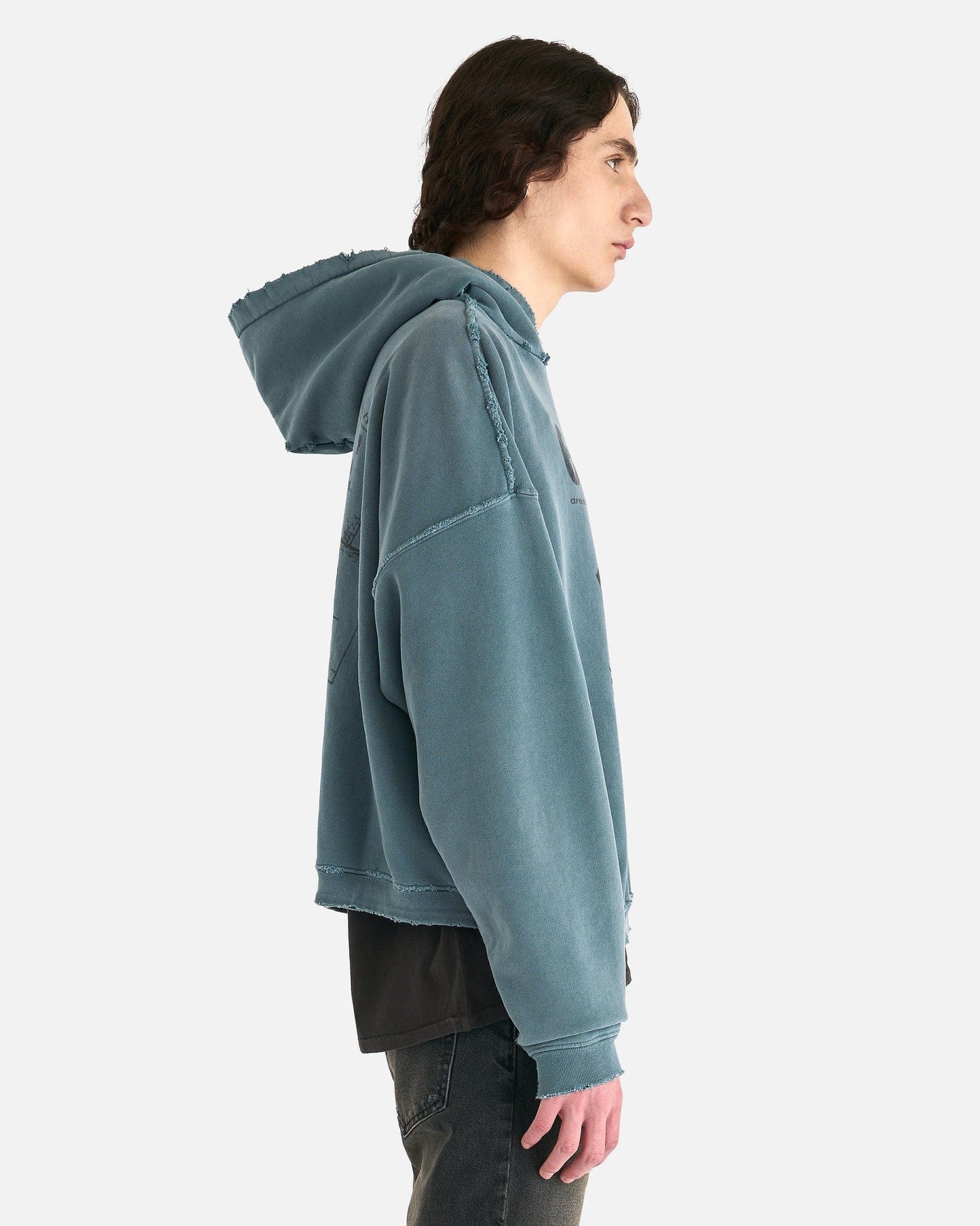 Enfants Riches Deprimes men's School-Days Hoodie in Faded Light Blue/ Black. This hoodie features a heavy weight brushed french terry construction, drop shoulder, a boxy fit, printed graphic on the front and back, distressed detailing and rib knit cuffs and waistband.