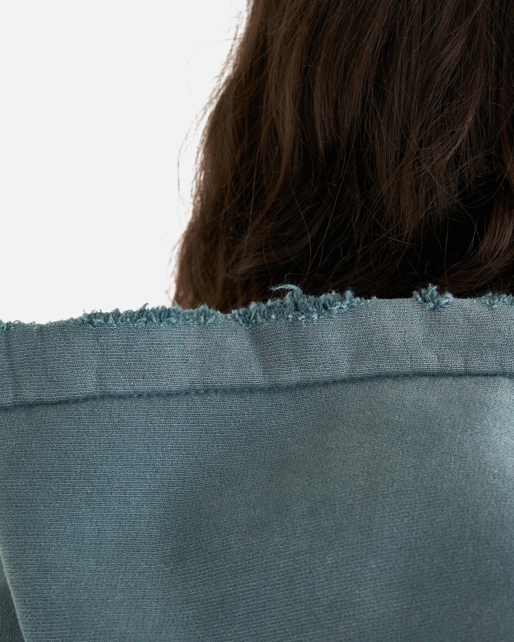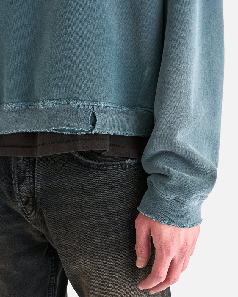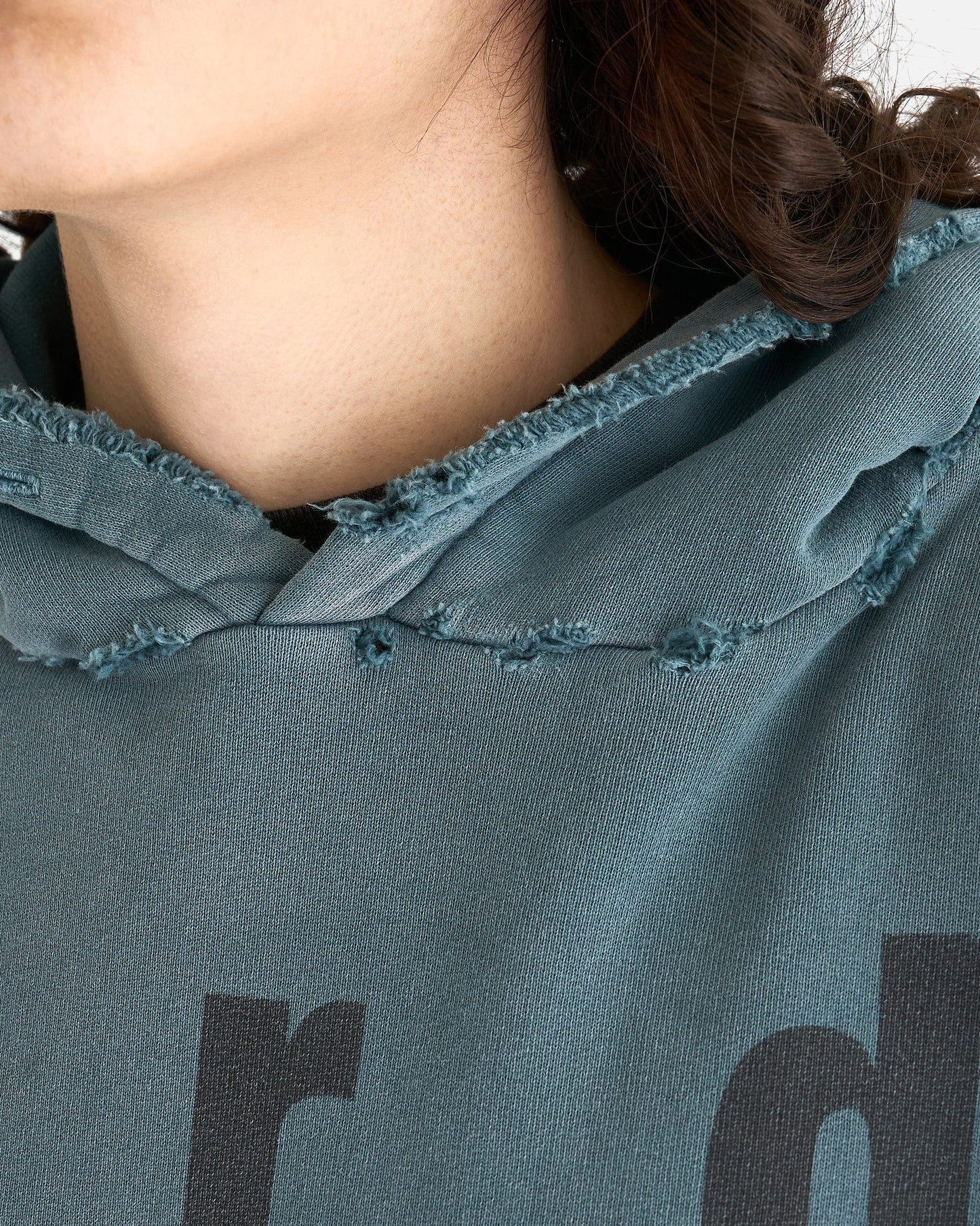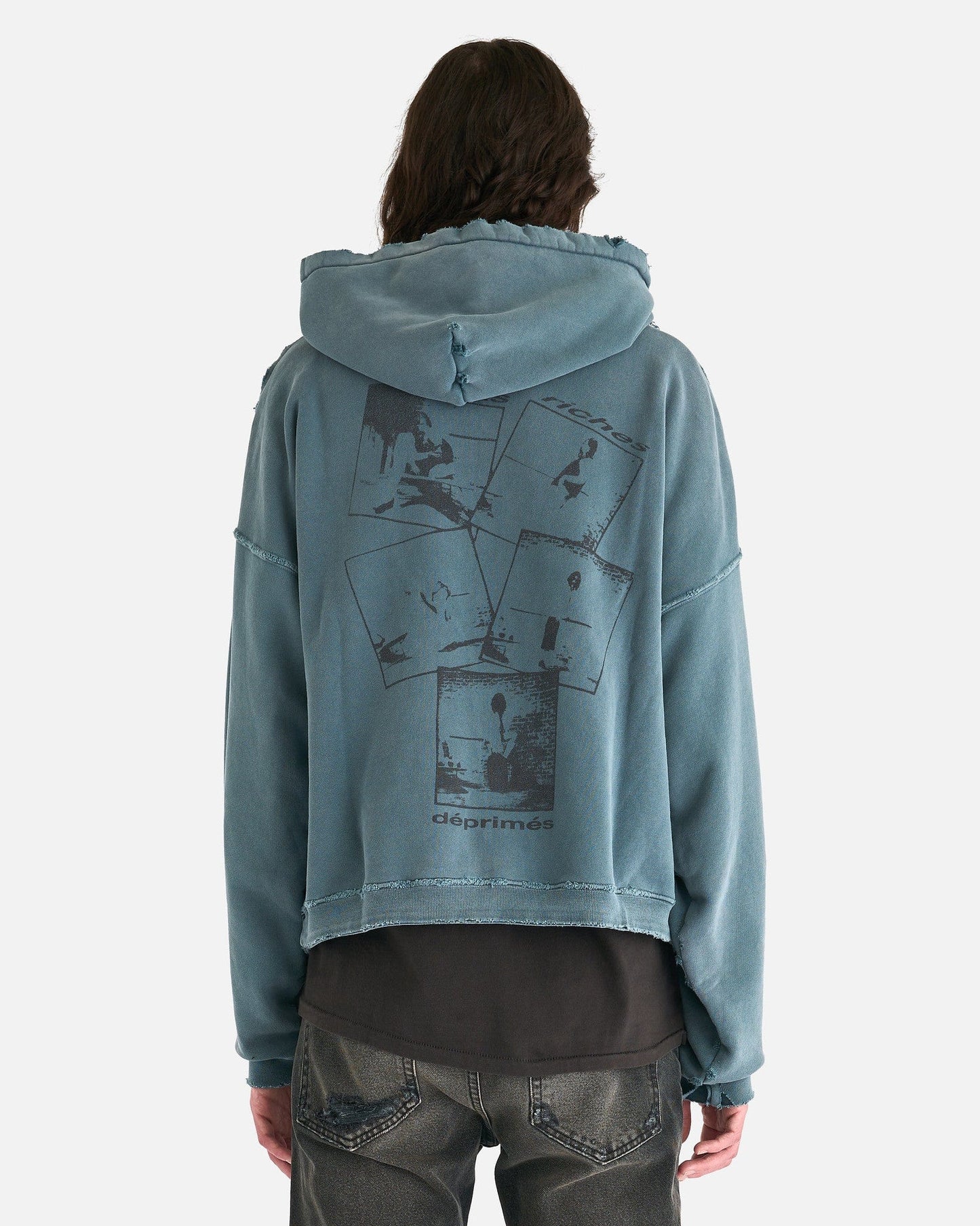 Enfants Riches Deprimes men's School-Days Hoodie in Faded Light Blue/ Black. This hoodie features a heavy weight brushed french terry construction, drop shoulder, a boxy fit, printed graphic on the front and back, distressed detailing and rib knit cuffs and waistband.